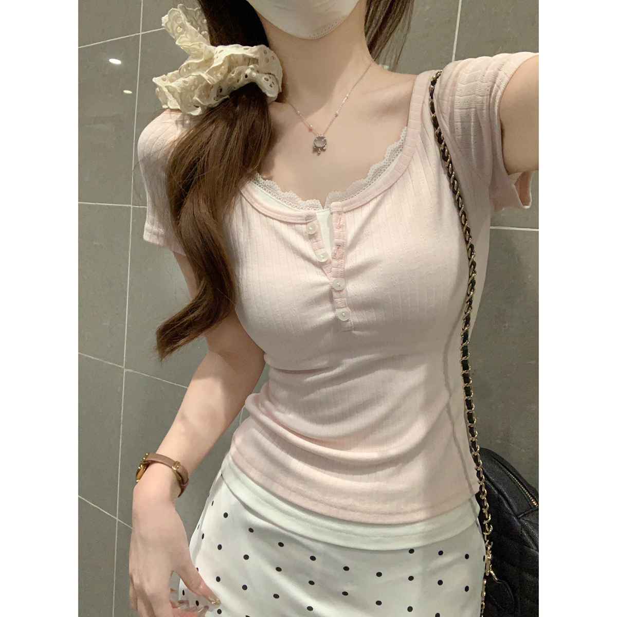 MY8239# 蕾丝/1*1精棉螺纹领/后包领小心机蕾丝镂空设计感T恤女女...