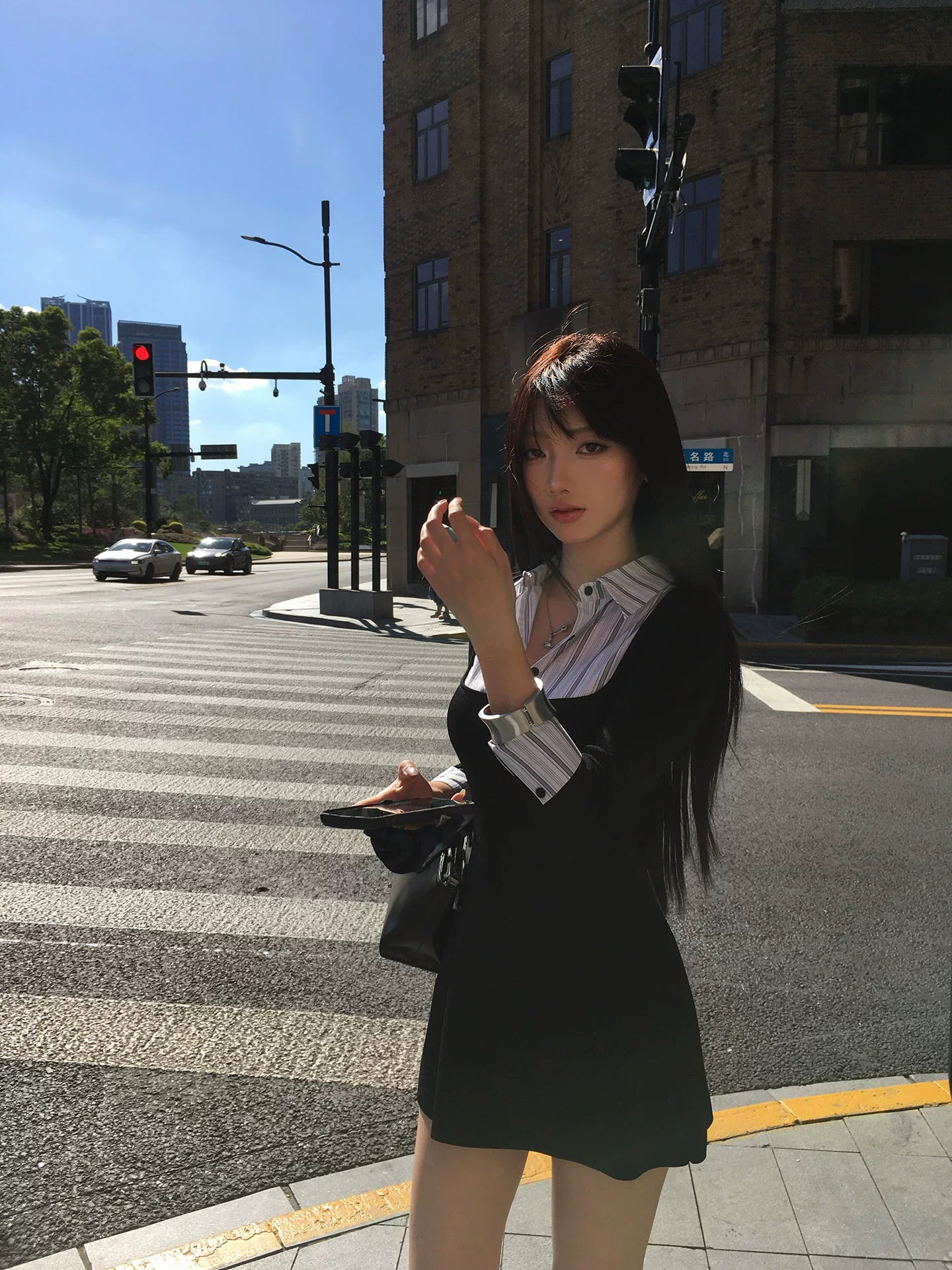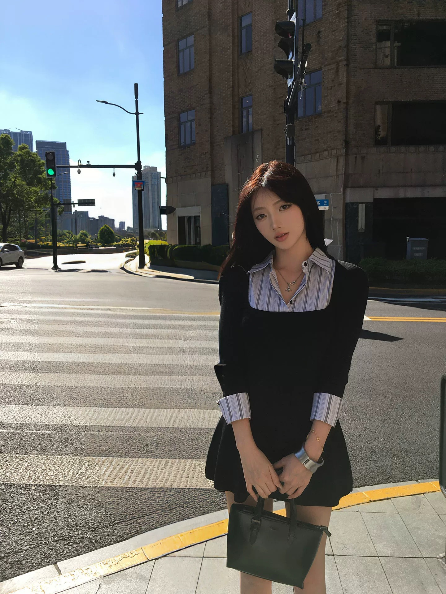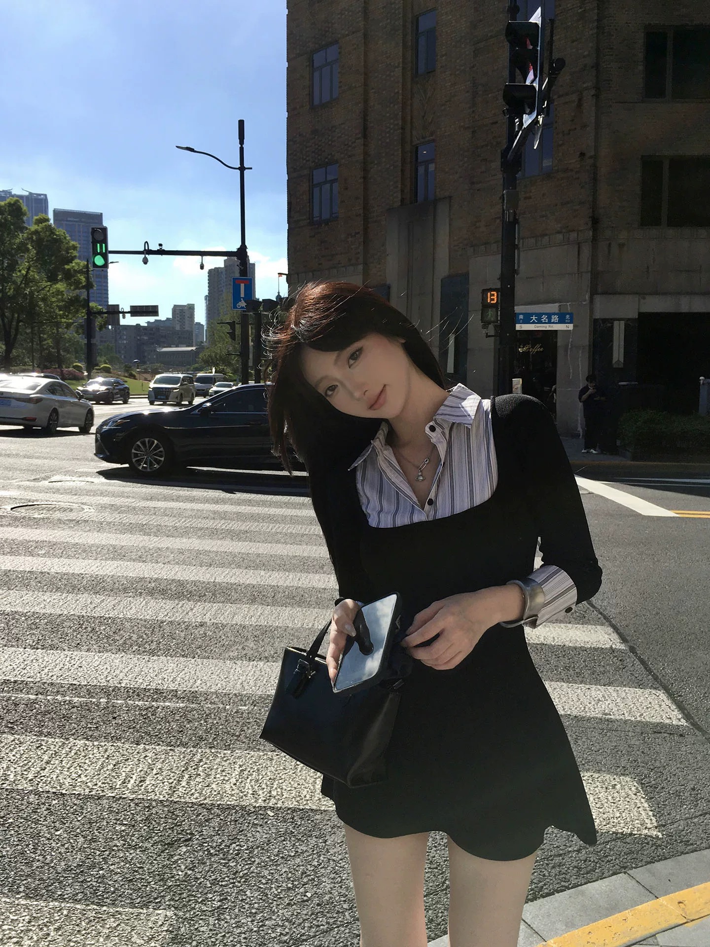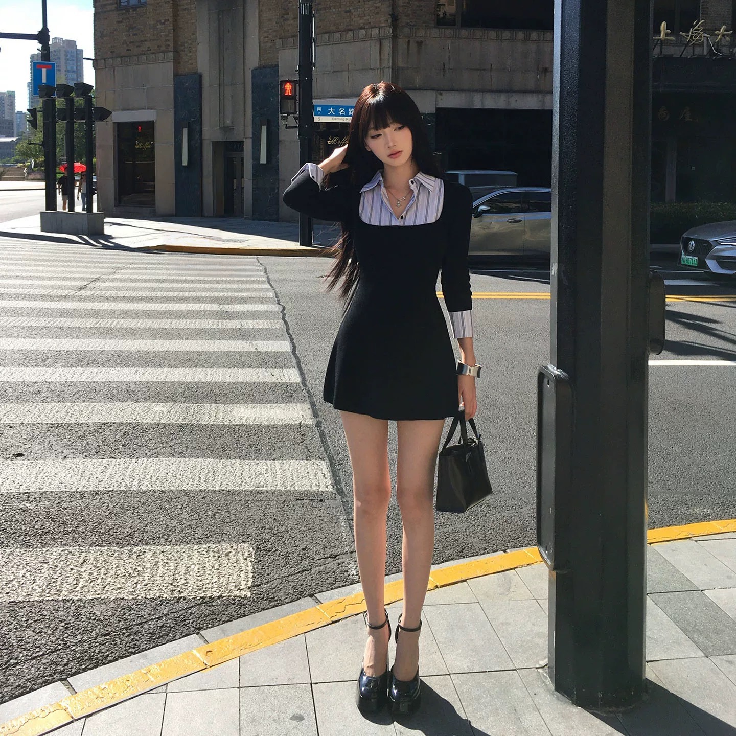 MY13576# 假两件拼接POLO领衬衫长袖连衣裙收腰针织包臀裙女裝貨源服裝批發