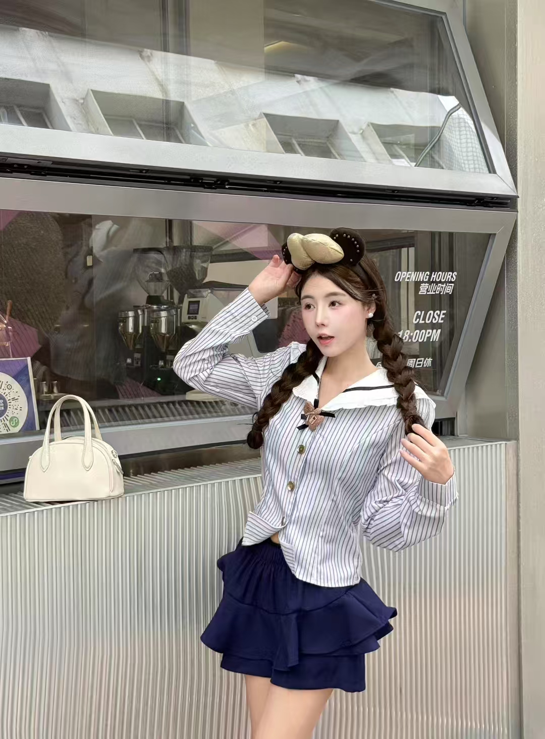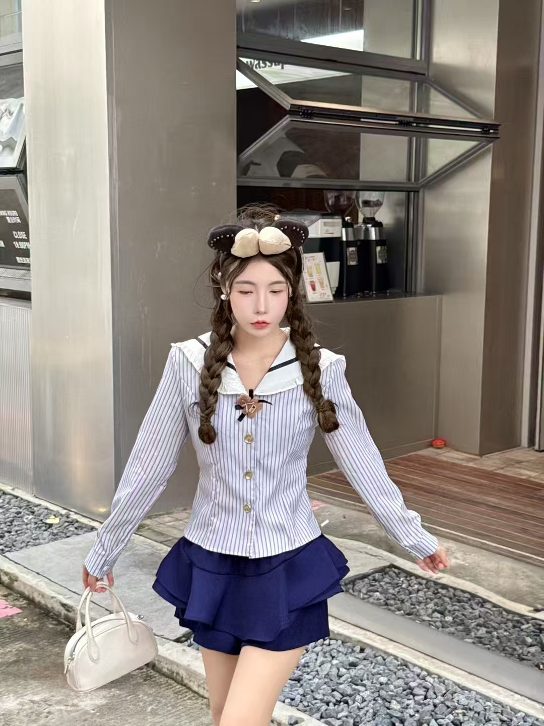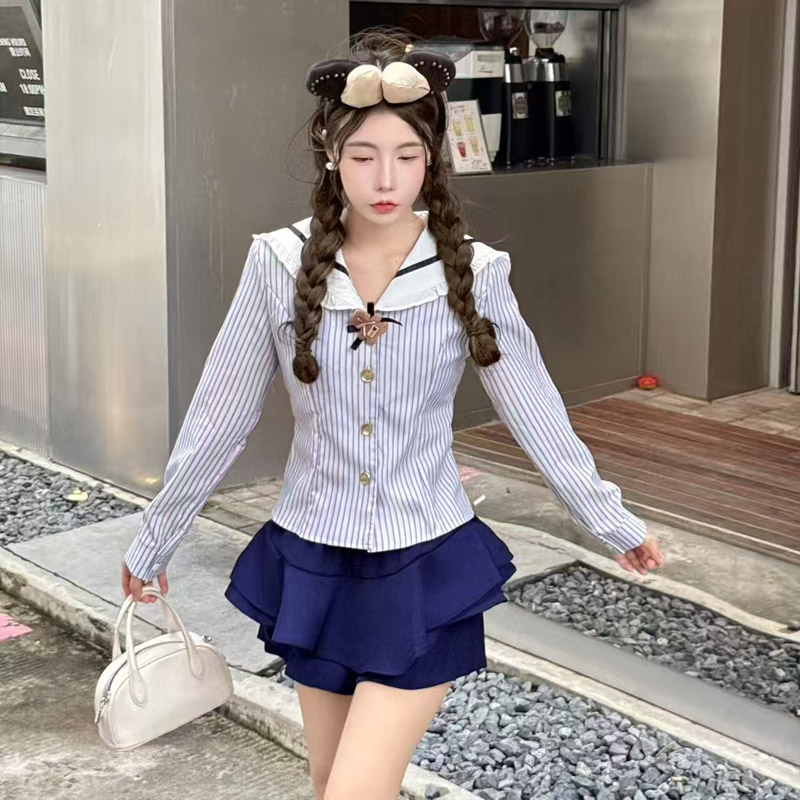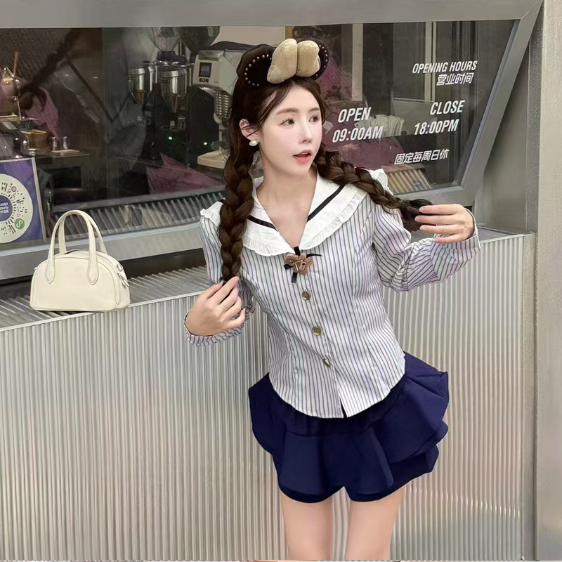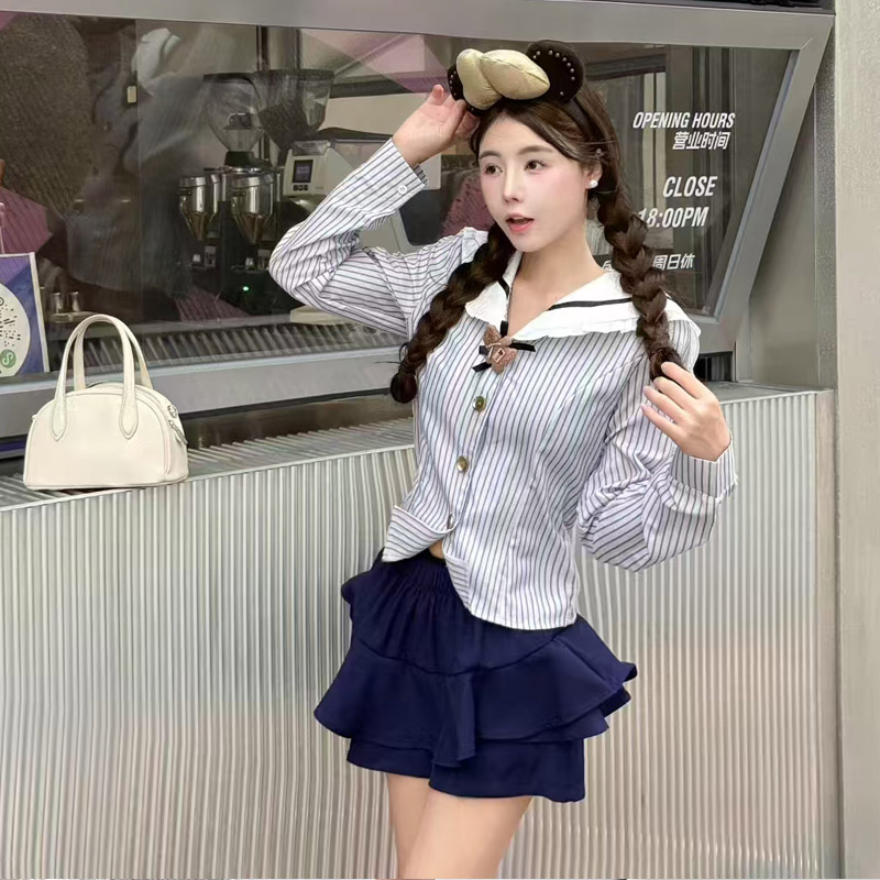 MY13581# POLO领气质修身衬衣+高腰短裙学院风辣妹套装女裝貨源服裝批發