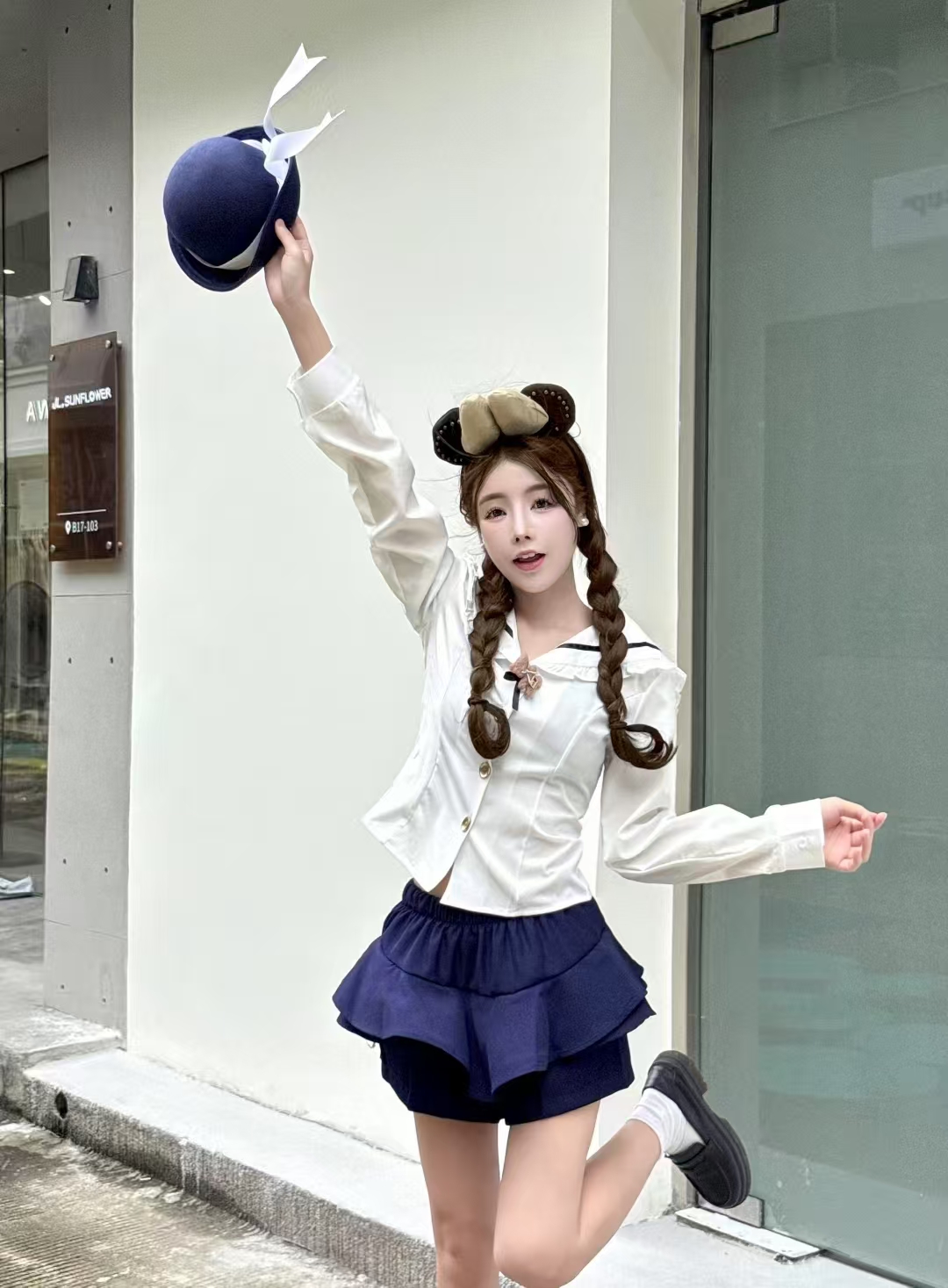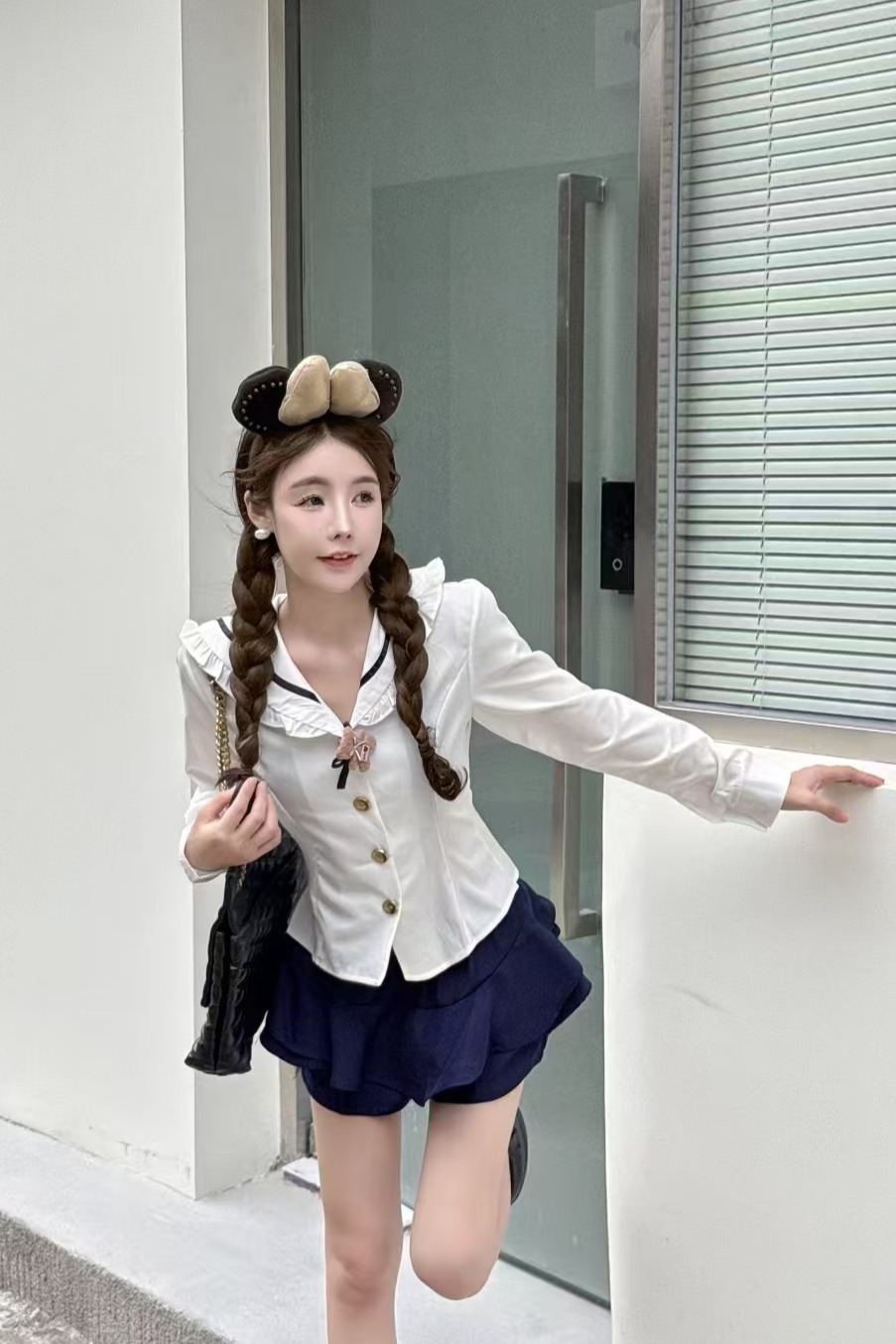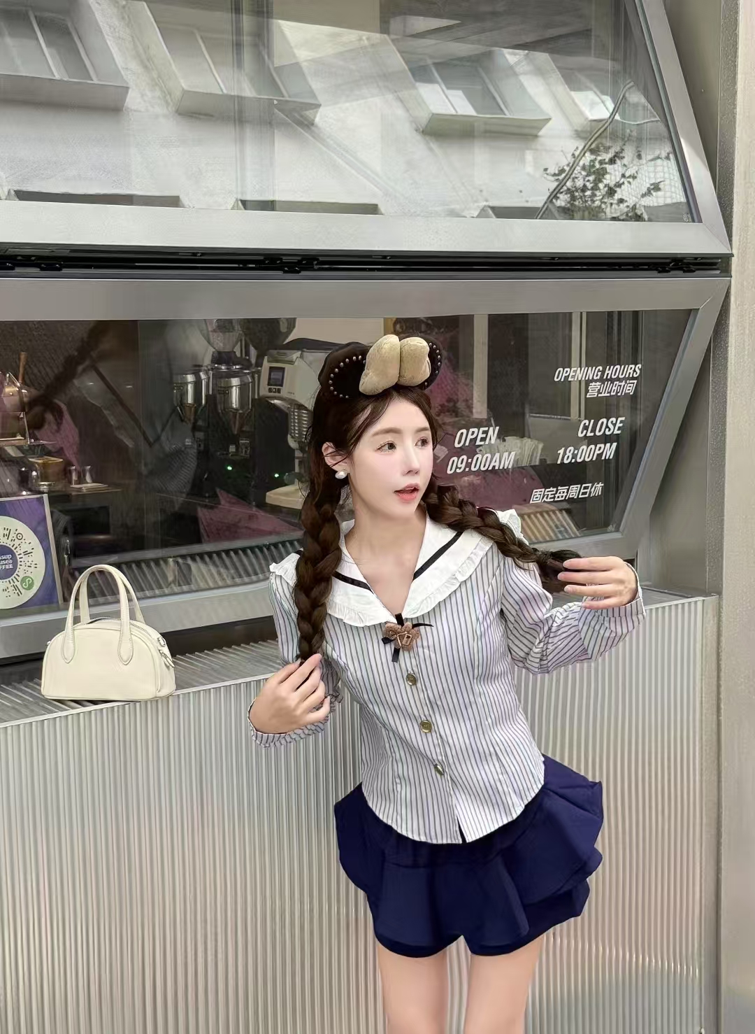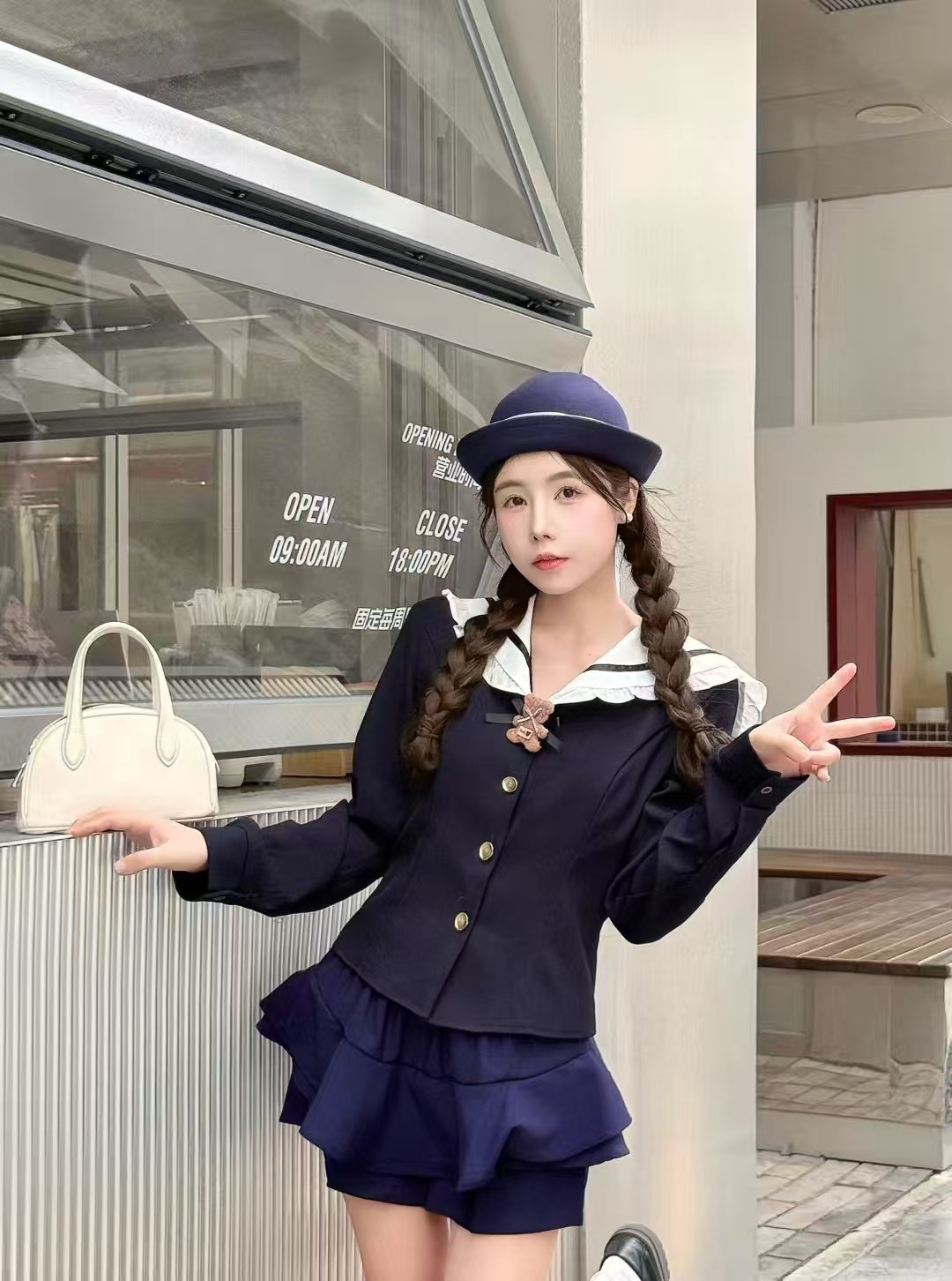 MY13581# POLO领气质修身衬衣+高腰短裙学院风辣妹套装女裝貨源服裝批發