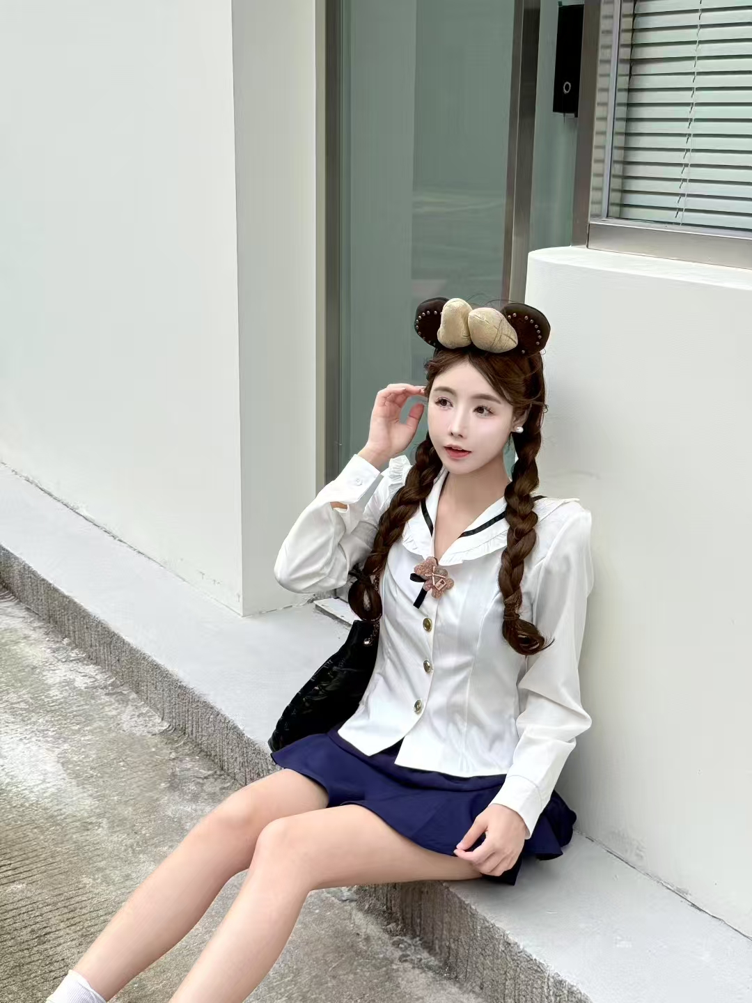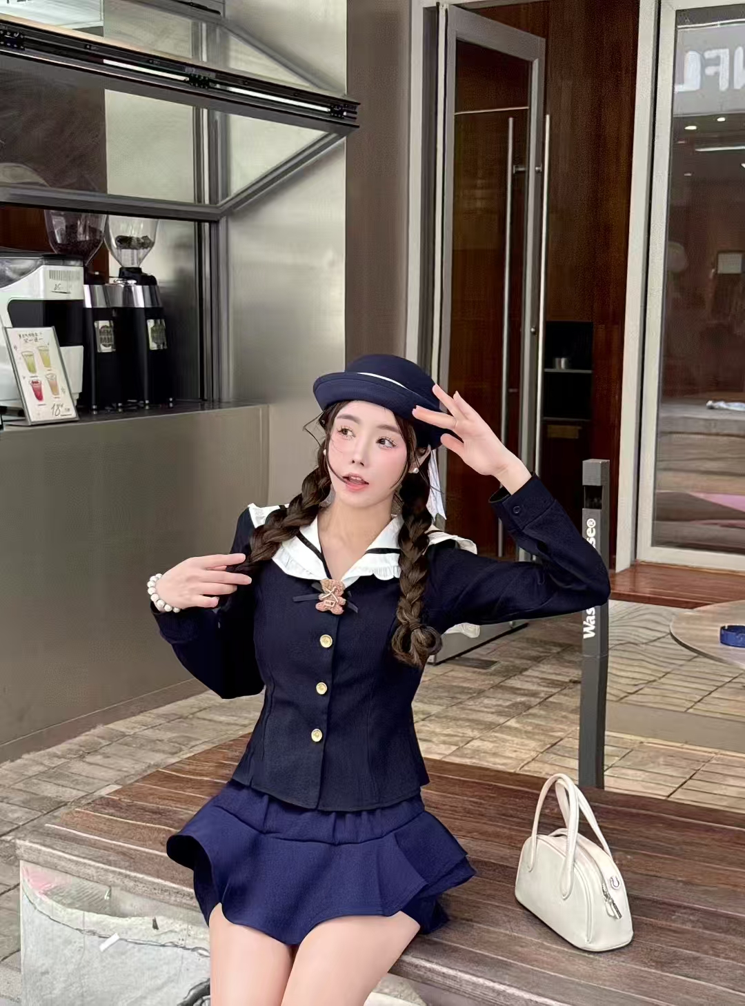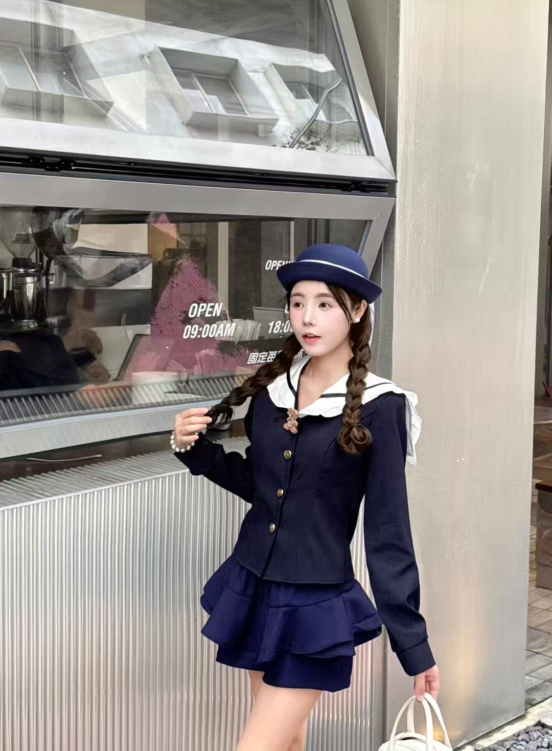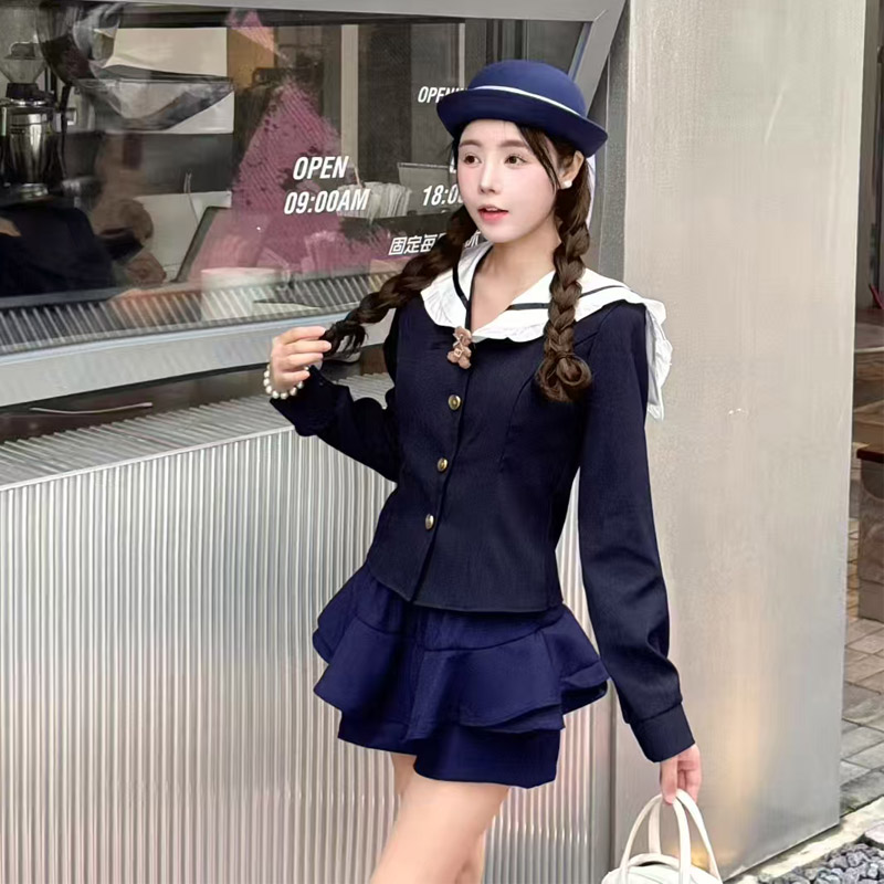 MY13581# POLO领气质修身衬衣+高腰短裙学院风辣妹套装女裝貨源服裝批發
