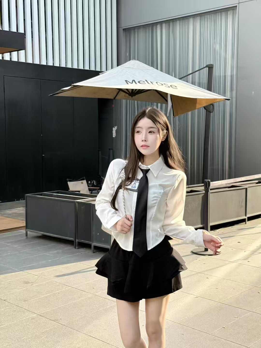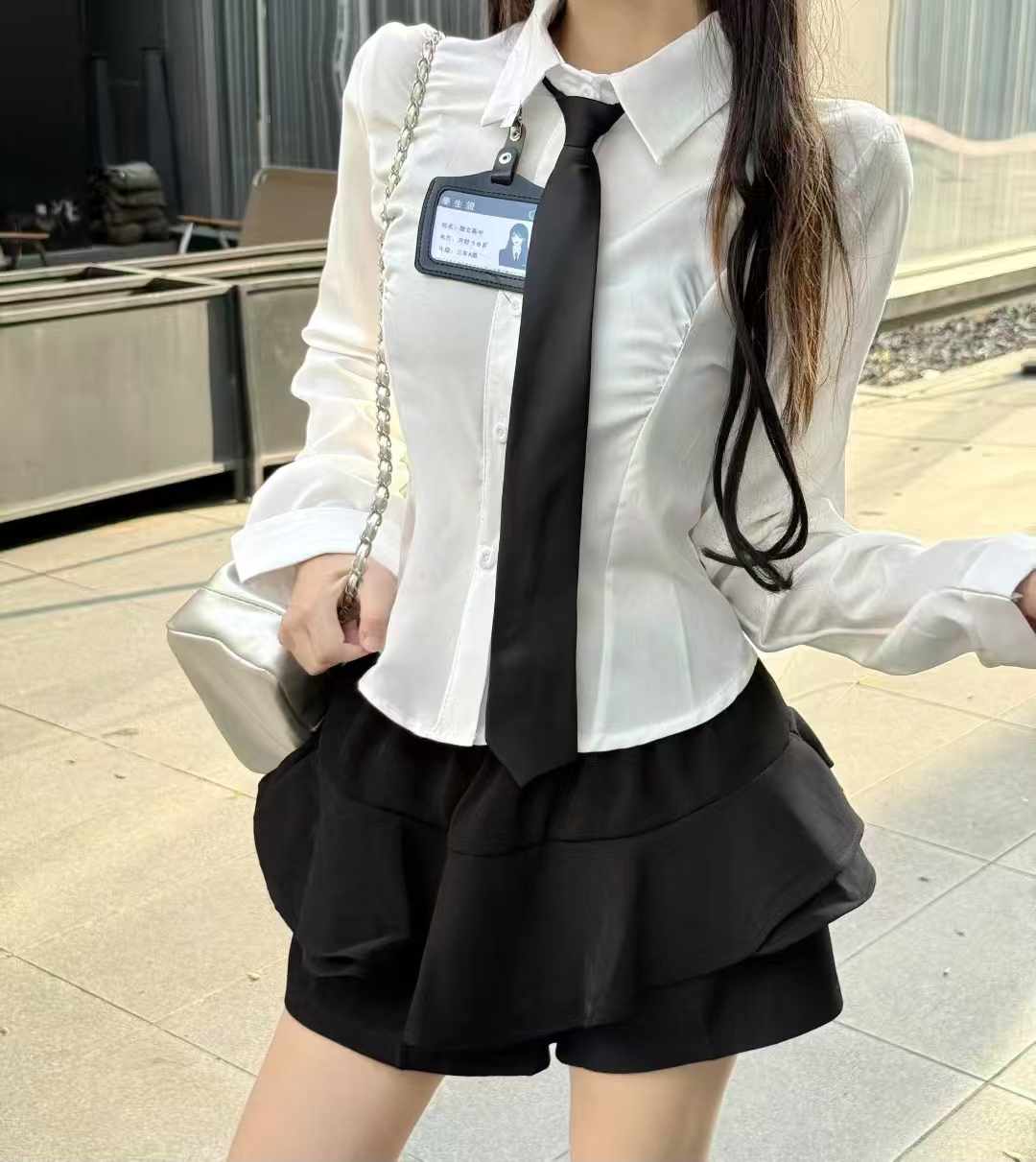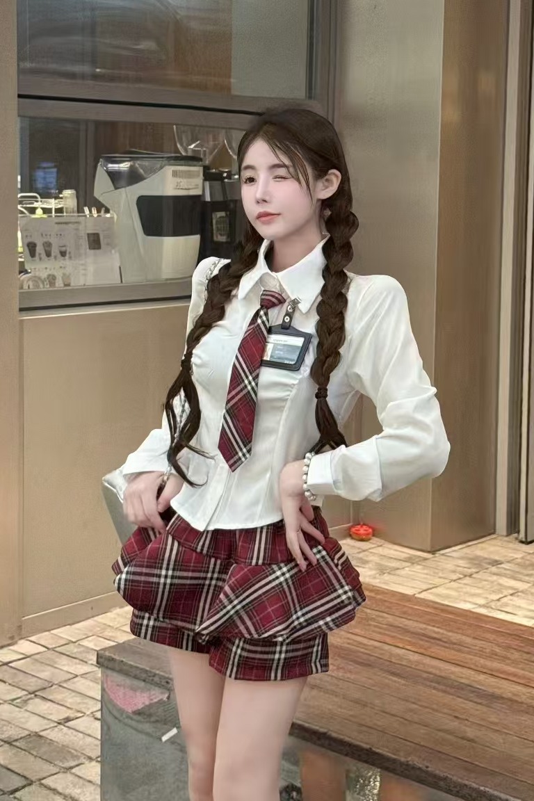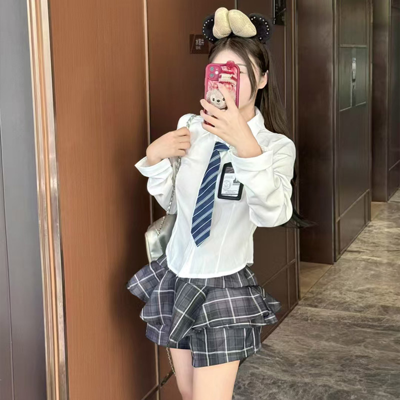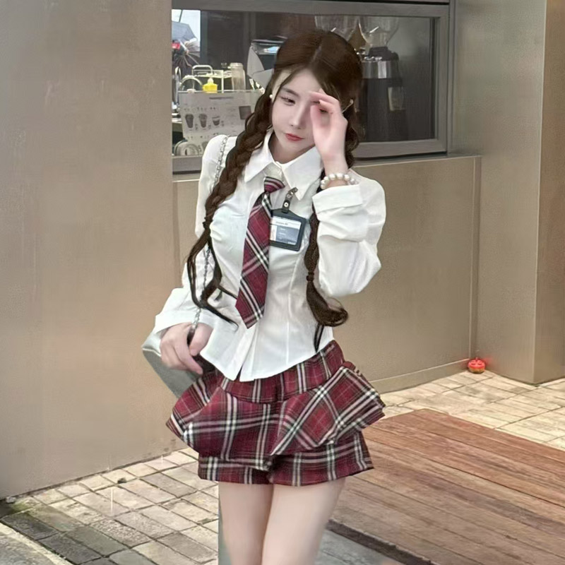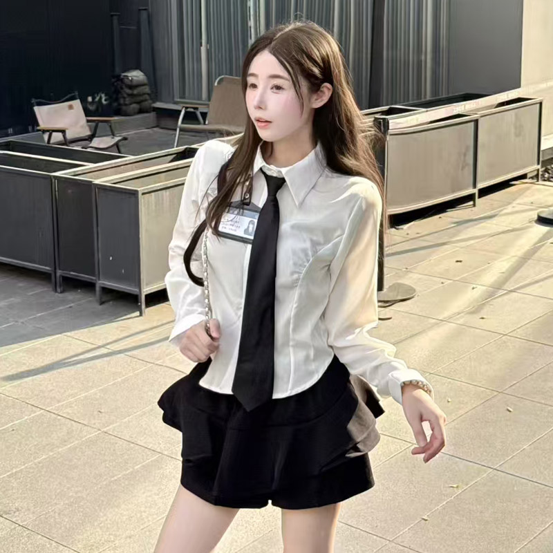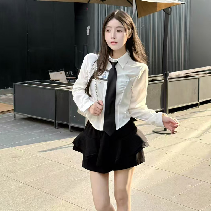 MY13582# POLO领气质修身衬衣+高腰短裙学院风辣妹套装女裝貨源服裝批發
