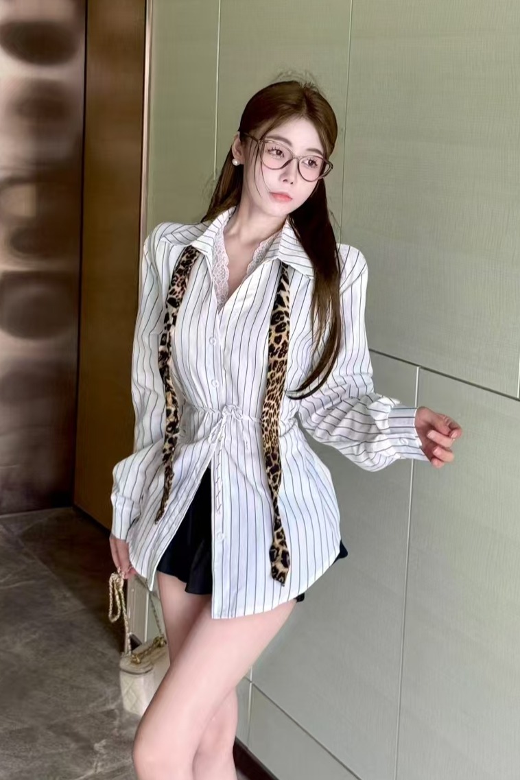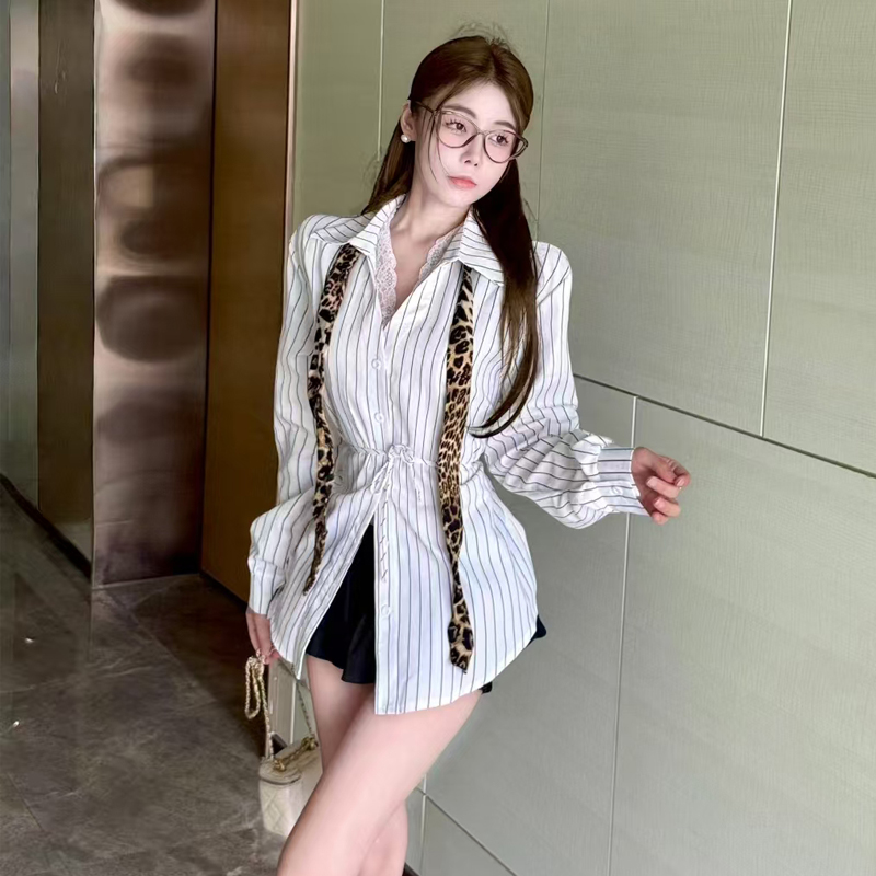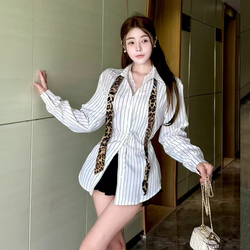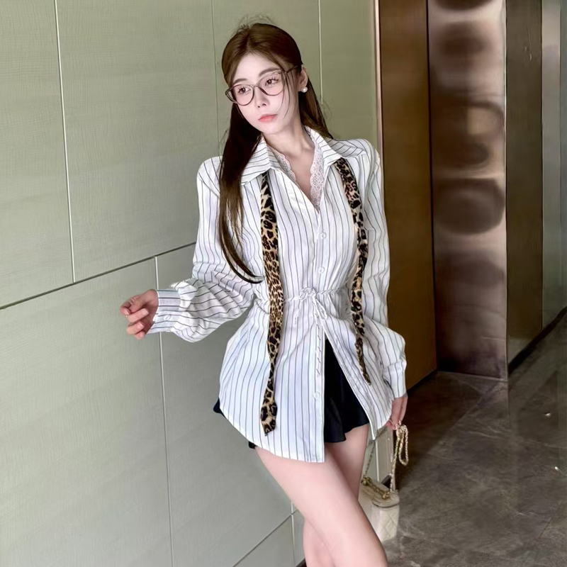 MY13583# 新款条纹单排扣收腰修身显瘦气质长袖衬衫百搭上衣女裝貨源服裝批發