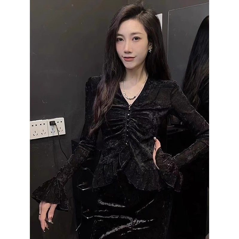 MY15840# 法式气质名媛设计感下摆v领喇叭袖丝绒加绒t恤女冬季新款修身上衣女裝貨源服裝批發