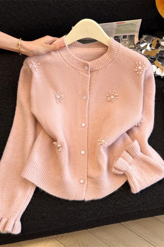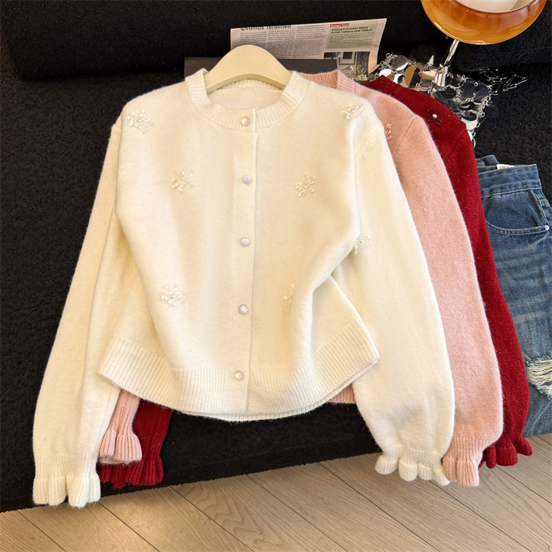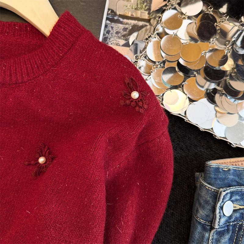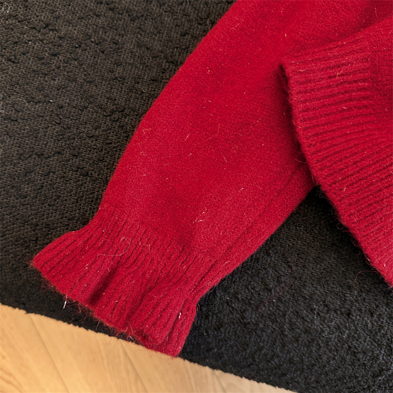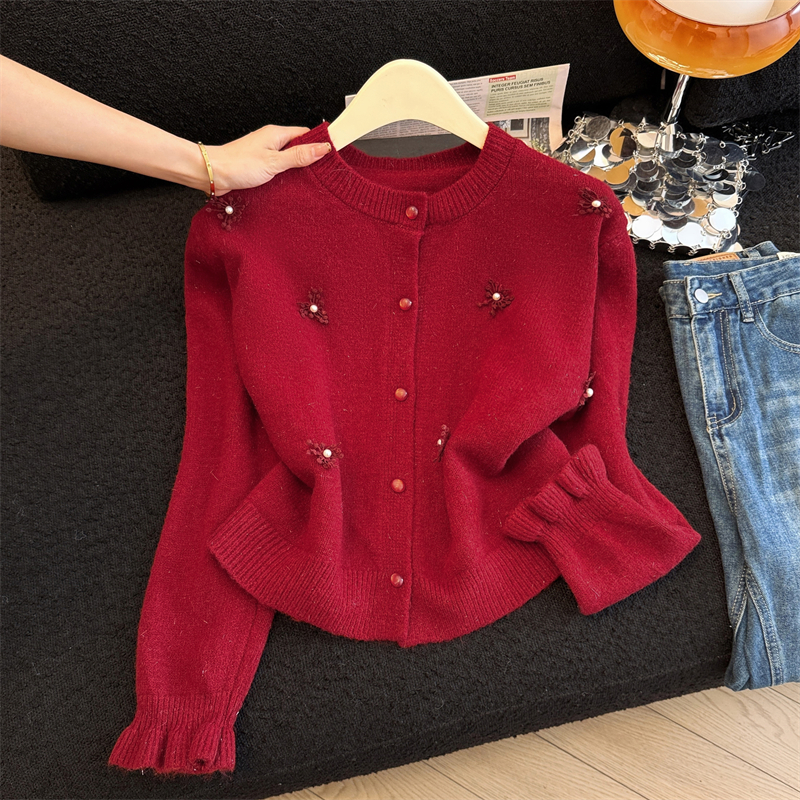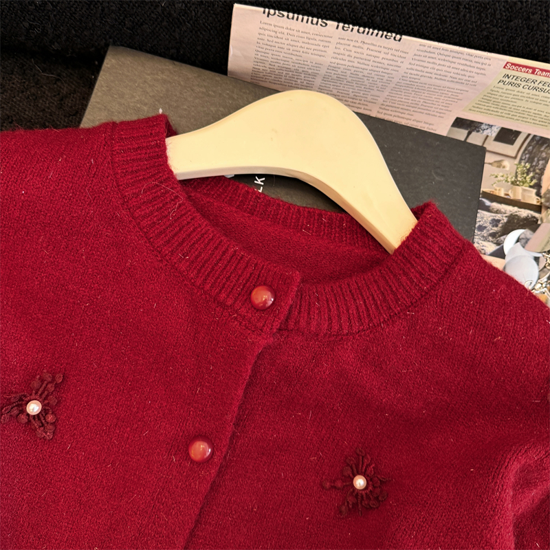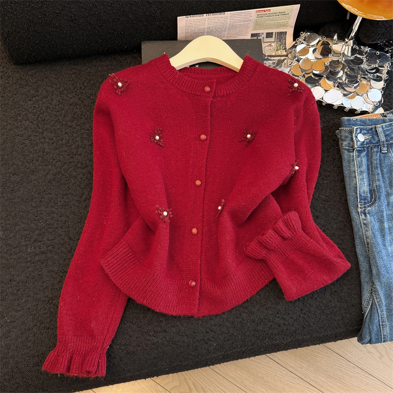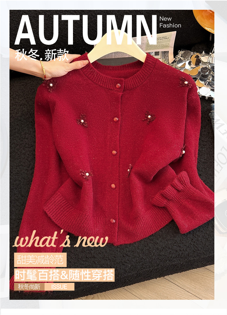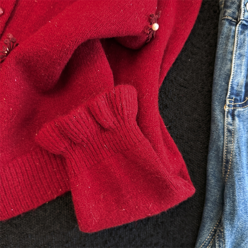 MY16212# 新年红重工钉珠毛衣外套新款设计感洋气本命年针织衫女裝貨源服裝批發