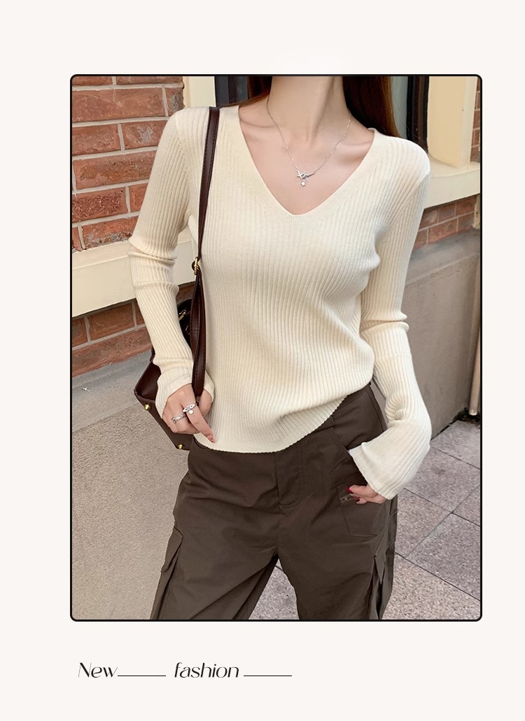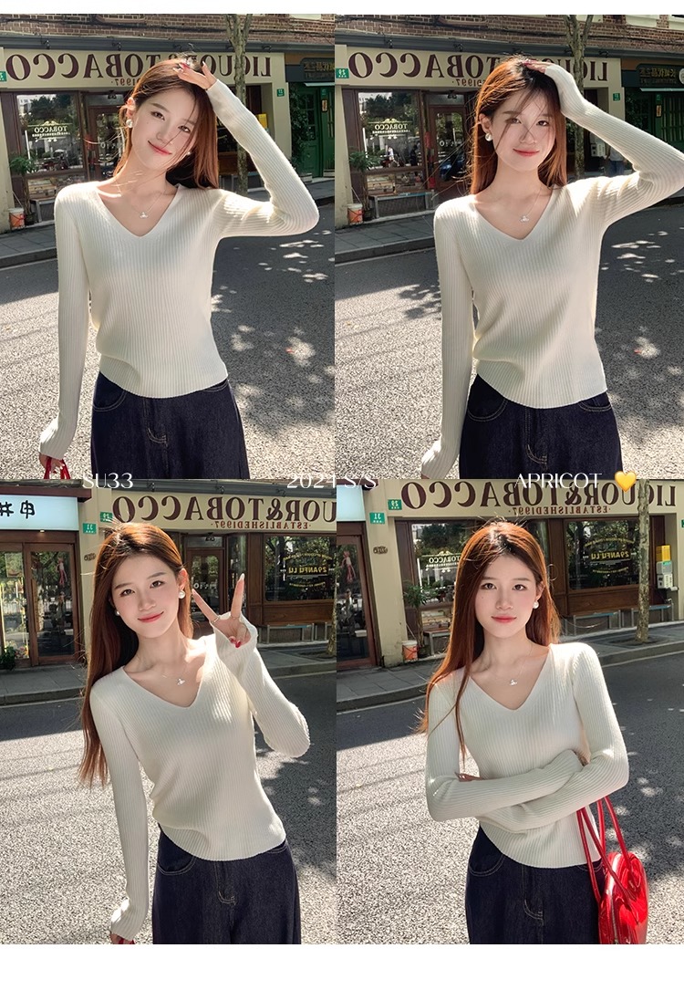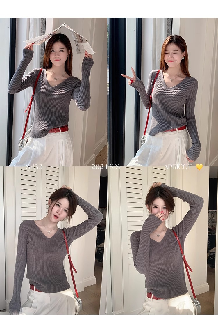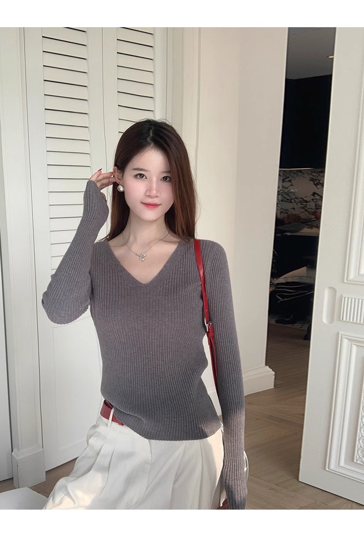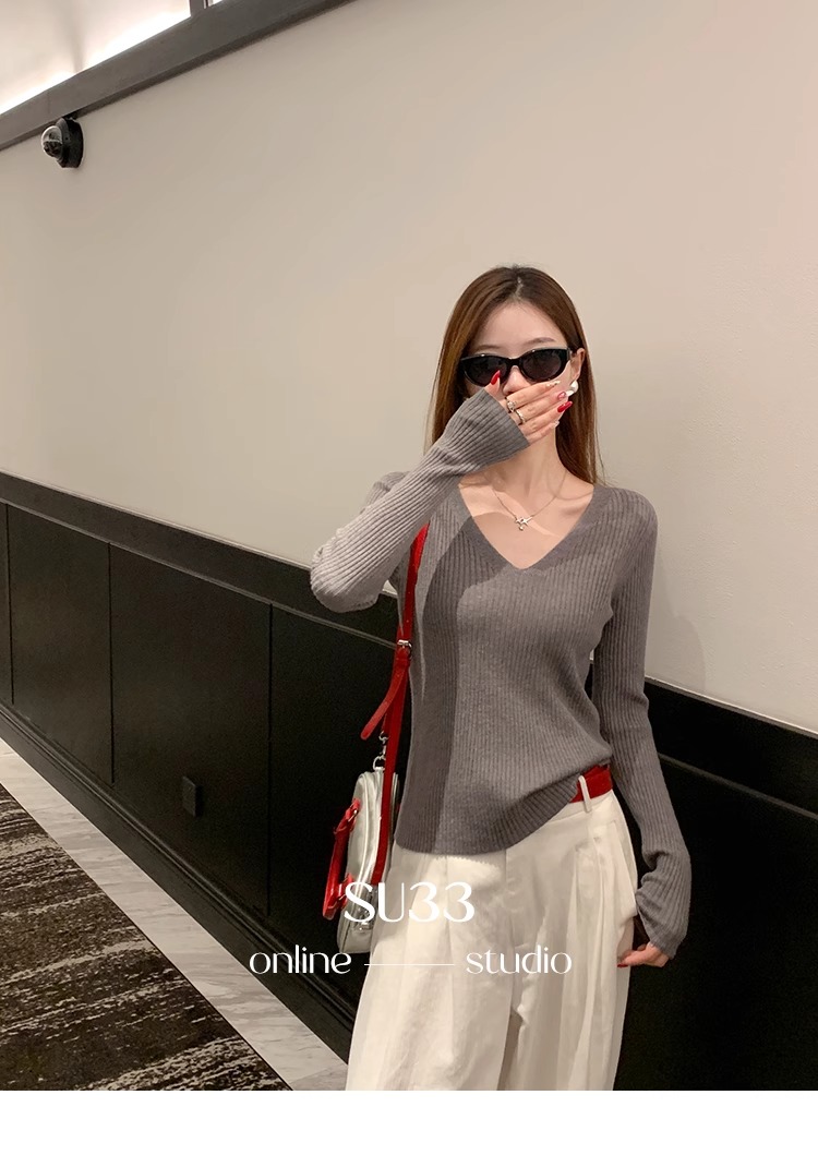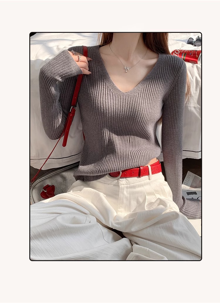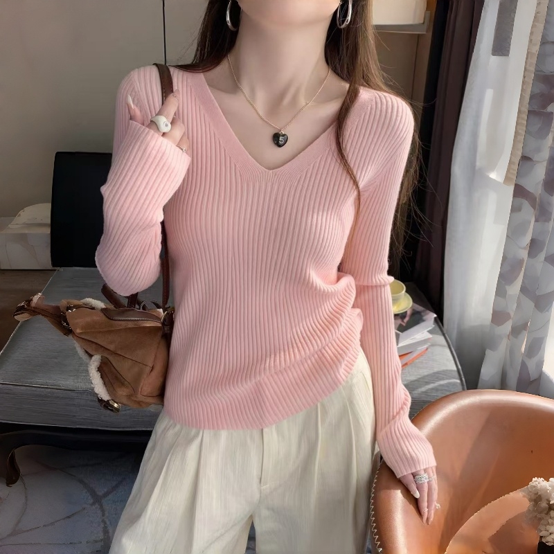 MY16254# 粉色v领针织衫新款穿搭风衣内搭长袖打底毛衣秋冬上衣女裝貨源服裝批發