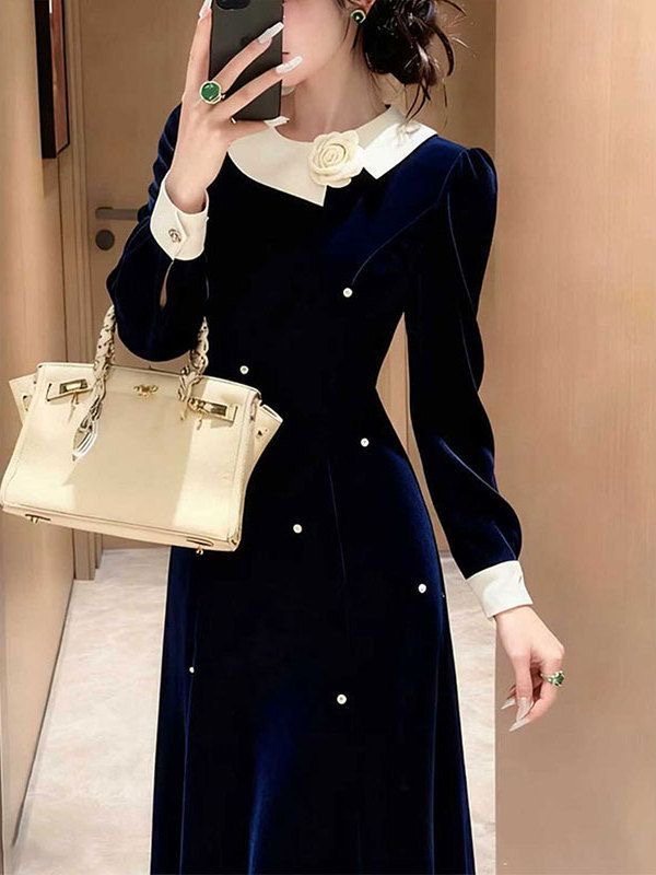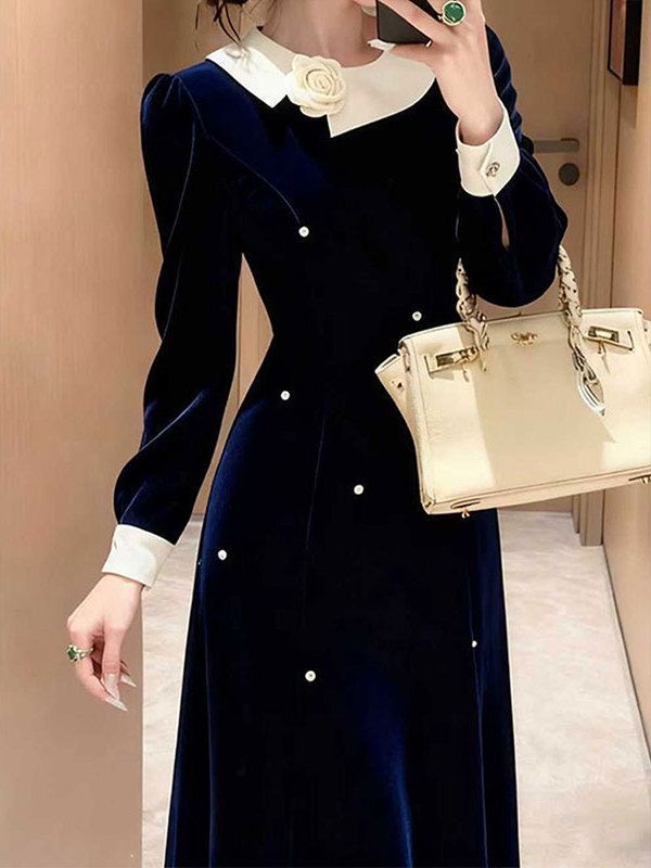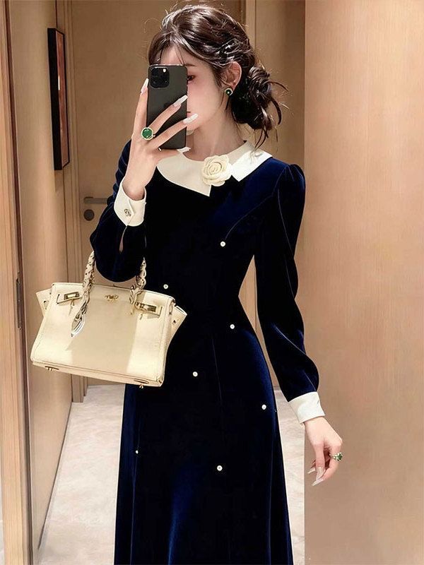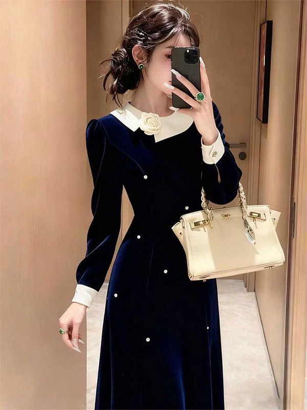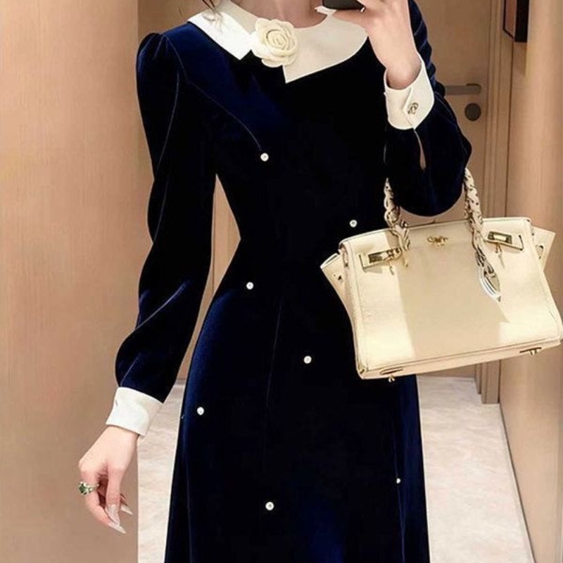 MY16264# 出席重要场合的裙子高端精致富家千金小香风藏蓝色丝绒连衣裙冬季女裝貨源服裝批發