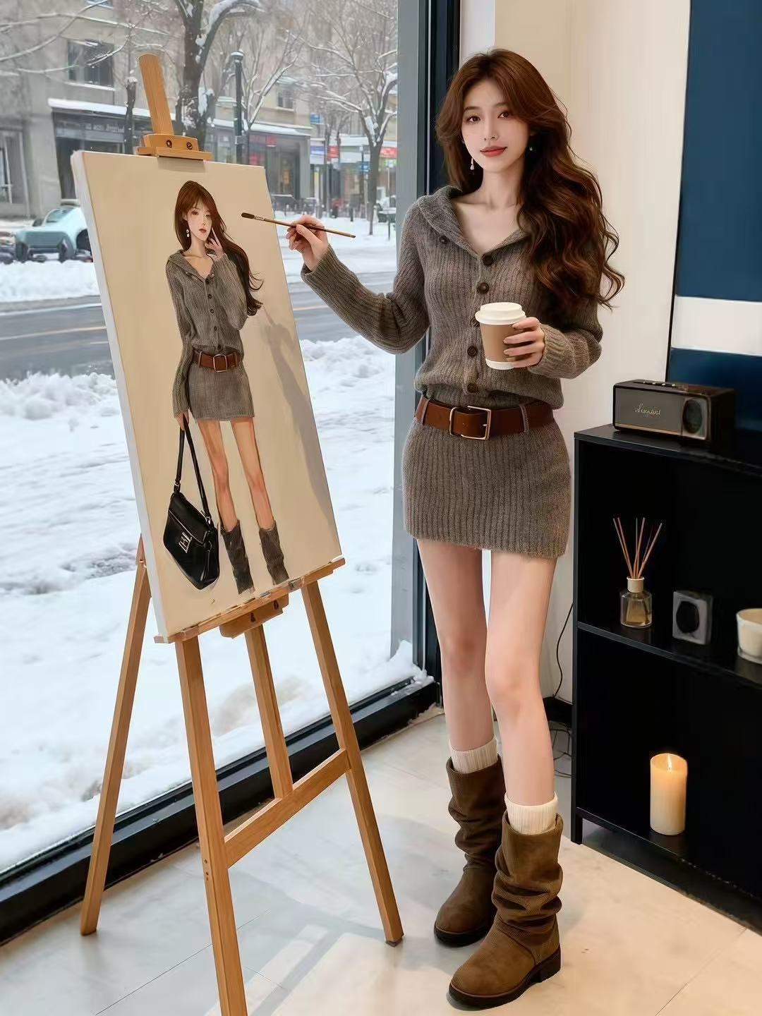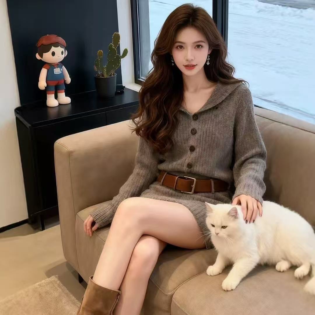 MY16278# 法式花灰色翻领针织包臀连衣裙新款毛衣裙带皮带女裝貨源服裝批發