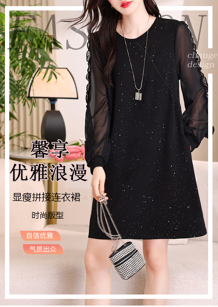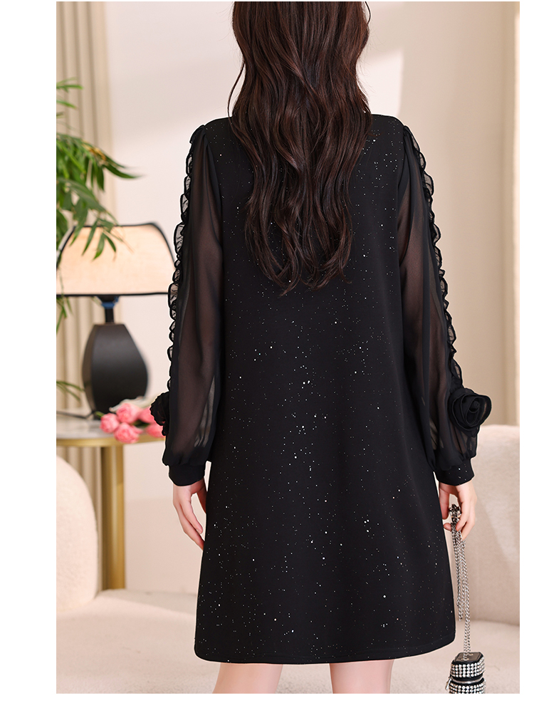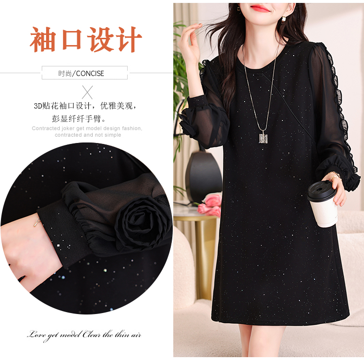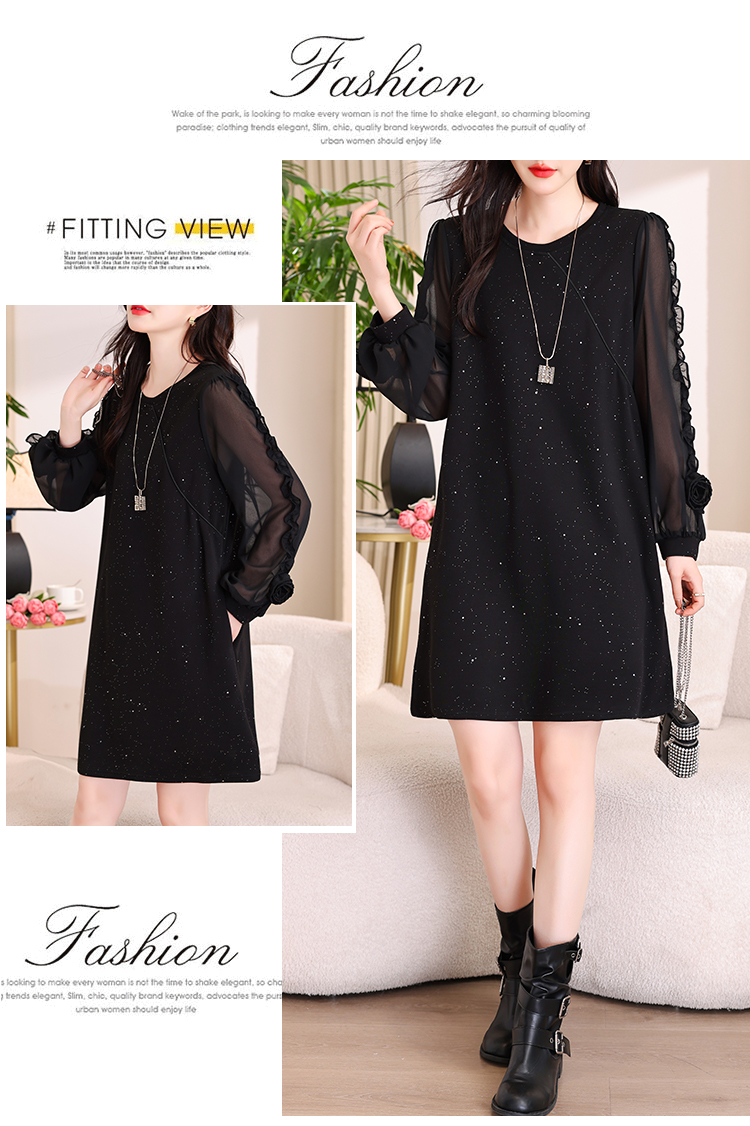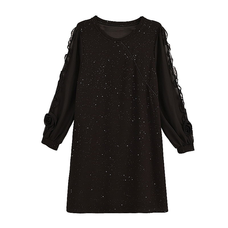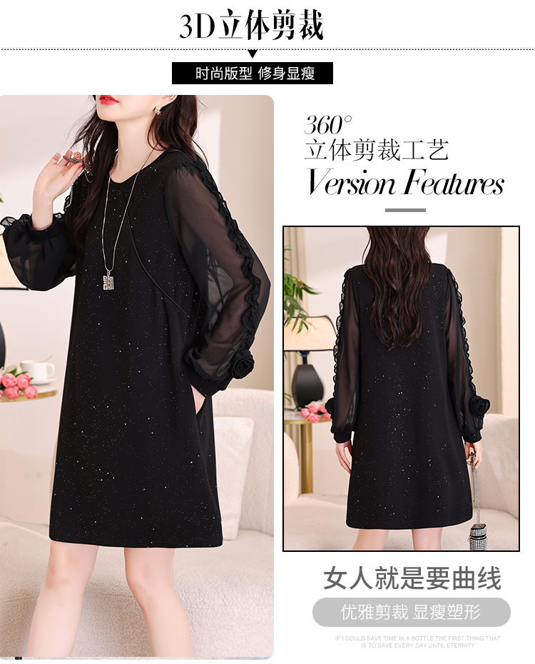 MY16288# 大码连衣裙新款宽松显瘦胖mm花朵袖亮闪闪中长裙女裝貨源服裝批發