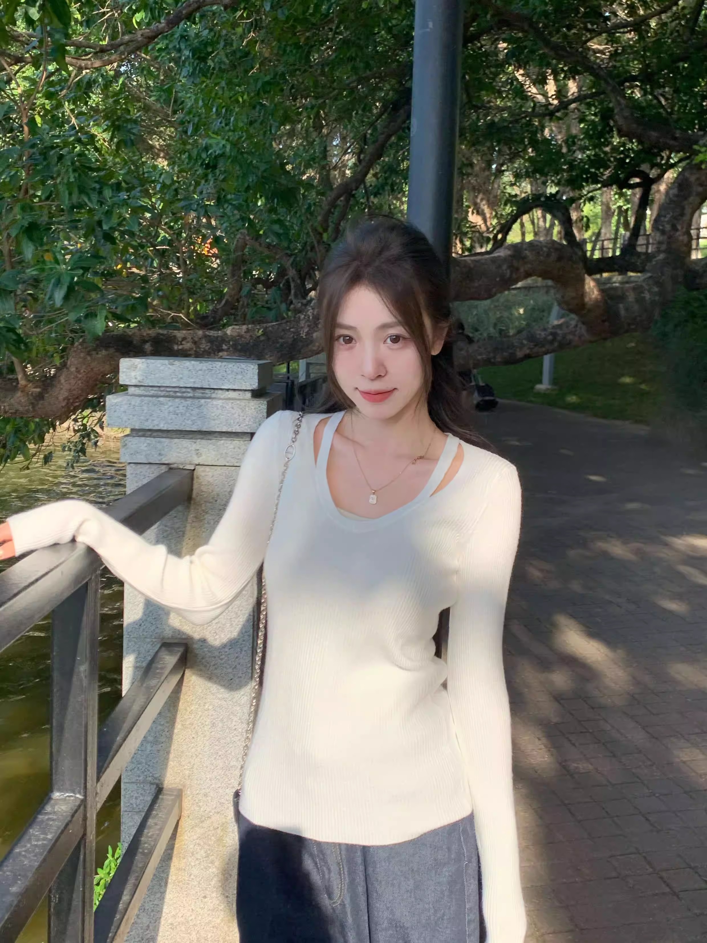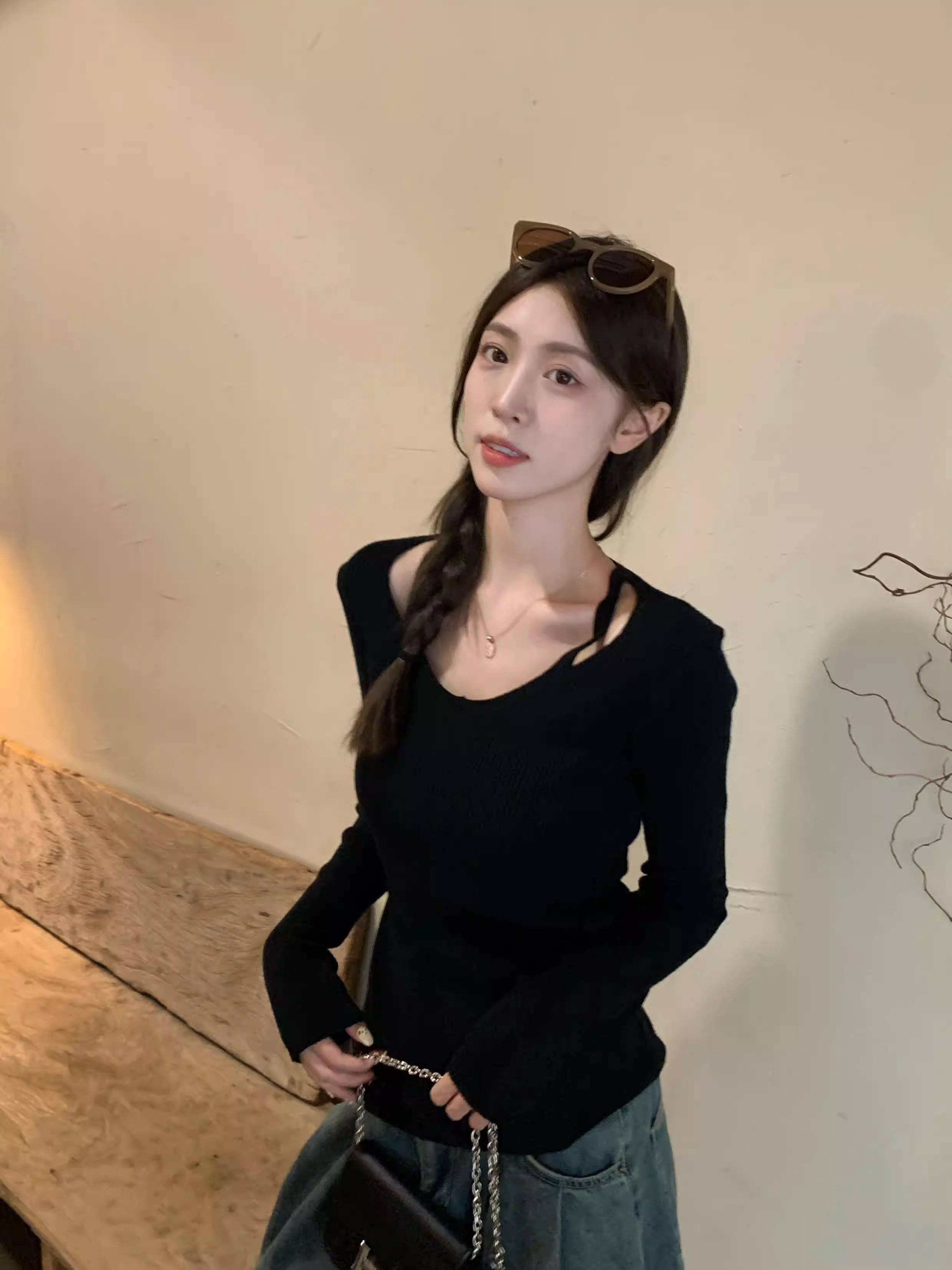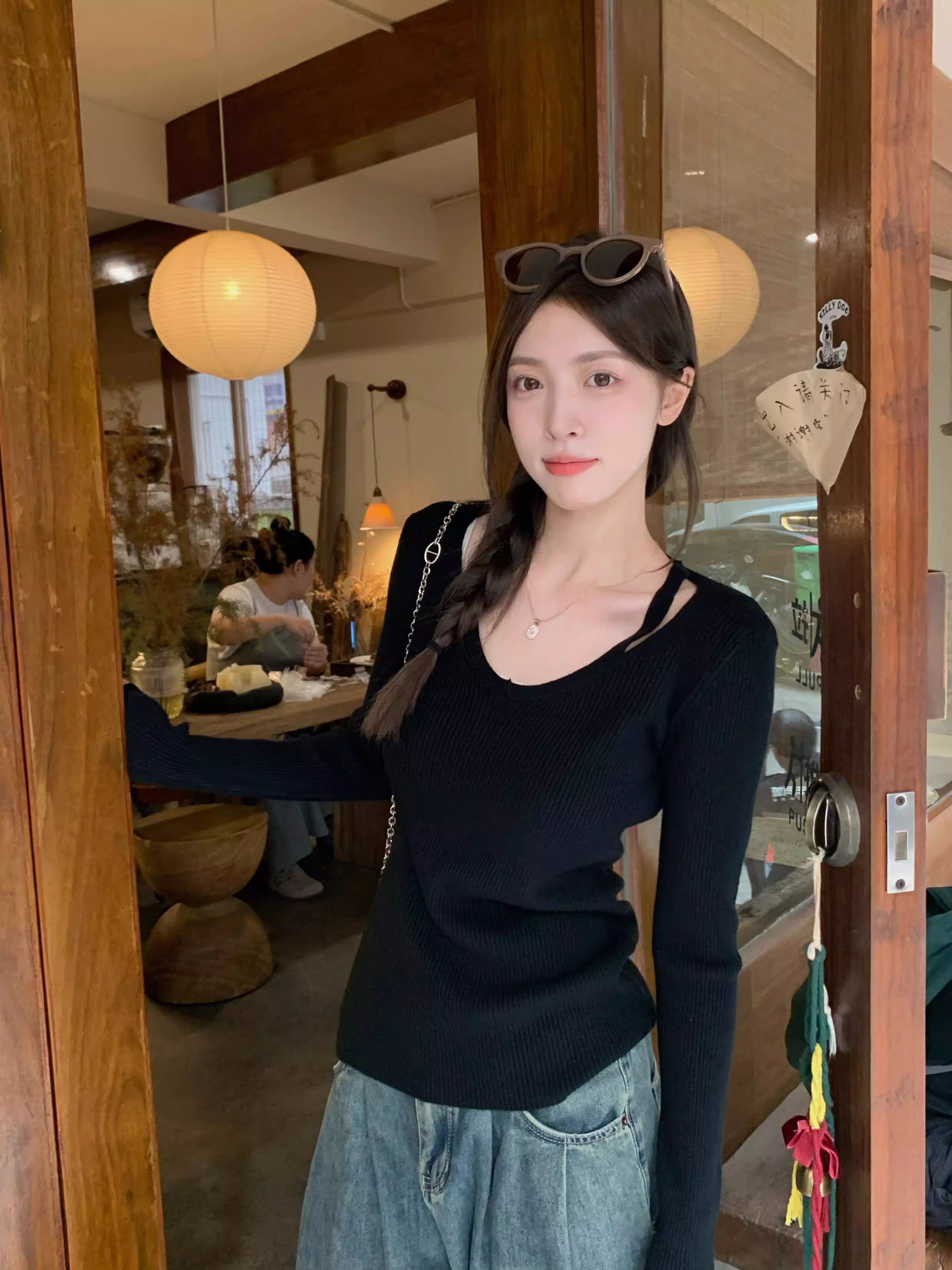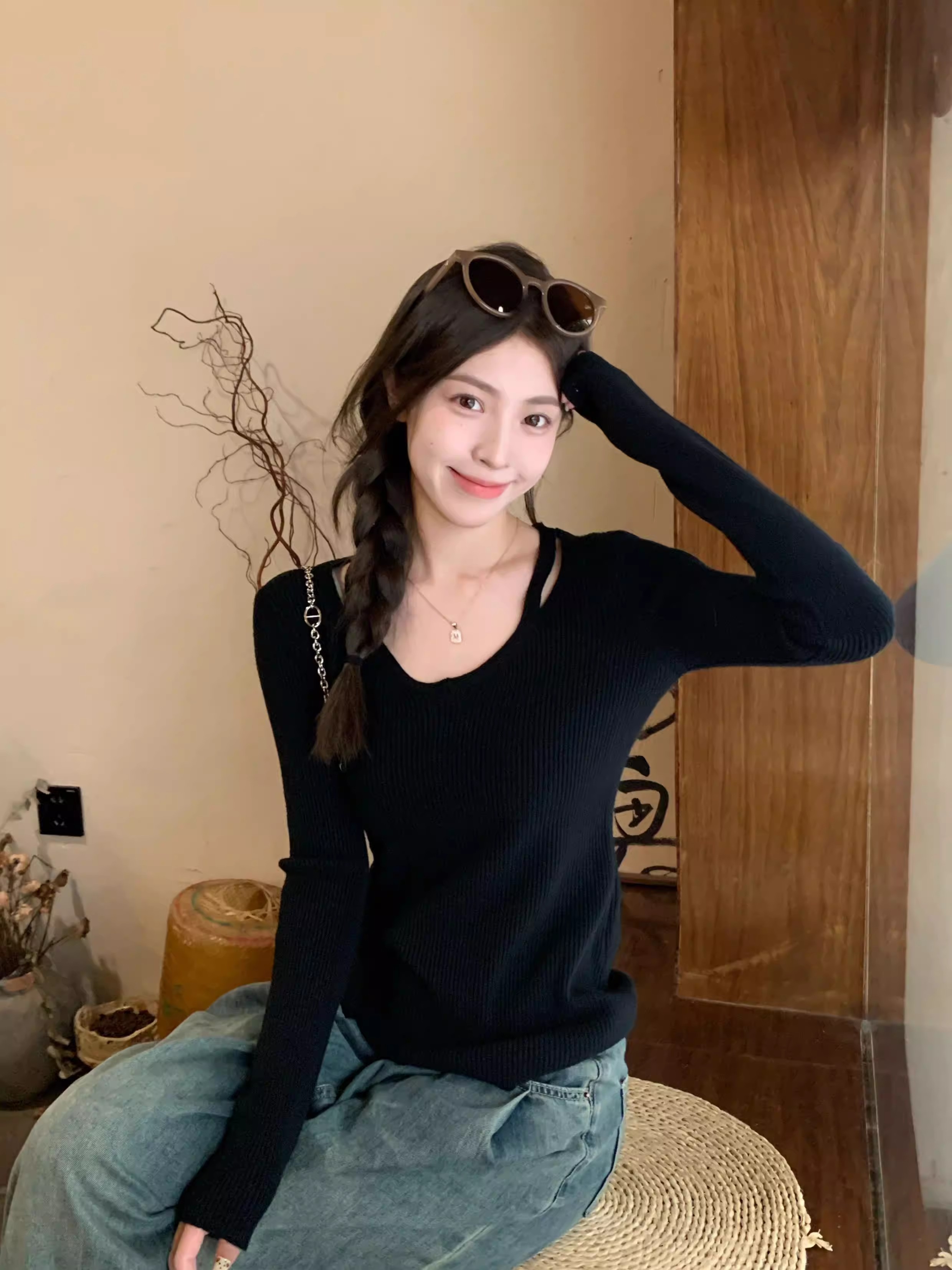MY16292# 韩系纯欲别致低领内搭打底衫女心机镂空修身毛衣T恤针织上衣女裝貨源服裝批發