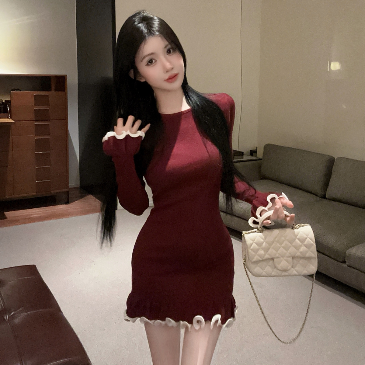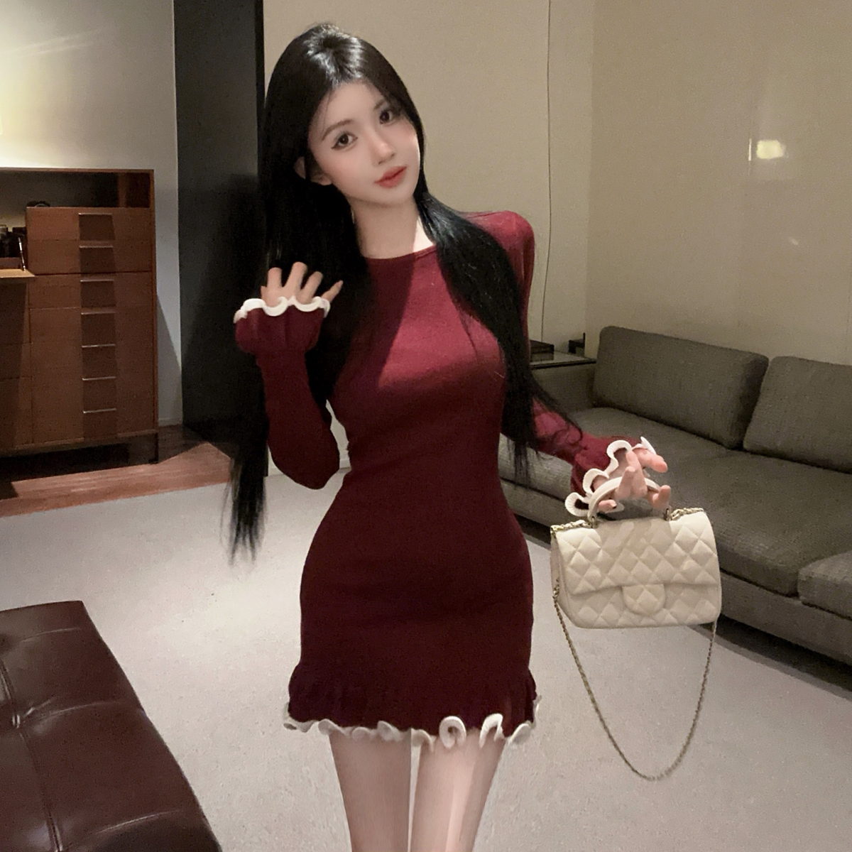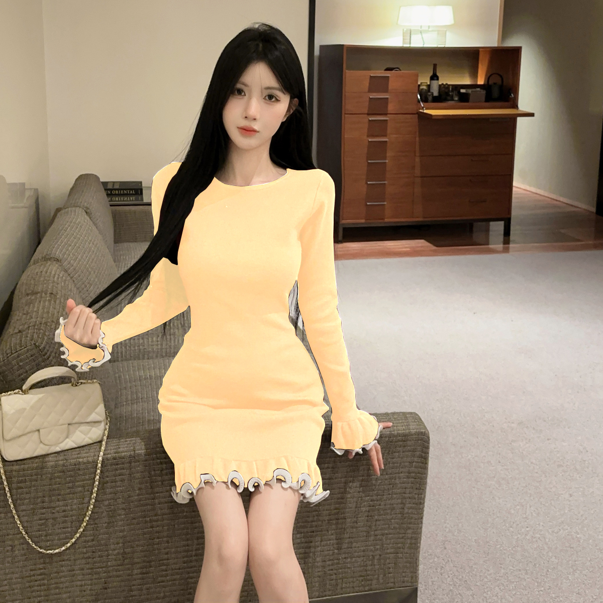 MY16321# 韩版打底毛衣裙褶皱木耳边包臀裙荷叶边长袖针织连衣裙女裝貨源服裝批發