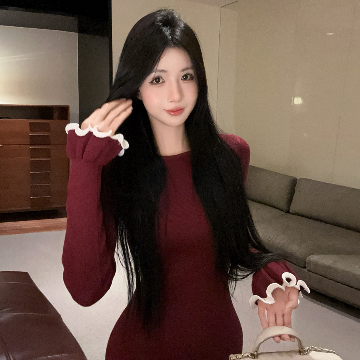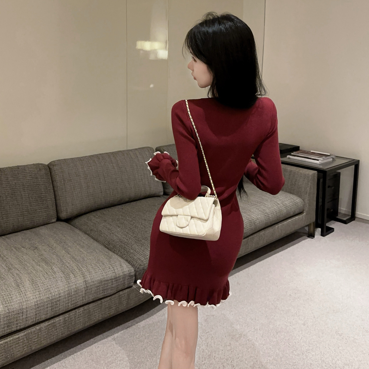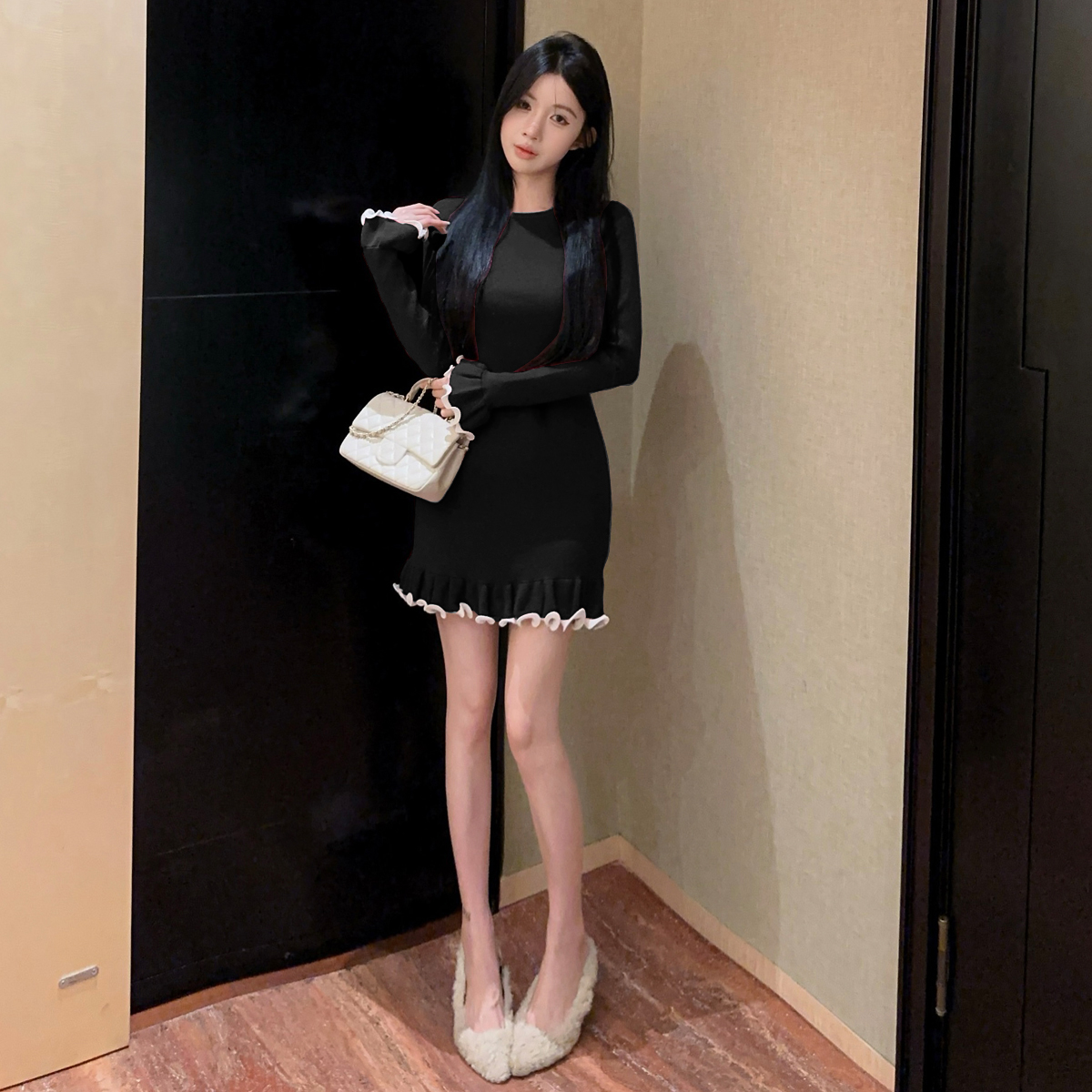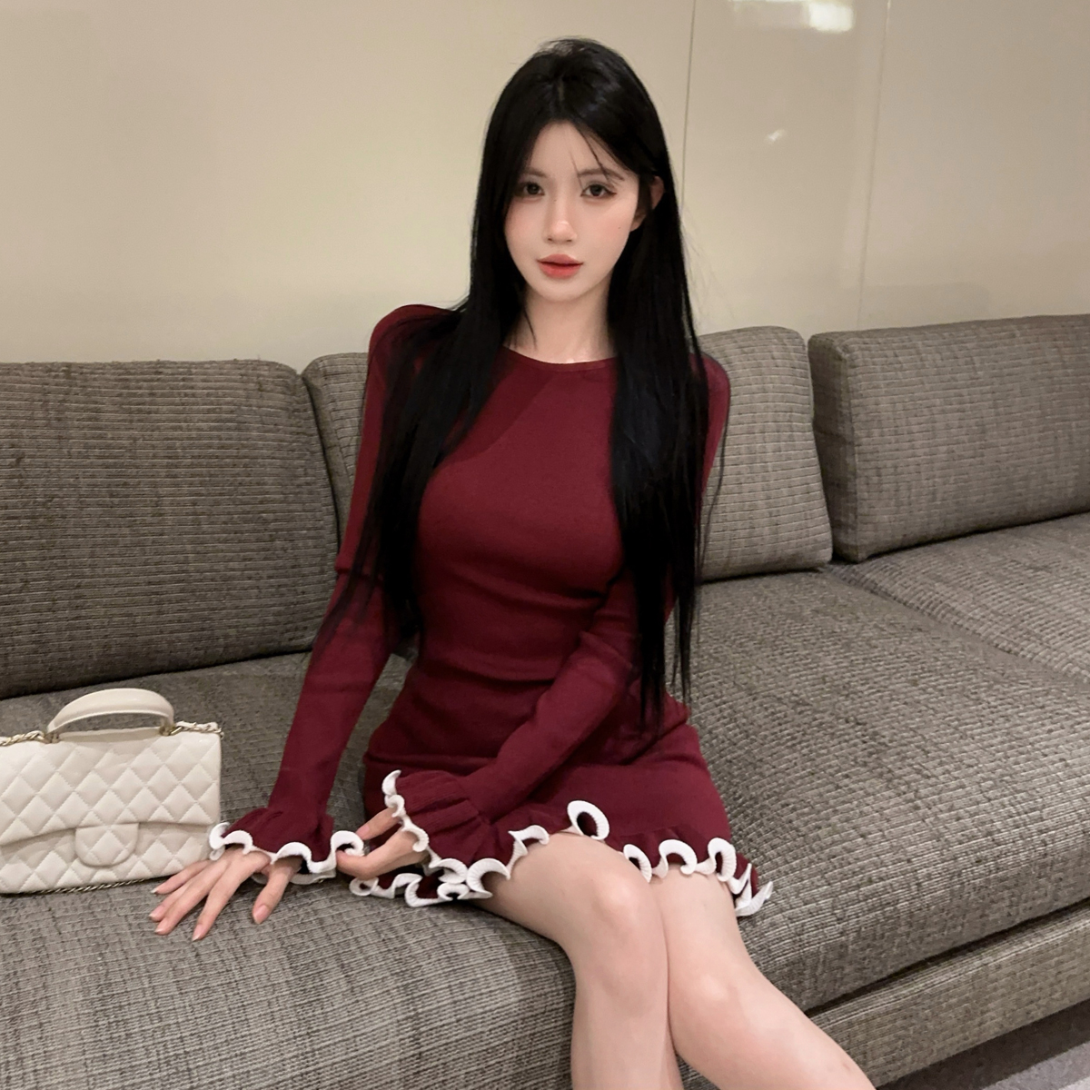 MY16321# 韩版打底毛衣裙褶皱木耳边包臀裙荷叶边长袖针织连衣裙女裝貨源服裝批發
