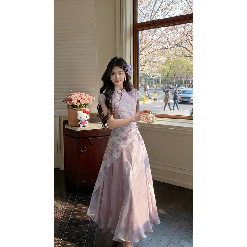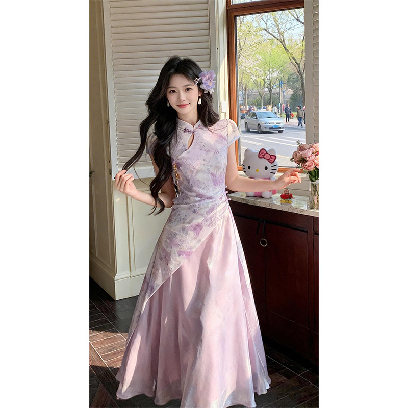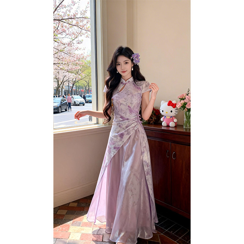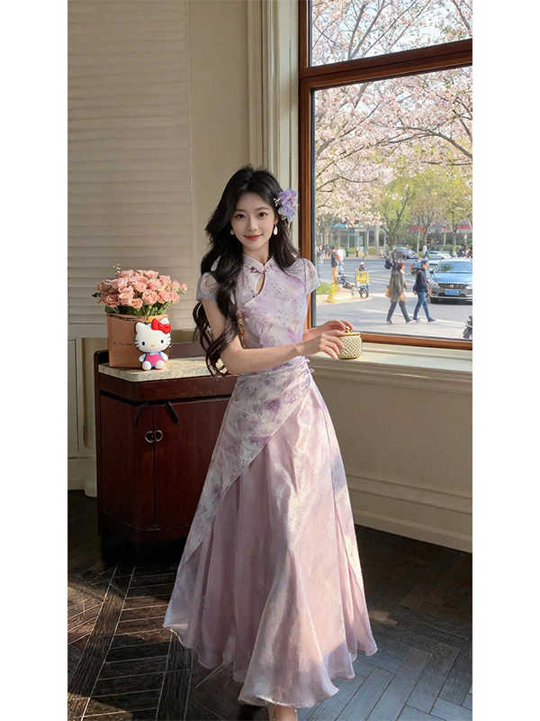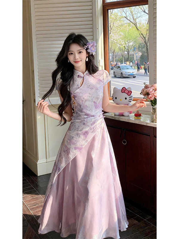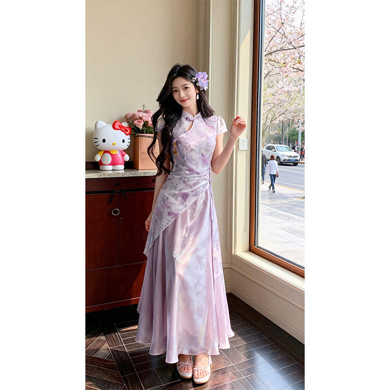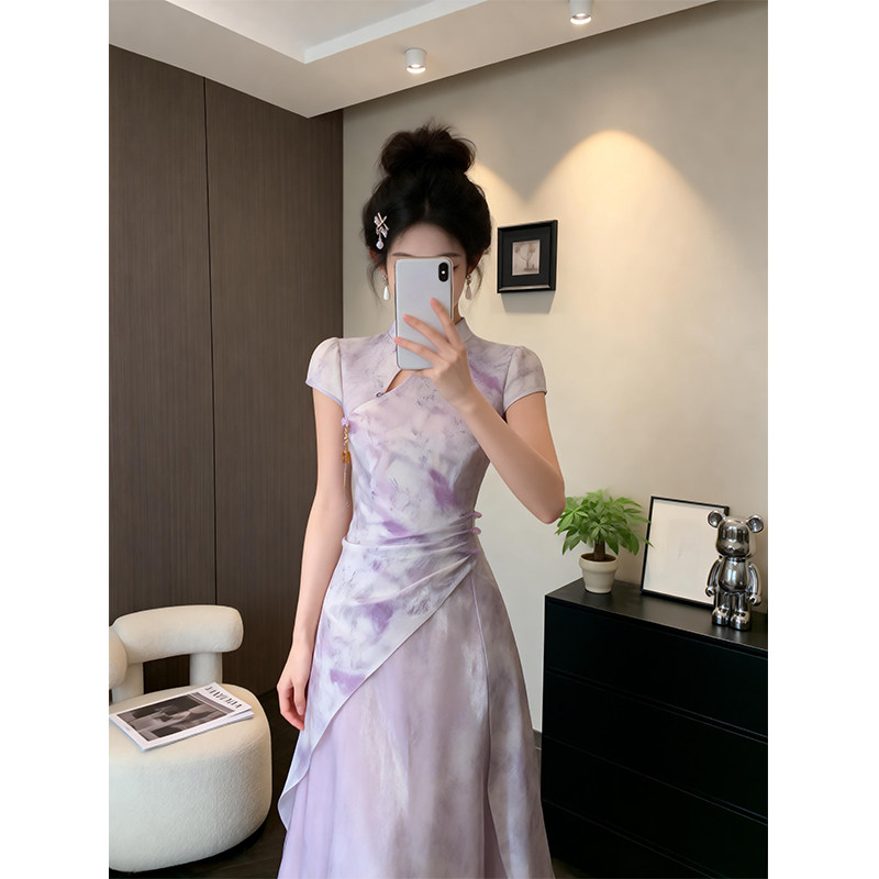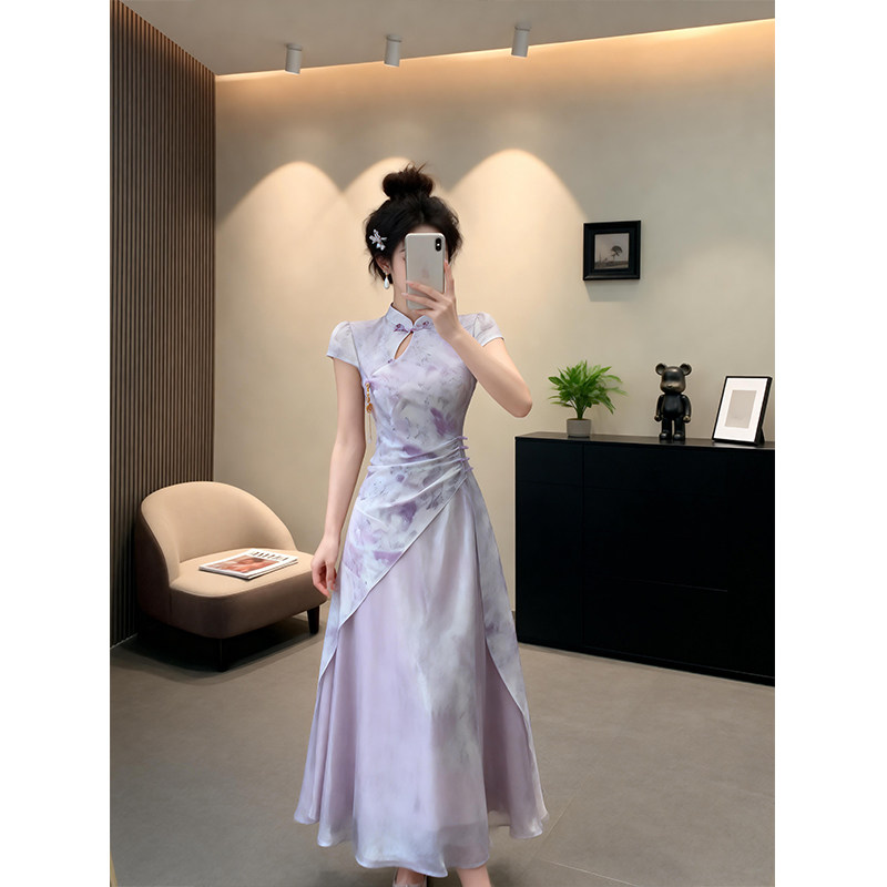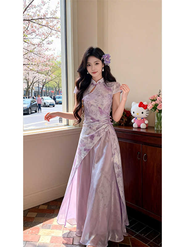 RY2331# 幻紫流云新中式改良国风2026夏季暗纹印花旗袍收腰琉光纱裙女