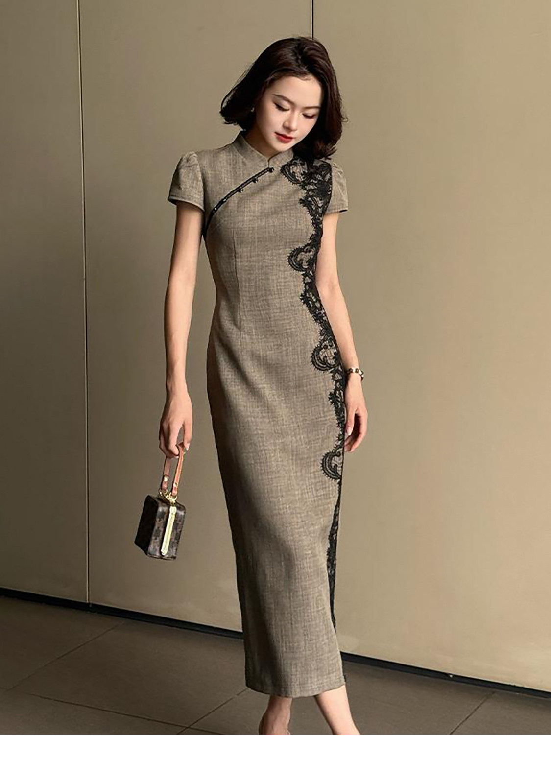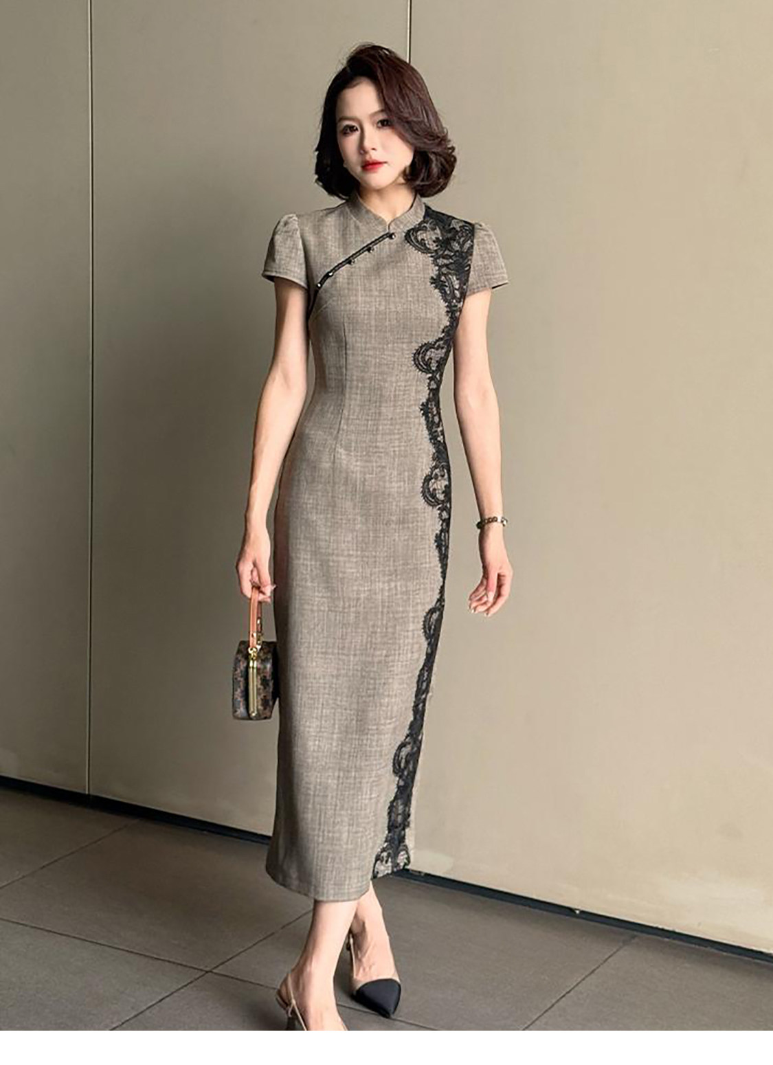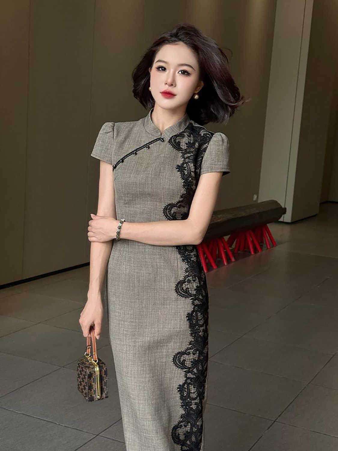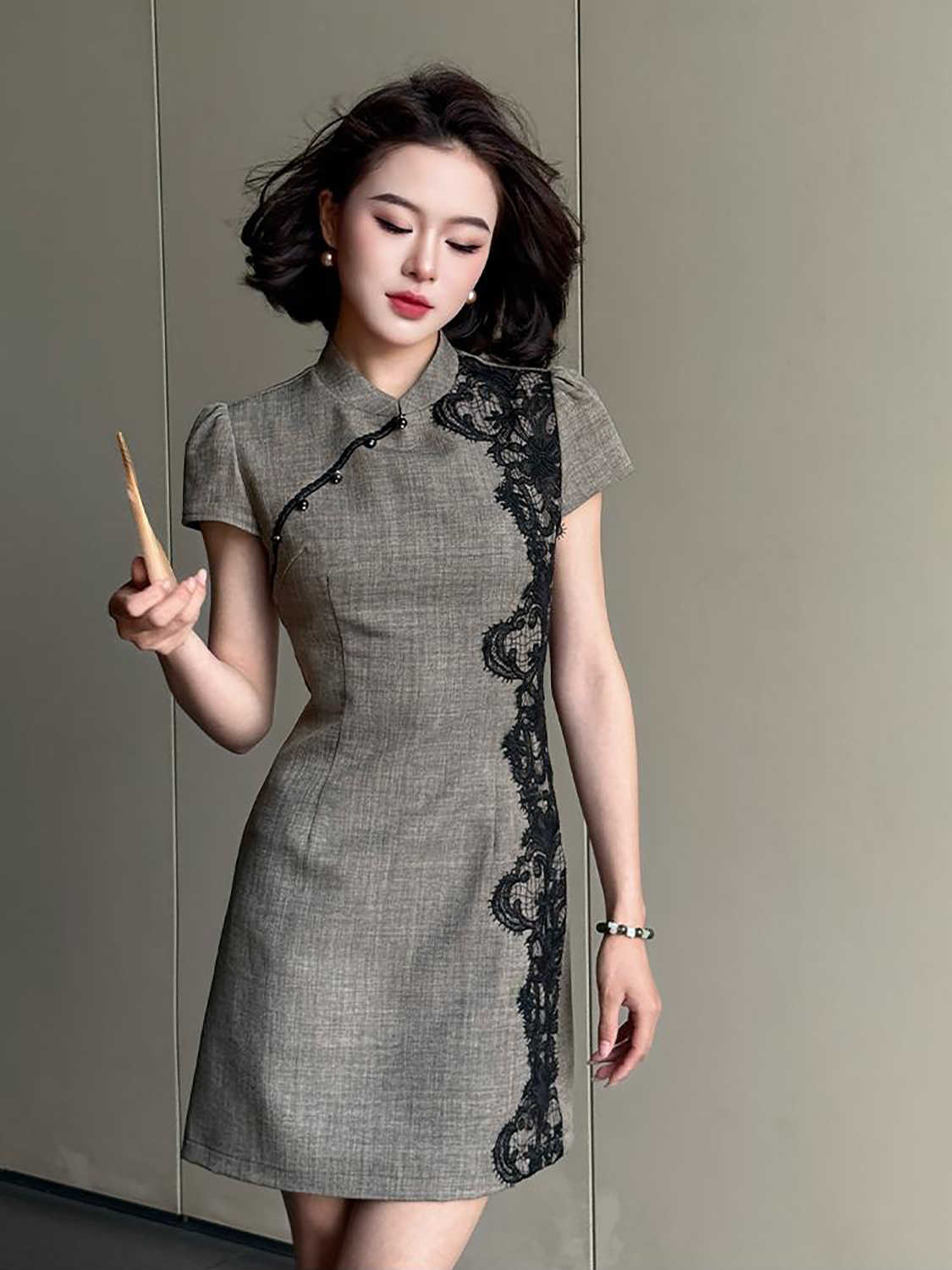 RY2332# 黛色鎏边新中式旗袍国风古法高级灰色气质蕾丝拼接连衣裙女夏