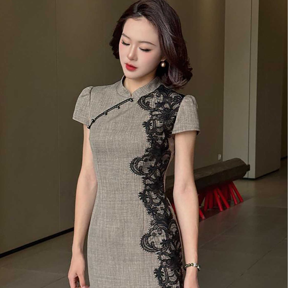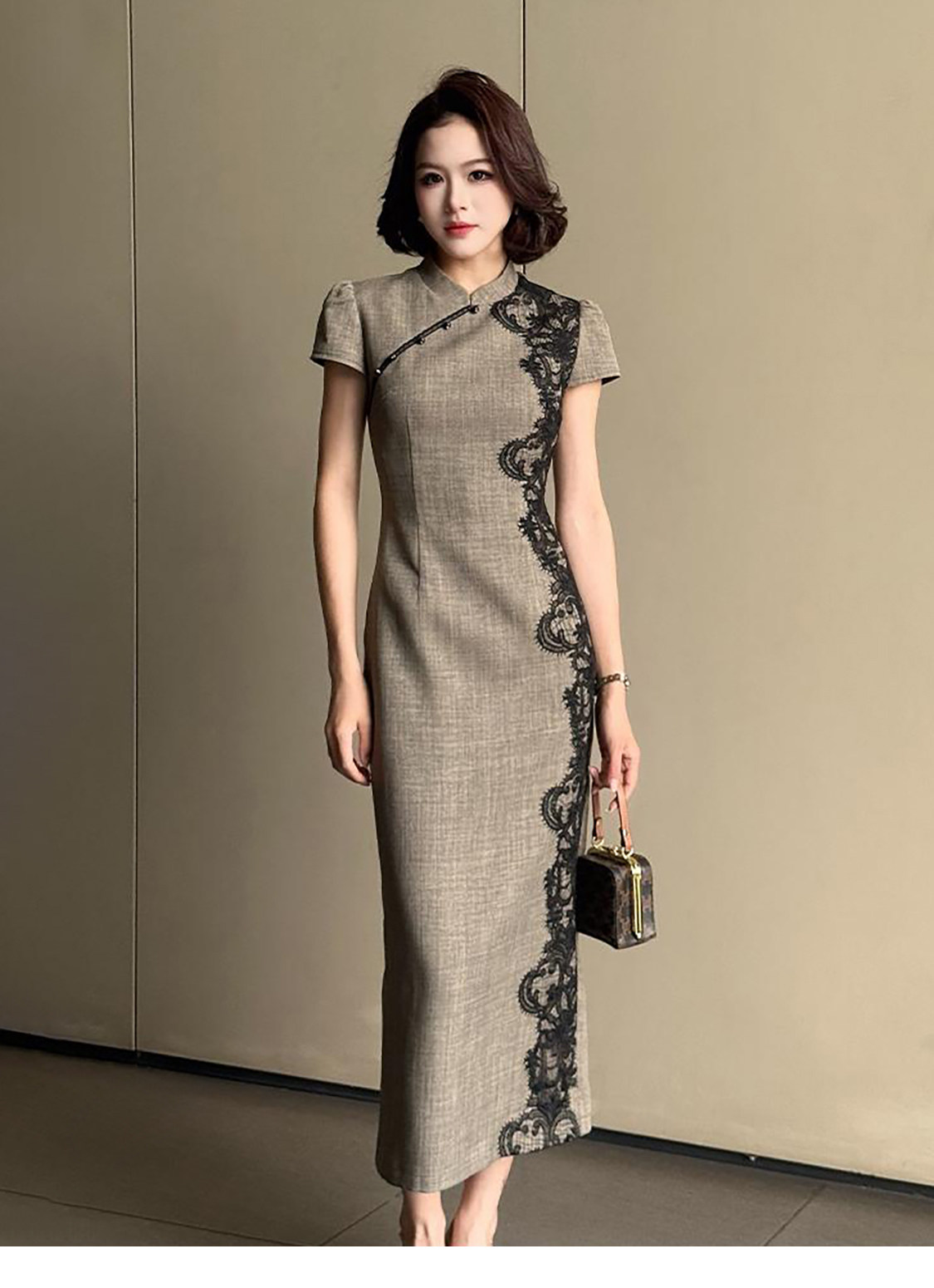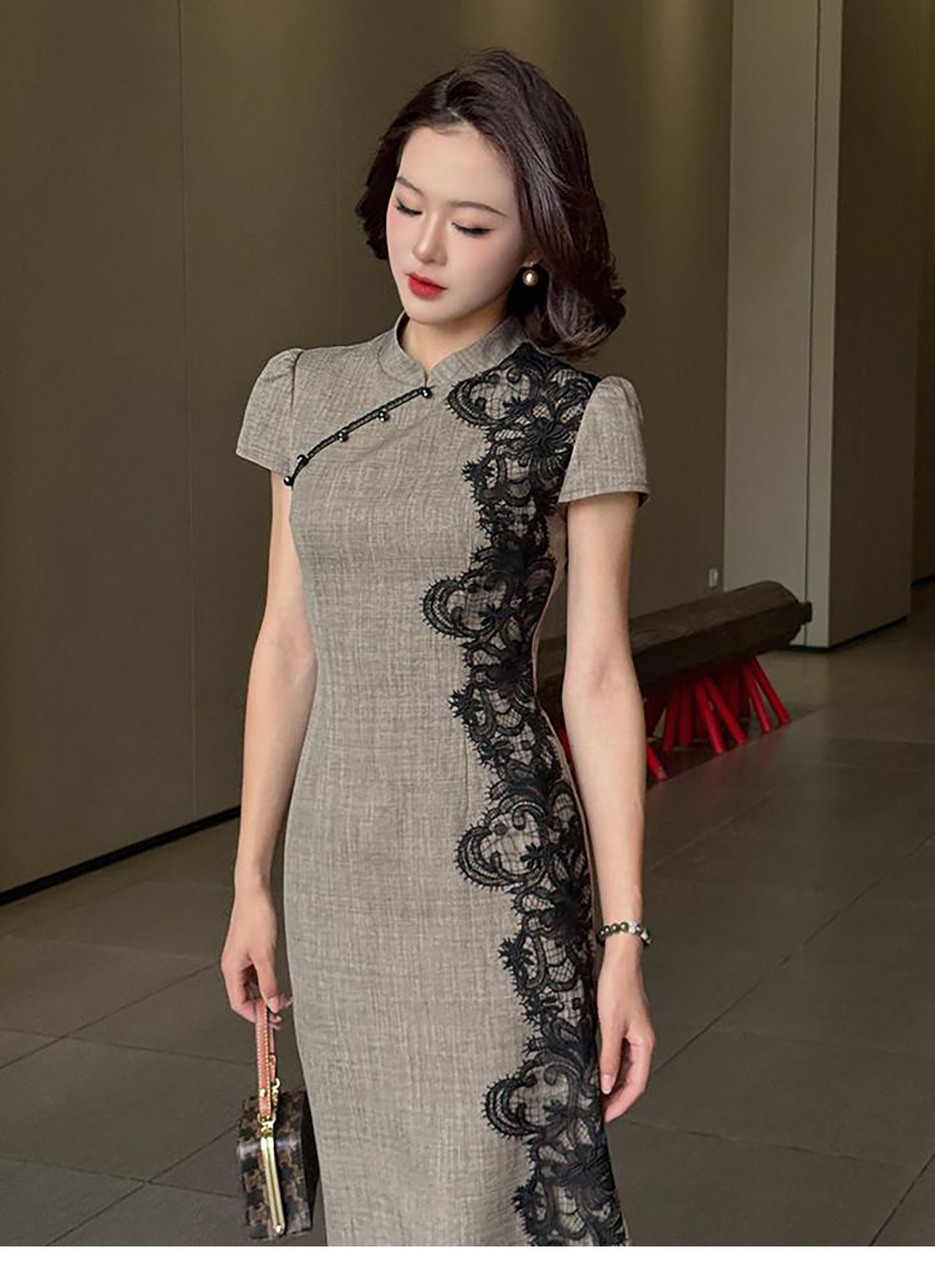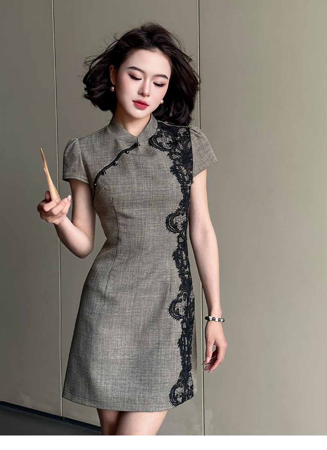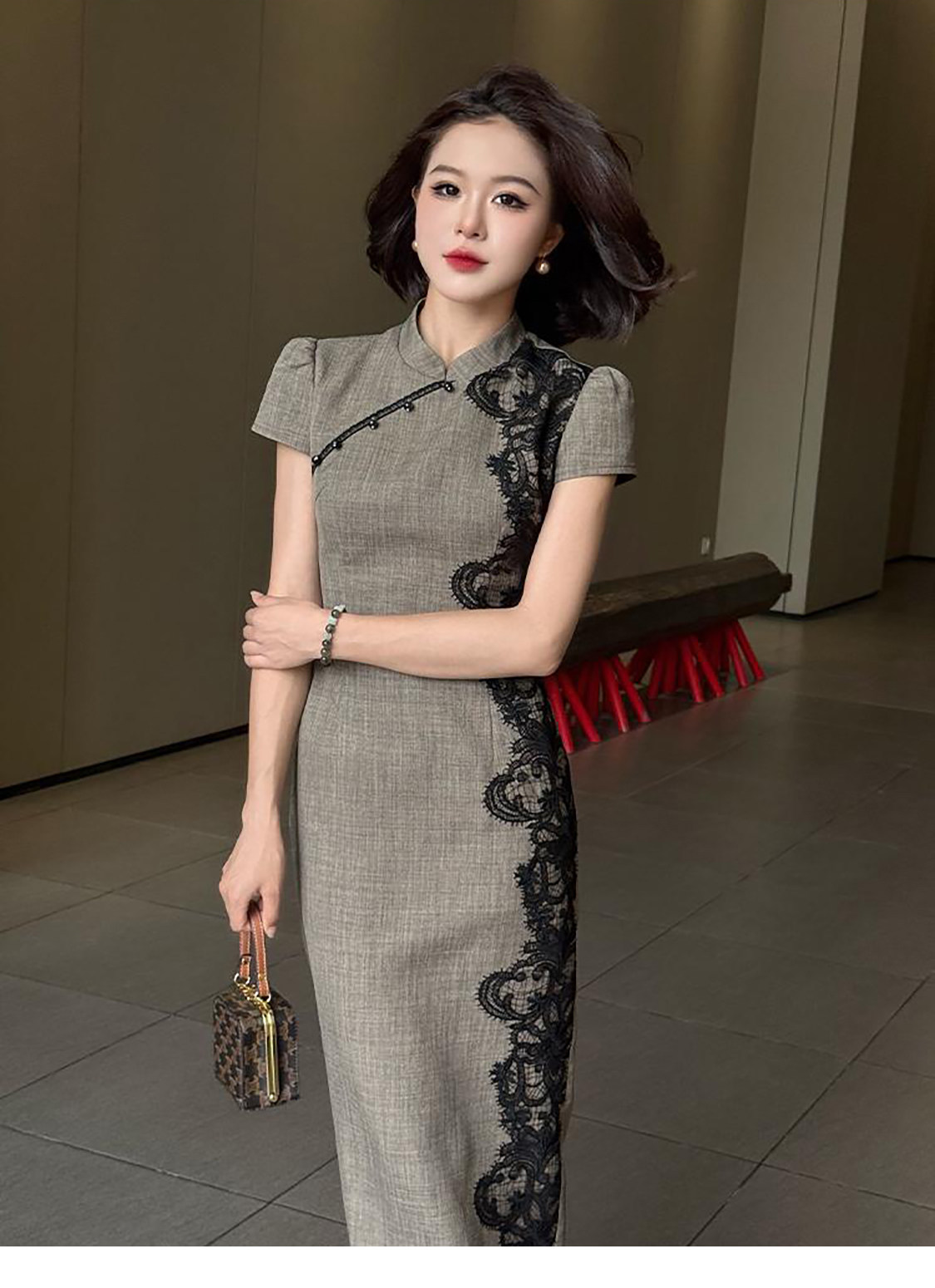 RY2332# 黛色鎏边新中式旗袍国风古法高级灰色气质蕾丝拼接连衣裙女夏