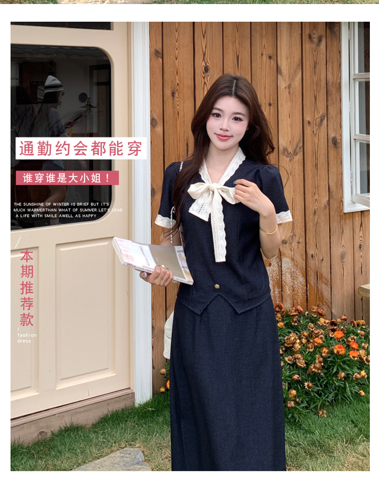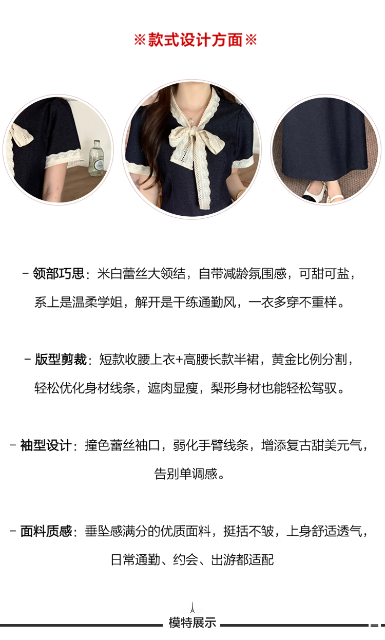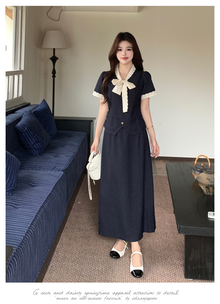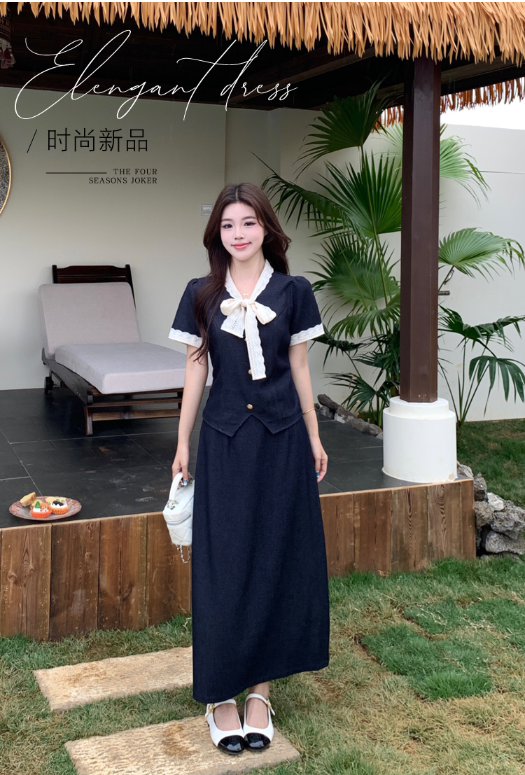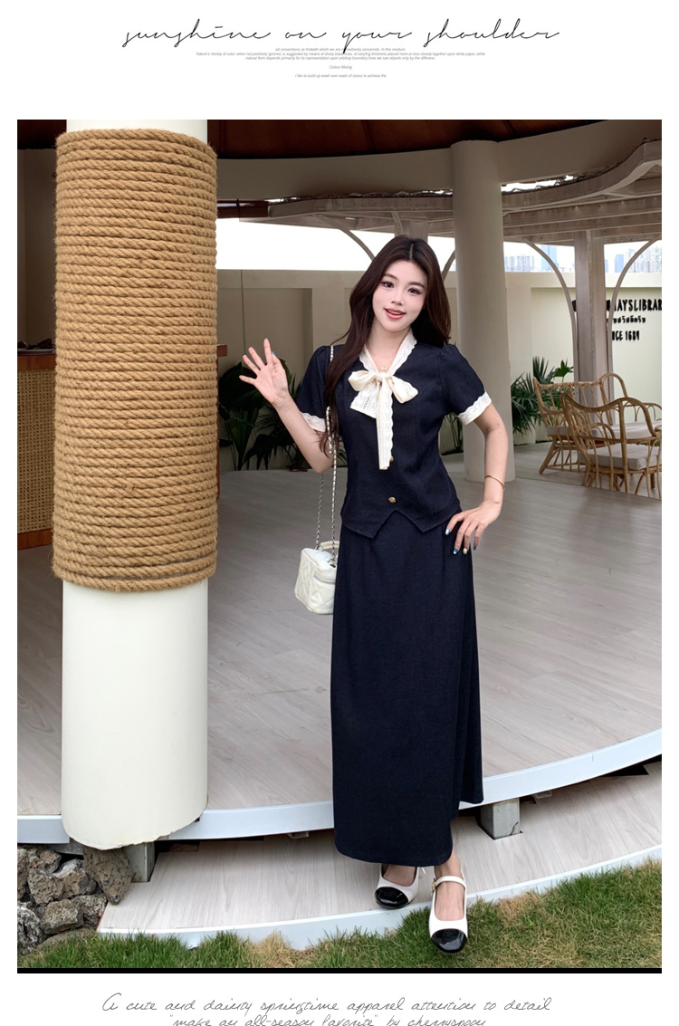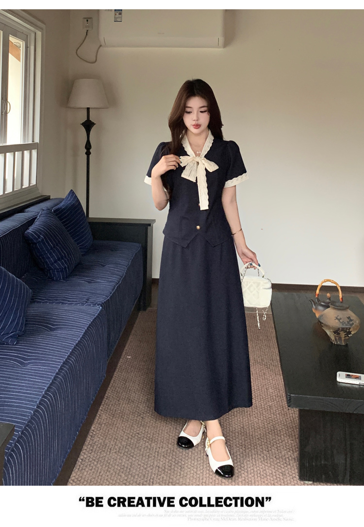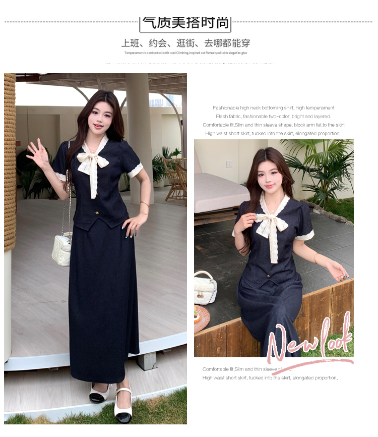 RY3301# 实拍大码女装夏季新款小香风蝴蝶结设计收腰显瘦上衣半身裙两件套