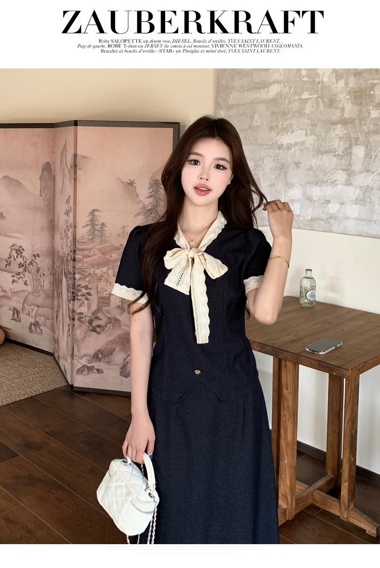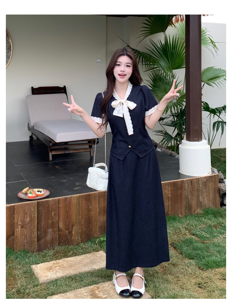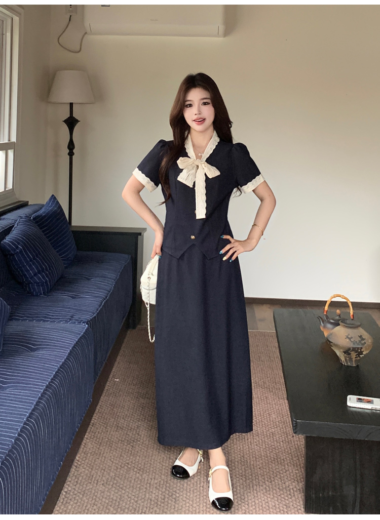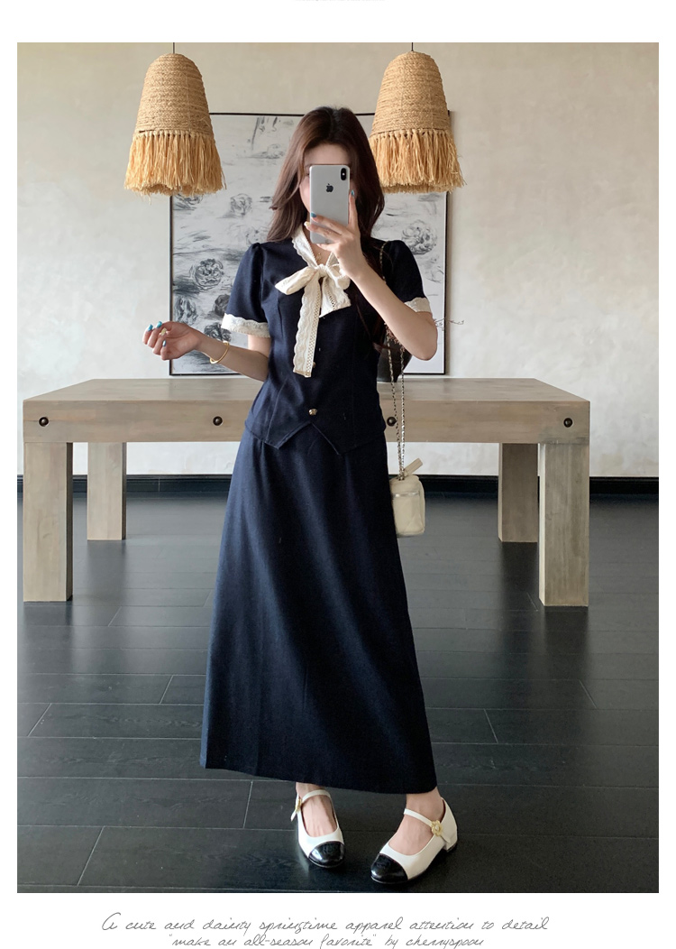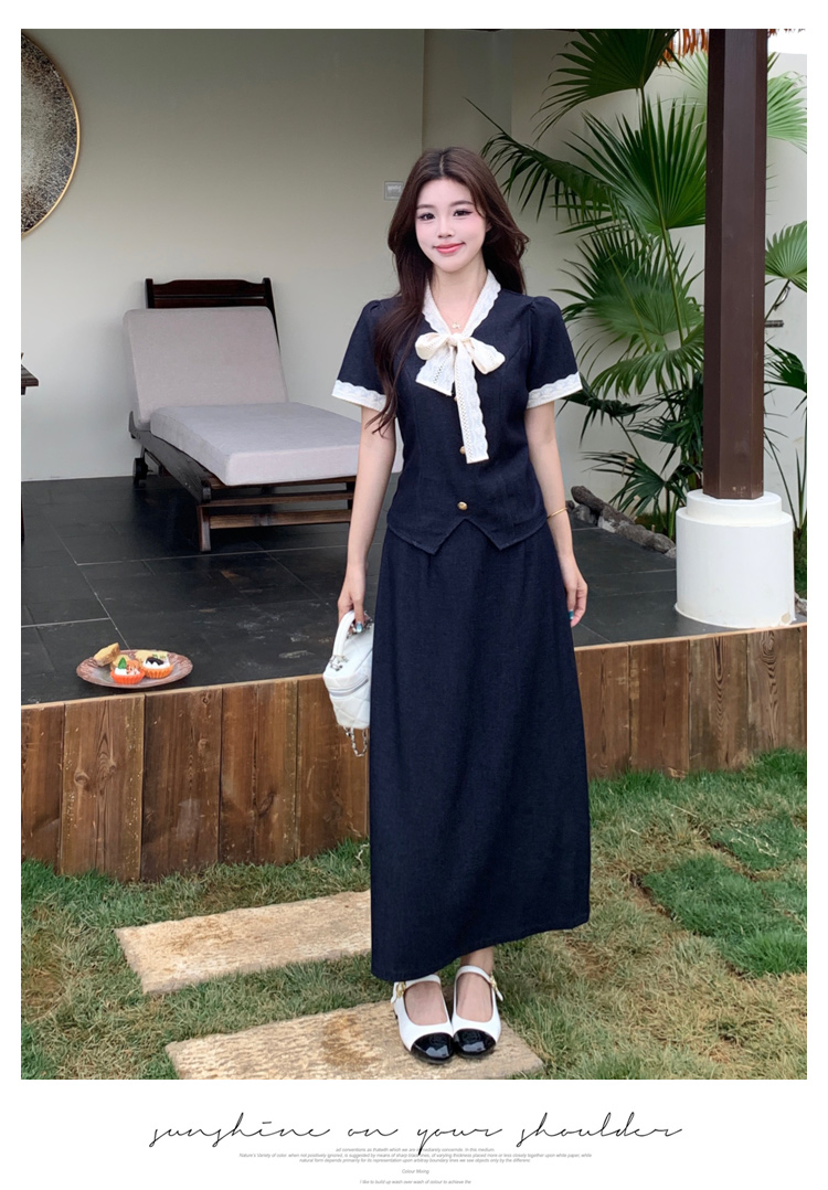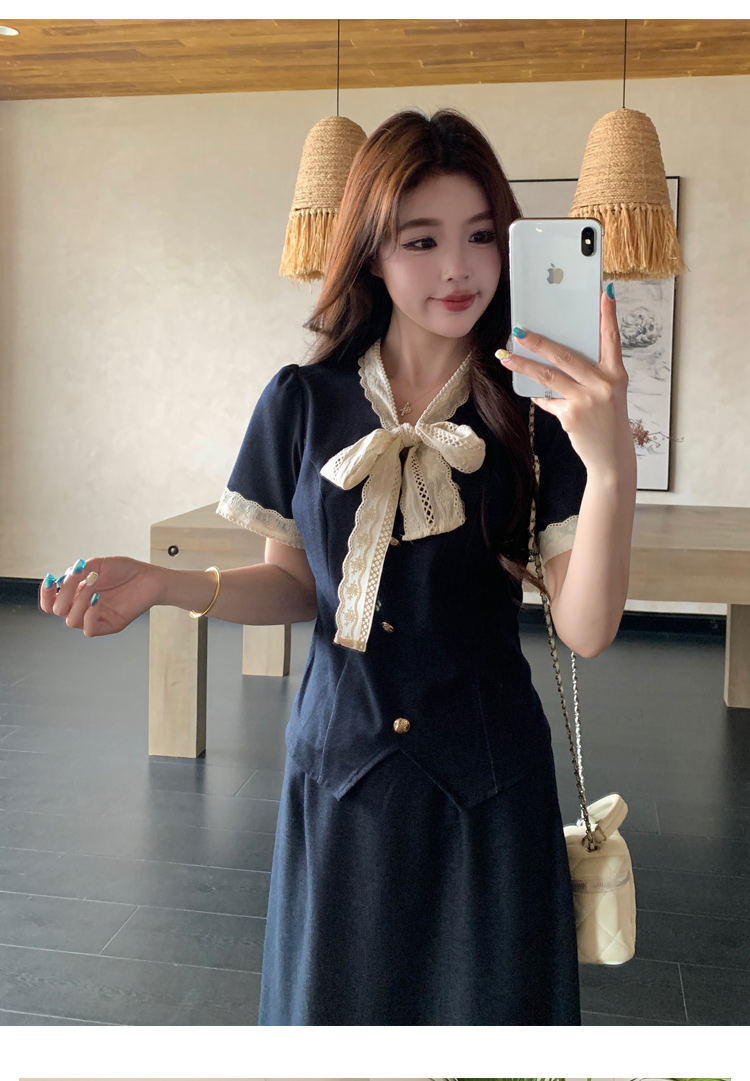 RY3301# 实拍大码女装夏季新款小香风蝴蝶结设计收腰显瘦上衣半身裙两件套