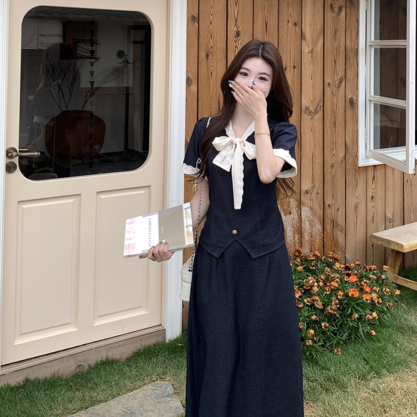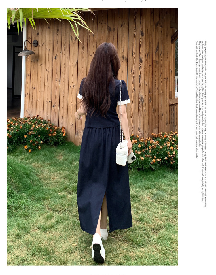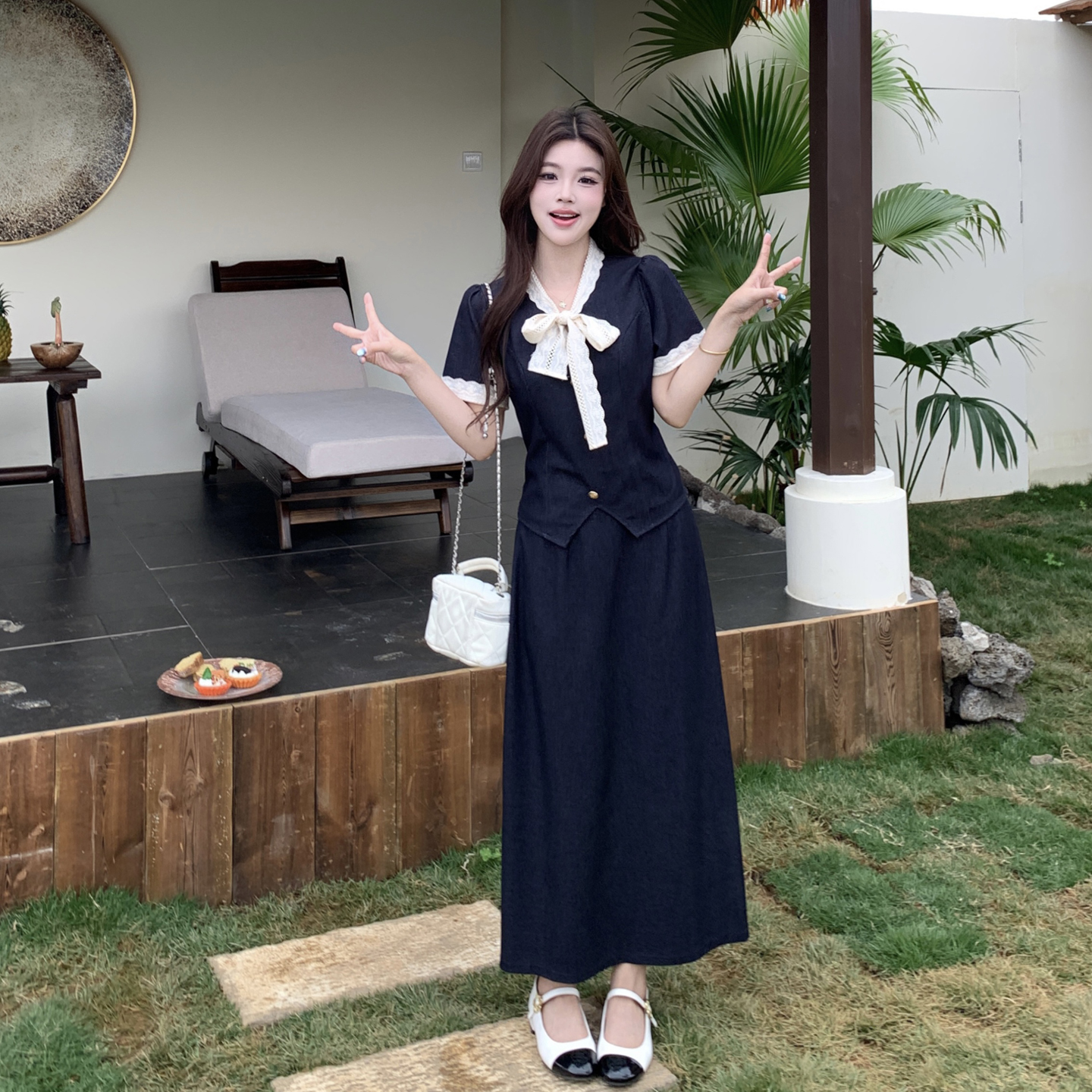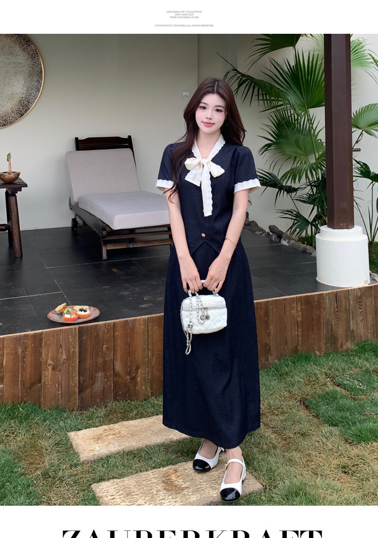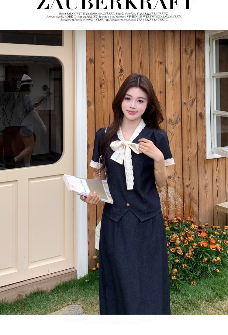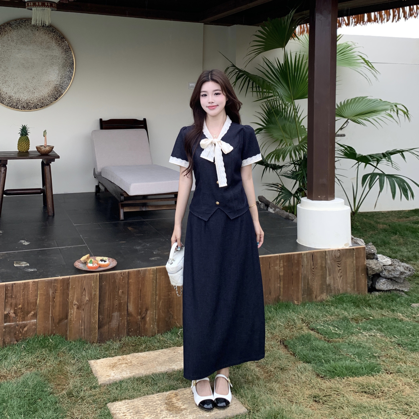 RY3301# 实拍大码女装夏季新款小香风蝴蝶结设计收腰显瘦上衣半身裙两件套