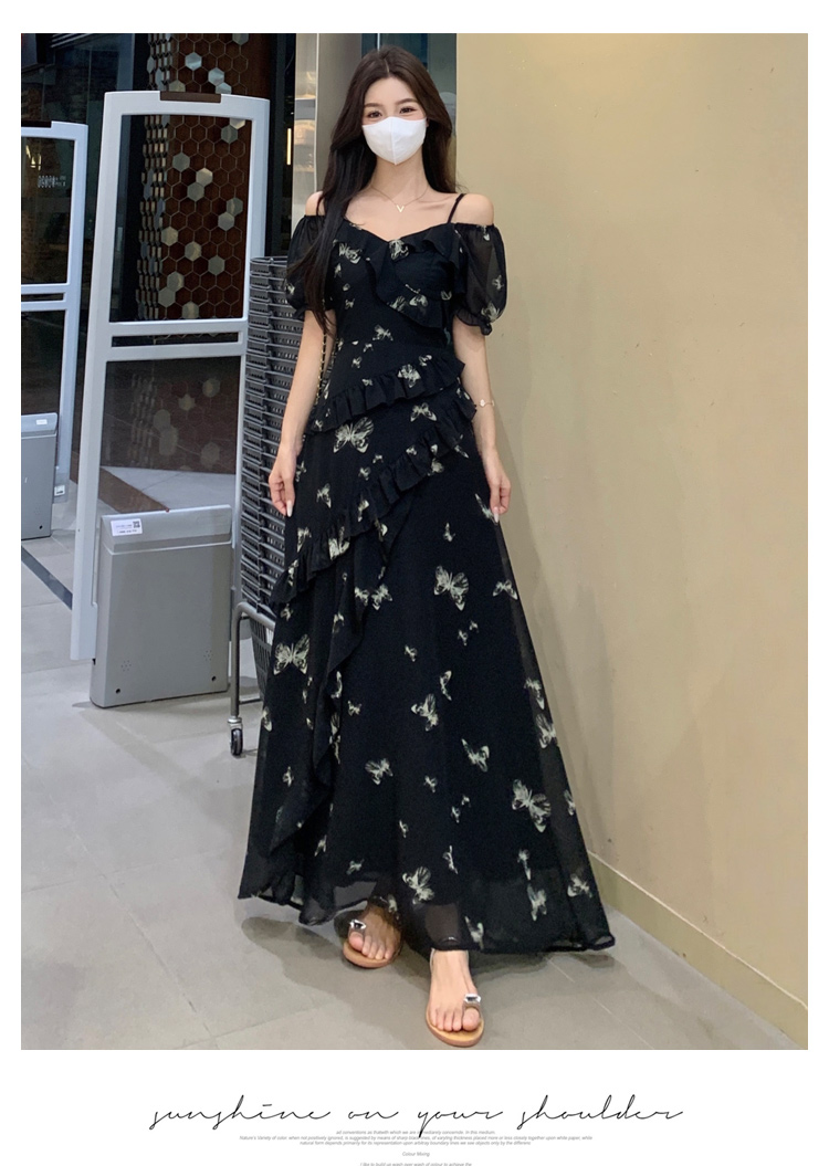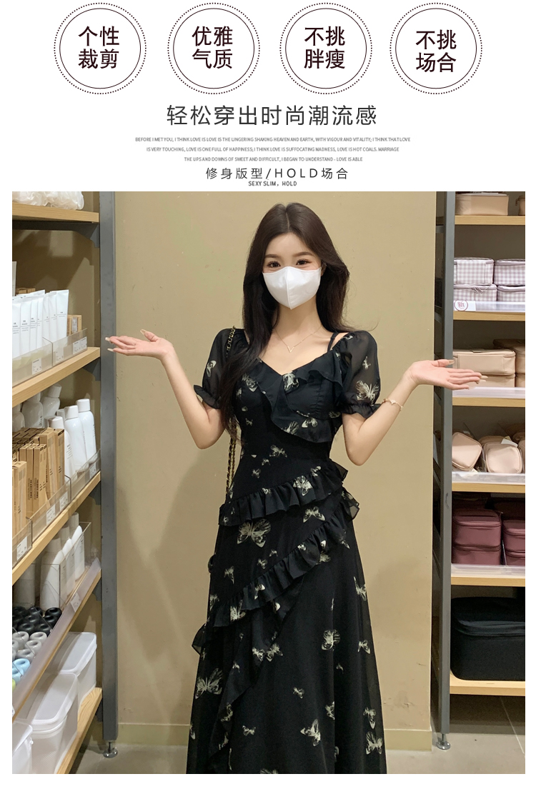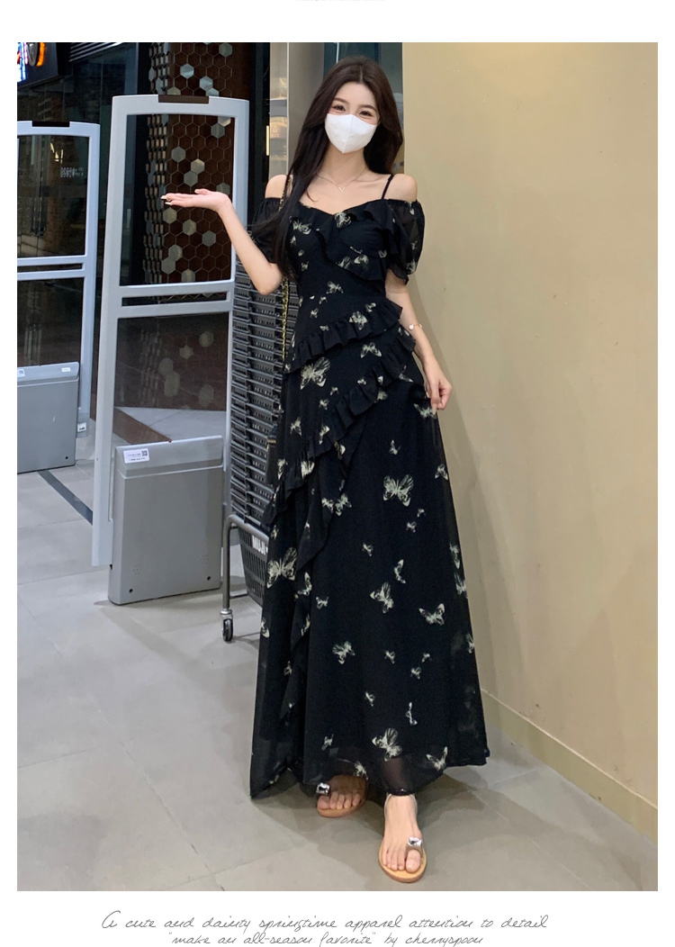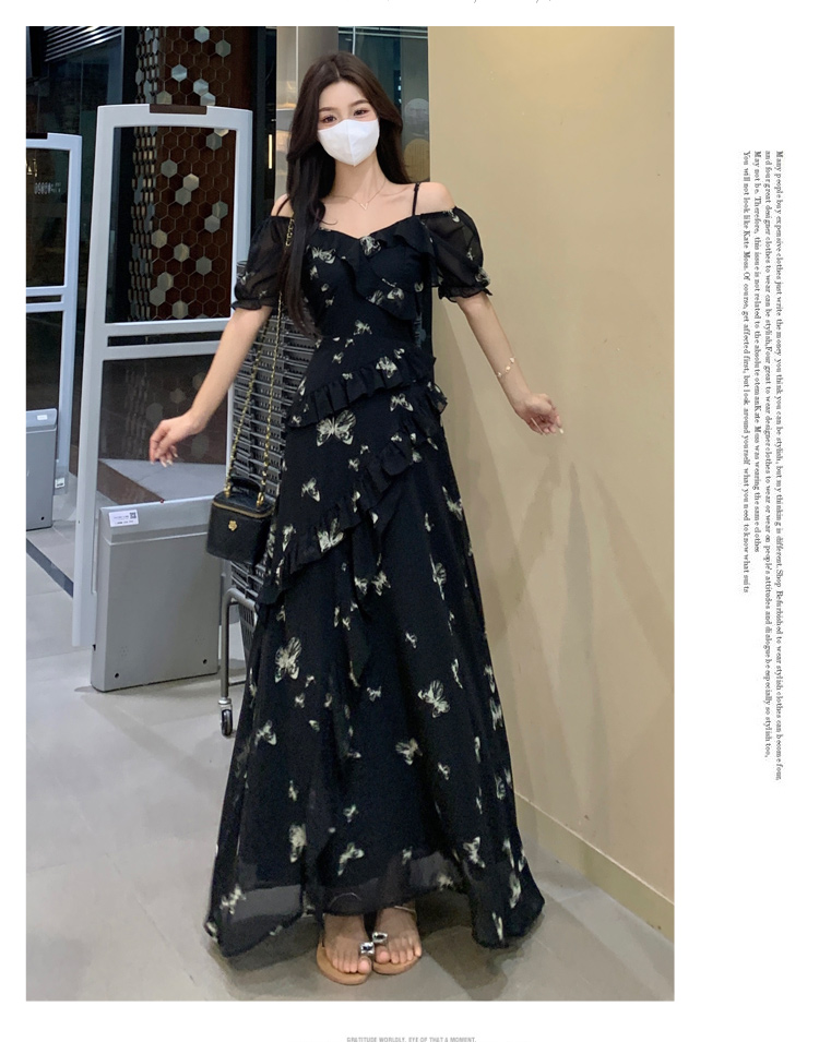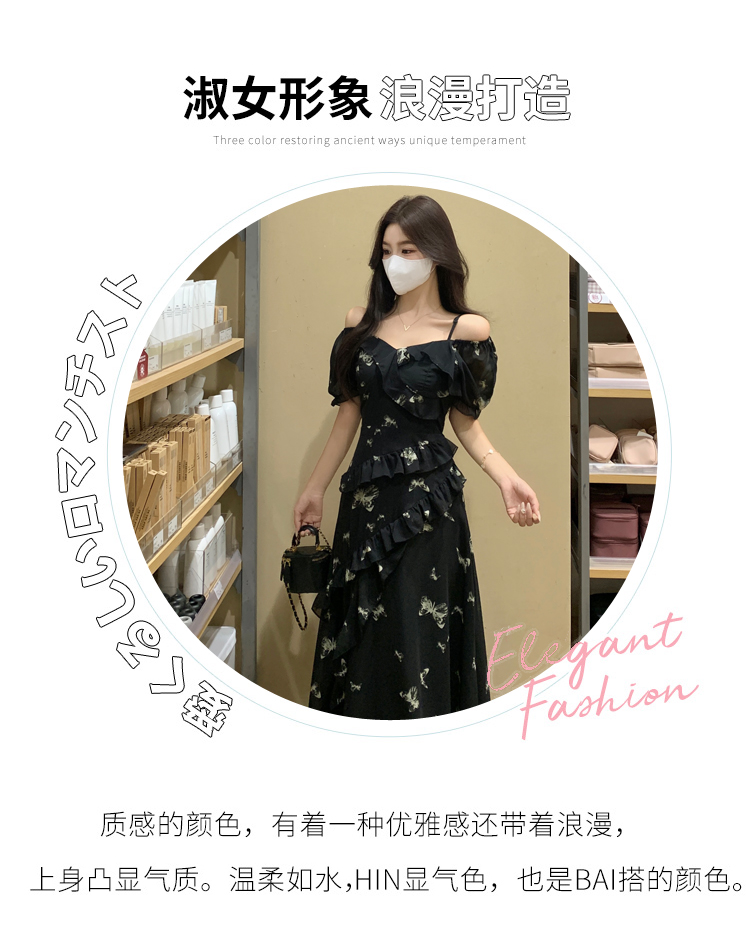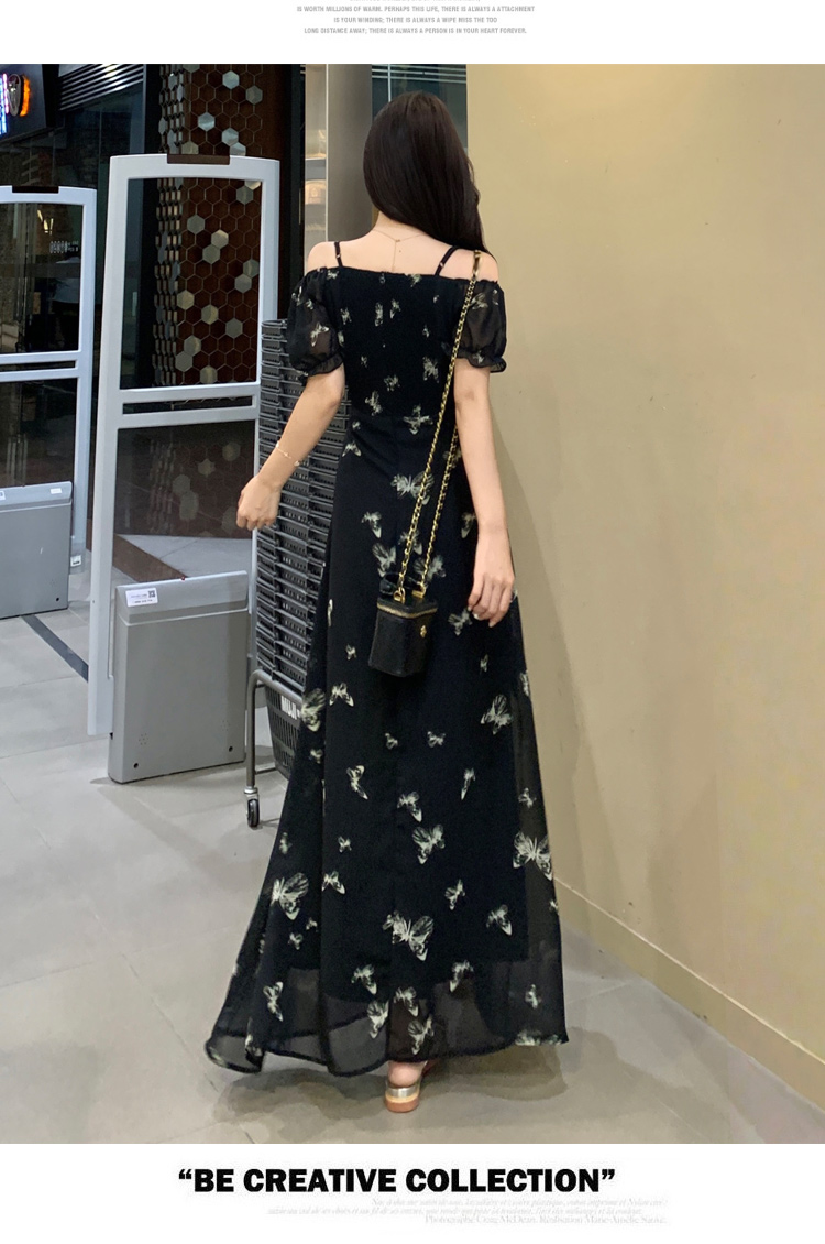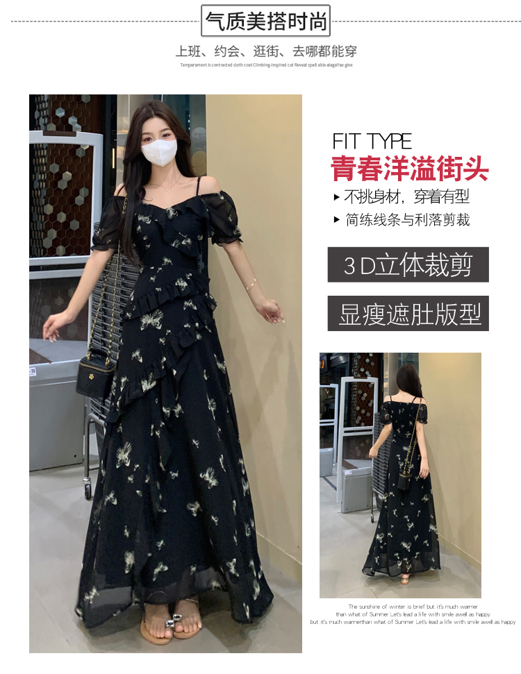 RY3302# 实拍~大码女装夏季不规则印花连衣裙露肩两穿蝴蝶碎花显瘦长裙
