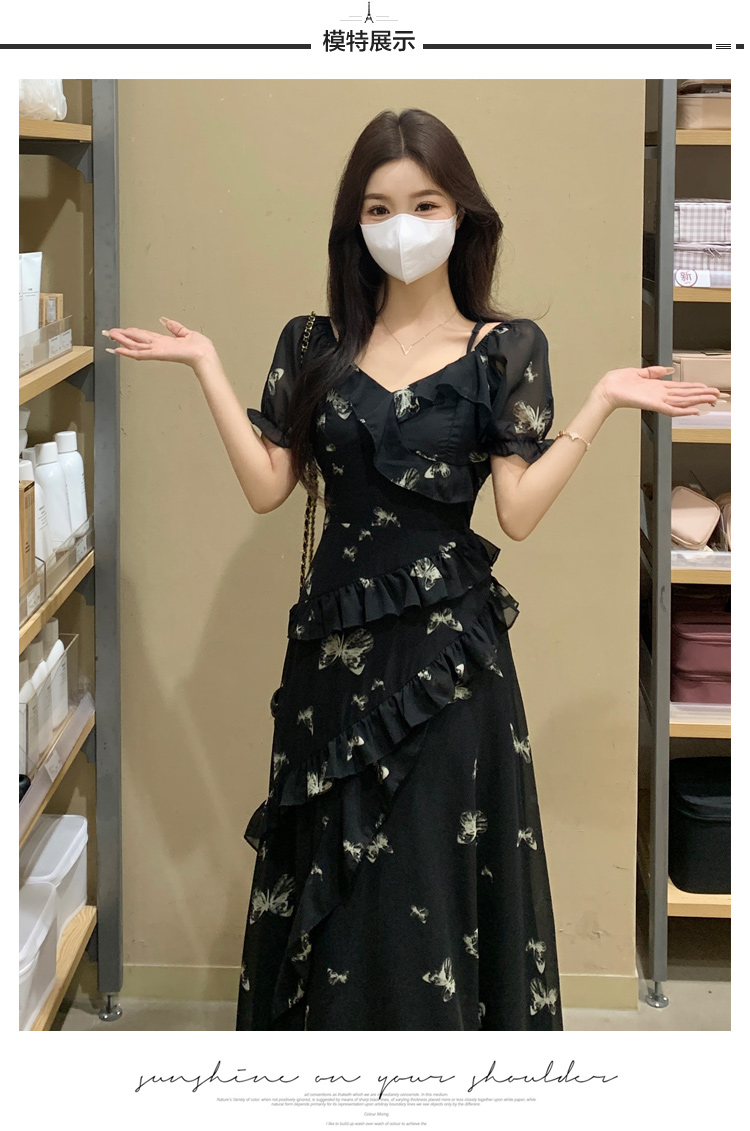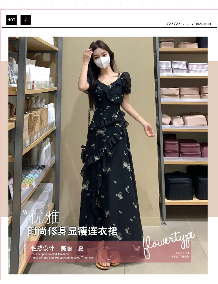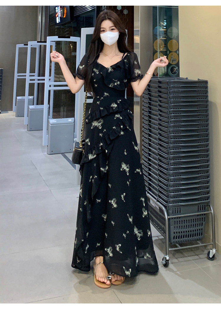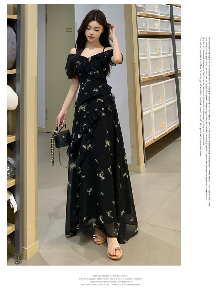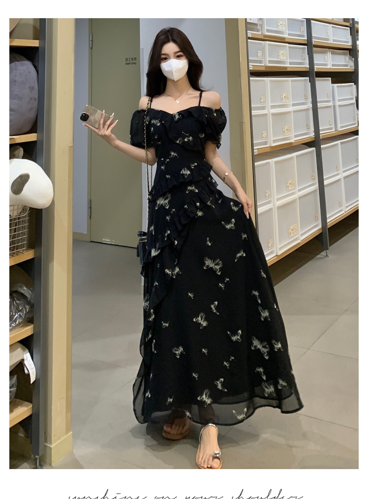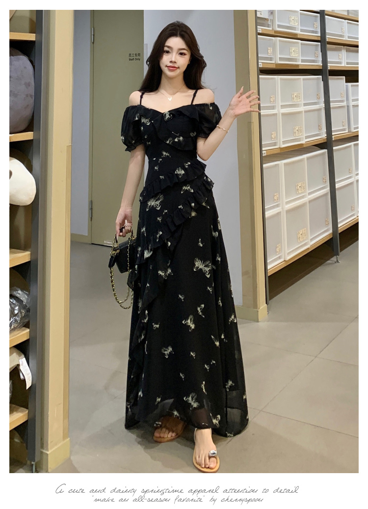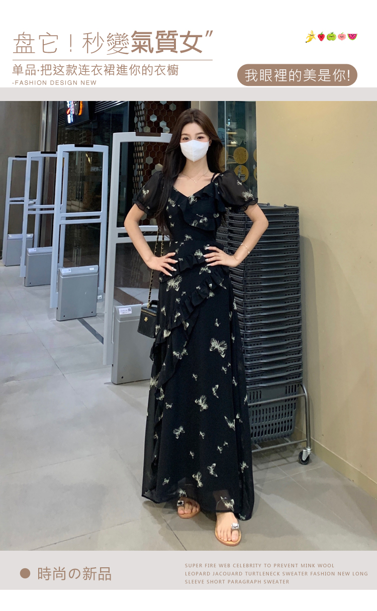 RY3302# 实拍~大码女装夏季不规则印花连衣裙露肩两穿蝴蝶碎花显瘦长裙