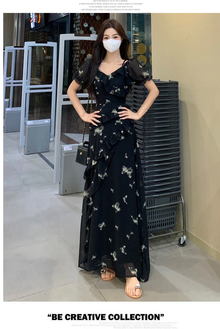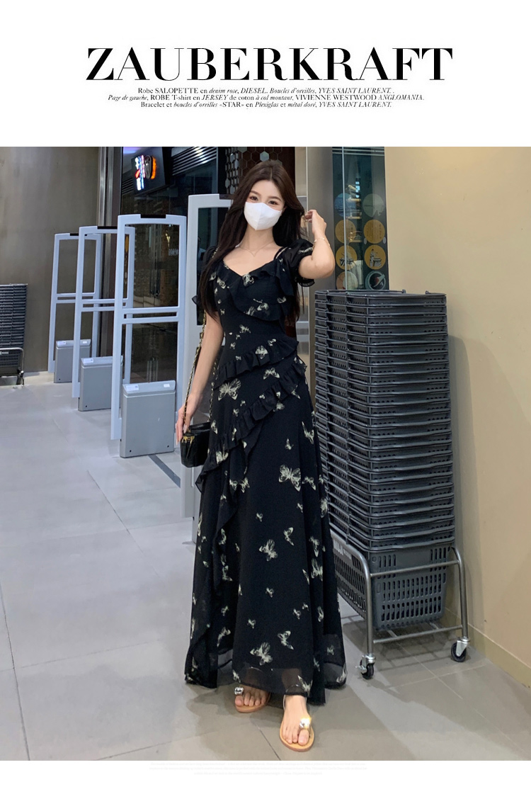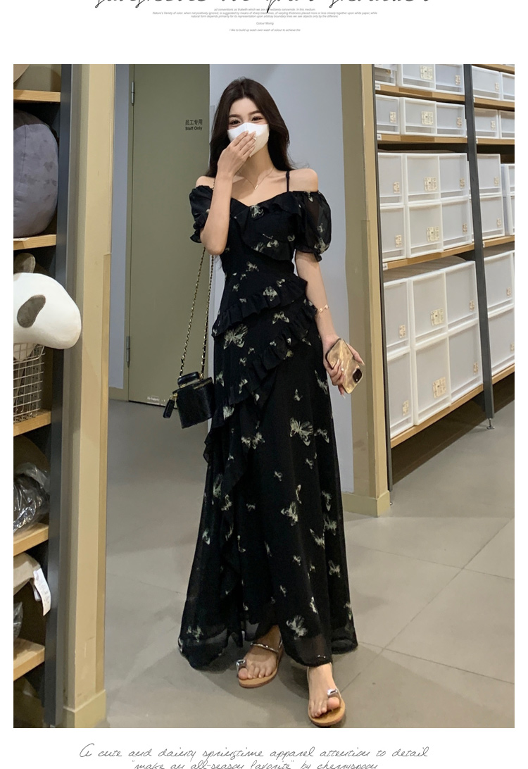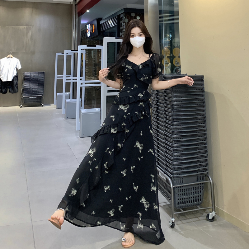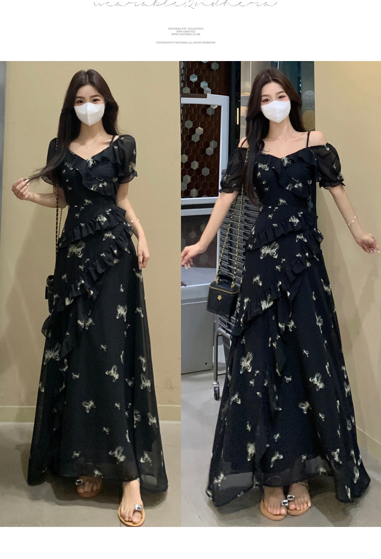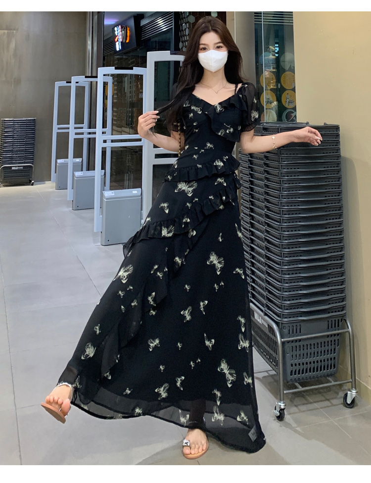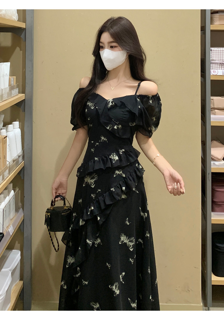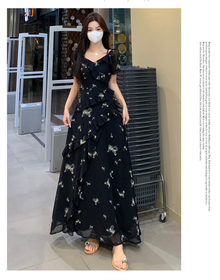 RY3302# 实拍~大码女装夏季不规则印花连衣裙露肩两穿蝴蝶碎花显瘦长裙