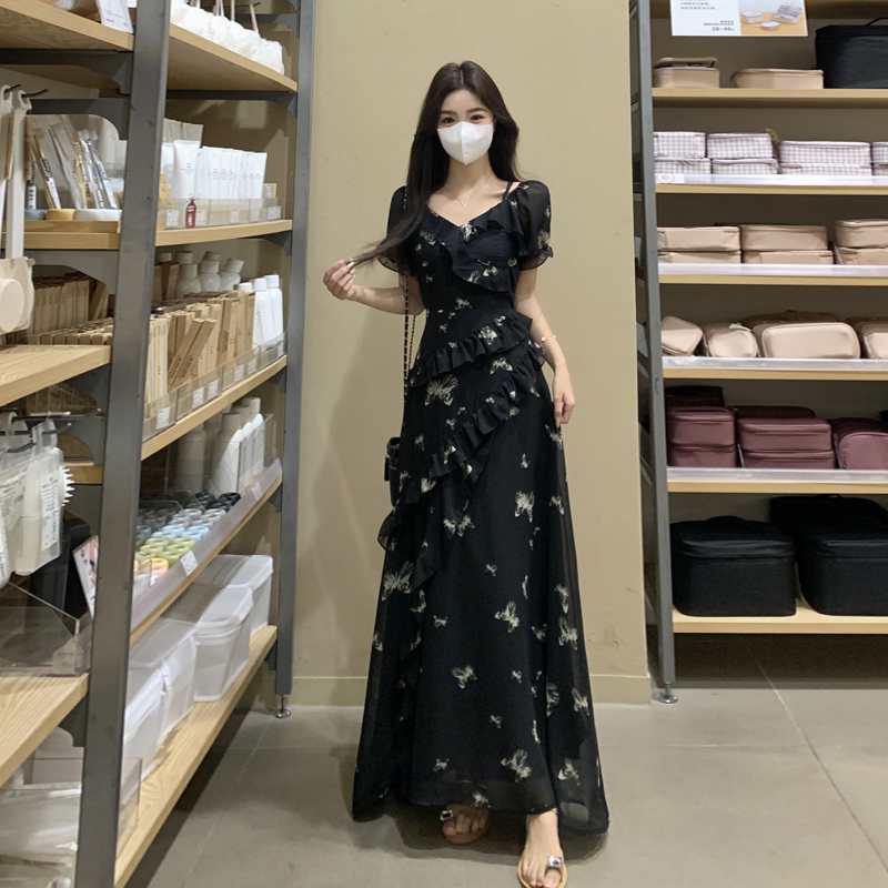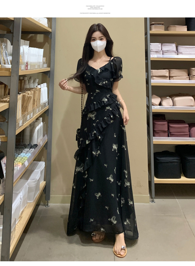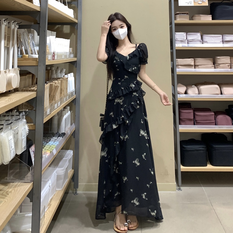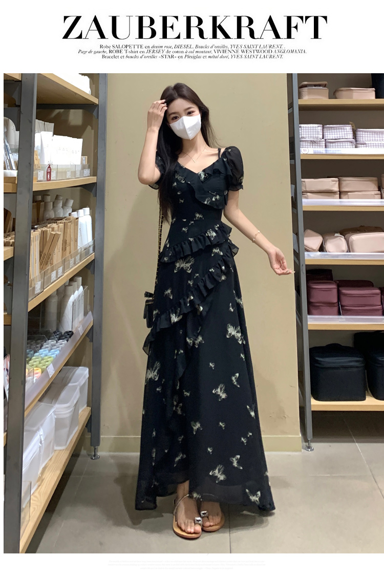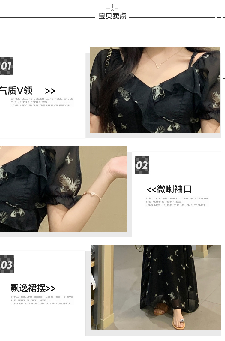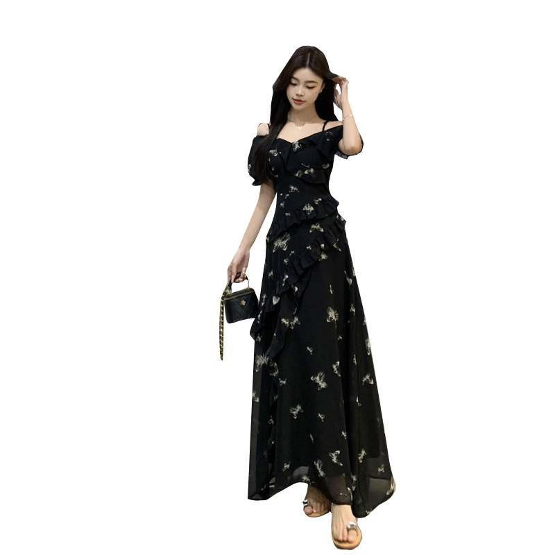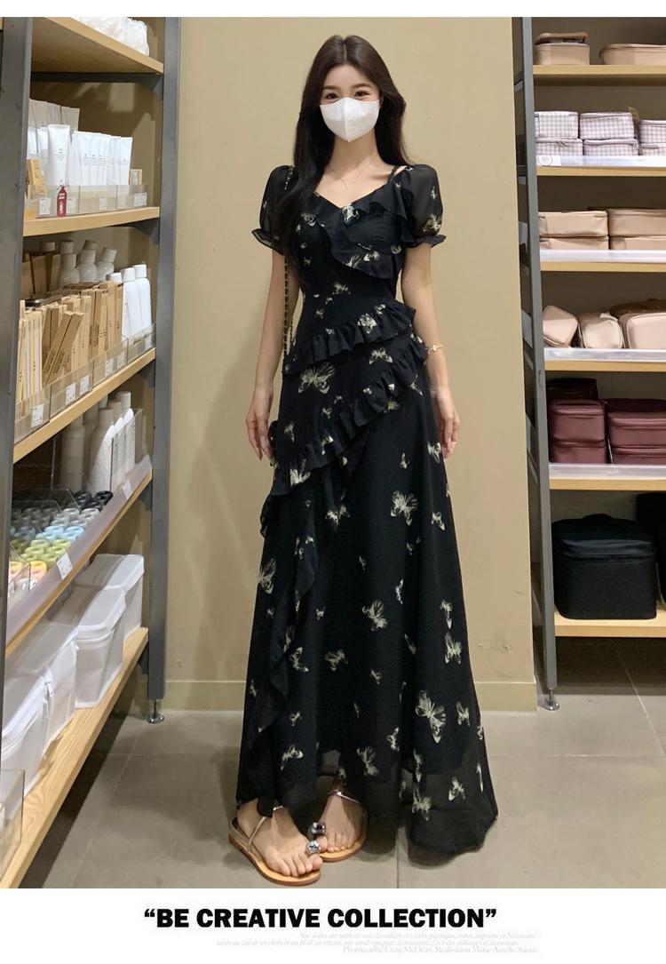 RY3302# 实拍~大码女装夏季不规则印花连衣裙露肩两穿蝴蝶碎花显瘦长裙