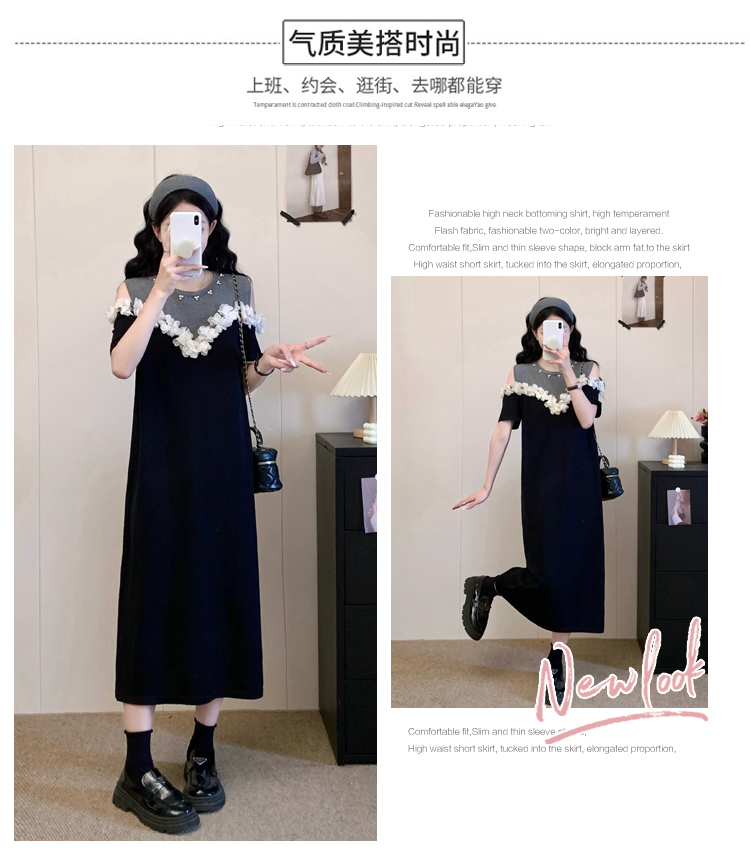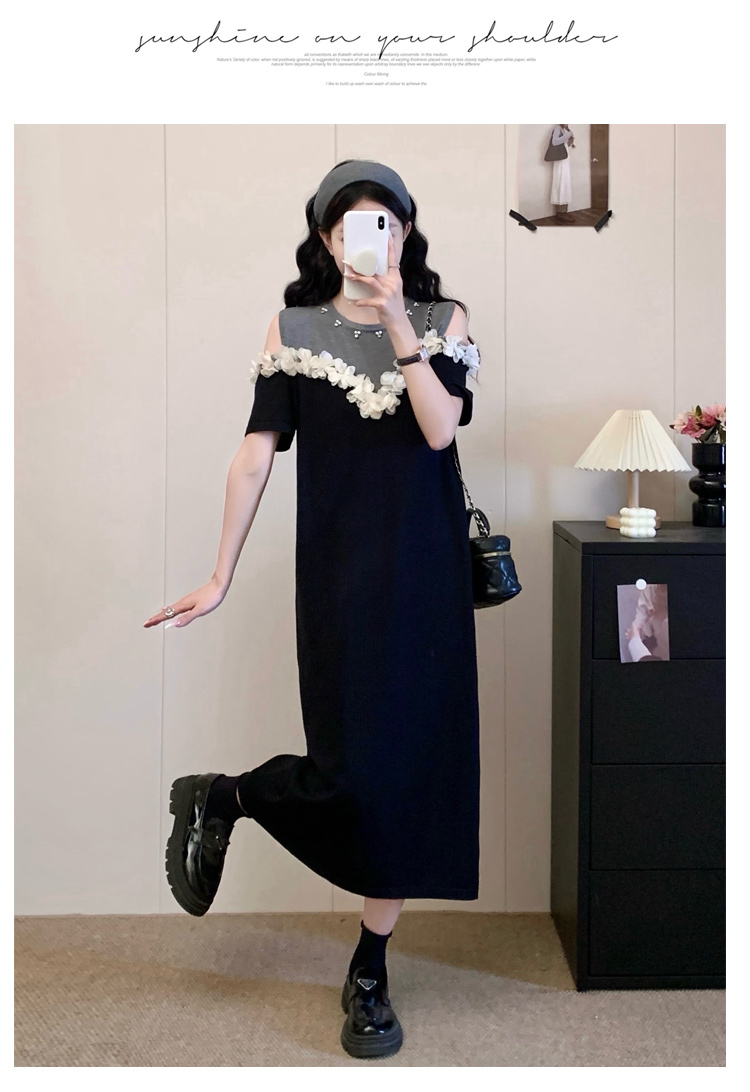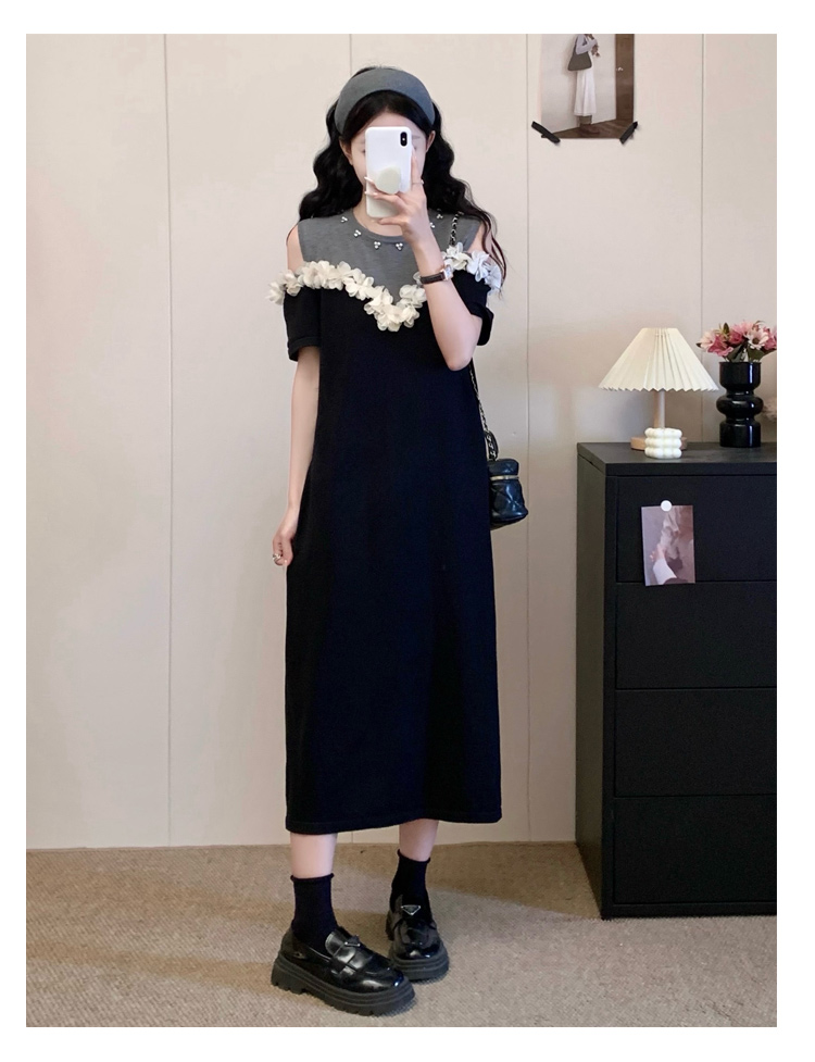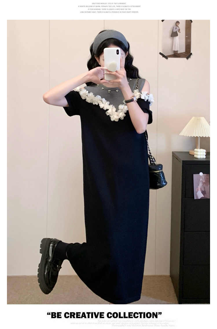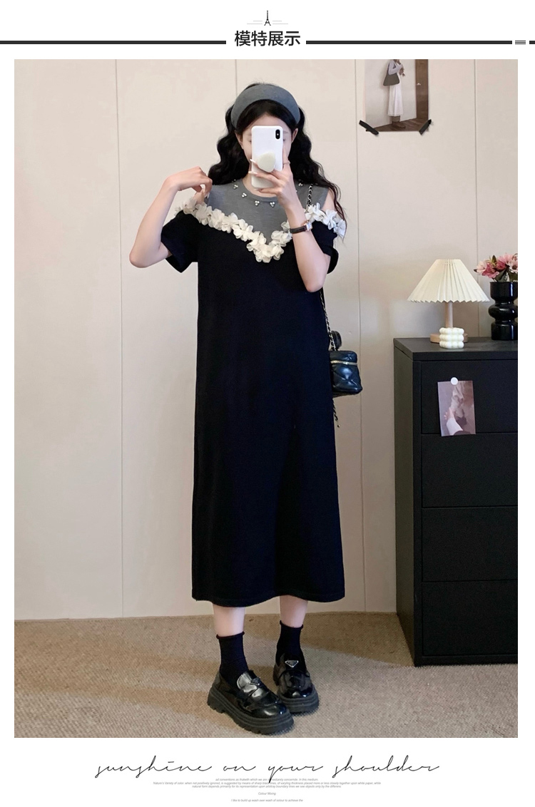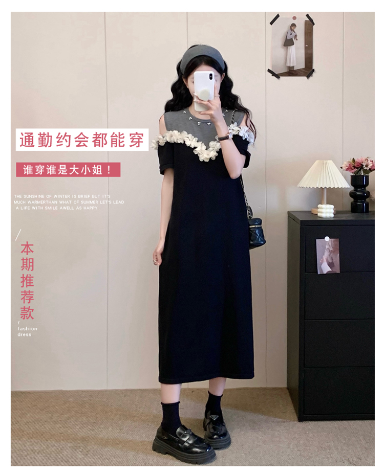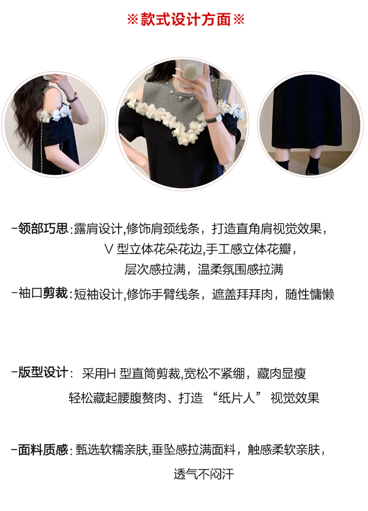 RY3304# 实拍~露肩立体花朵设计大码女装连衣裙宽松中长款显瘦裙子