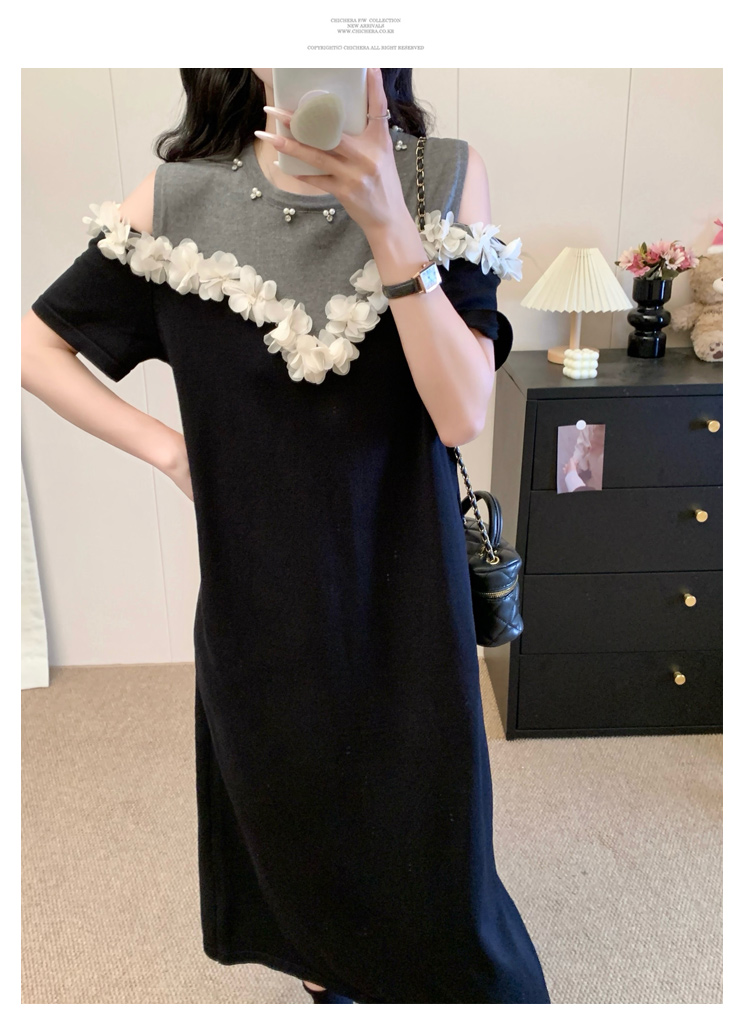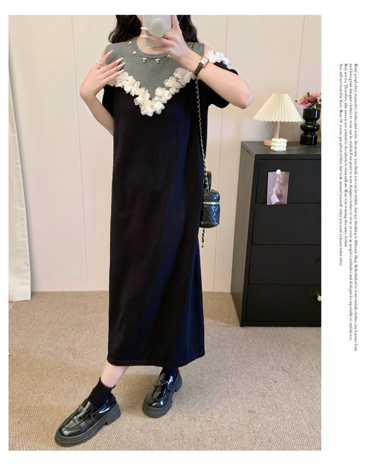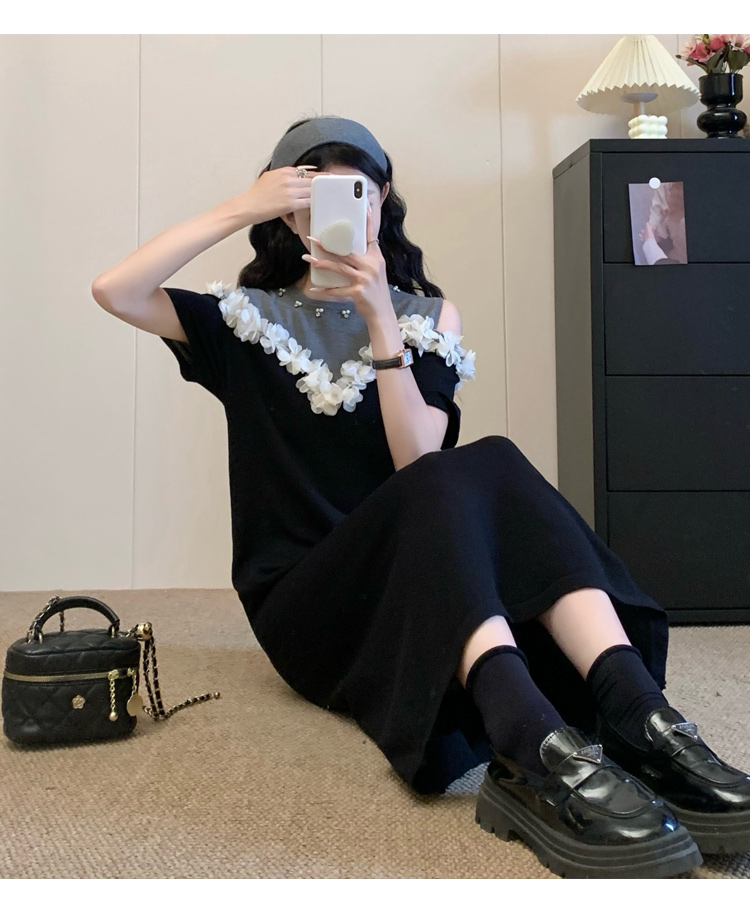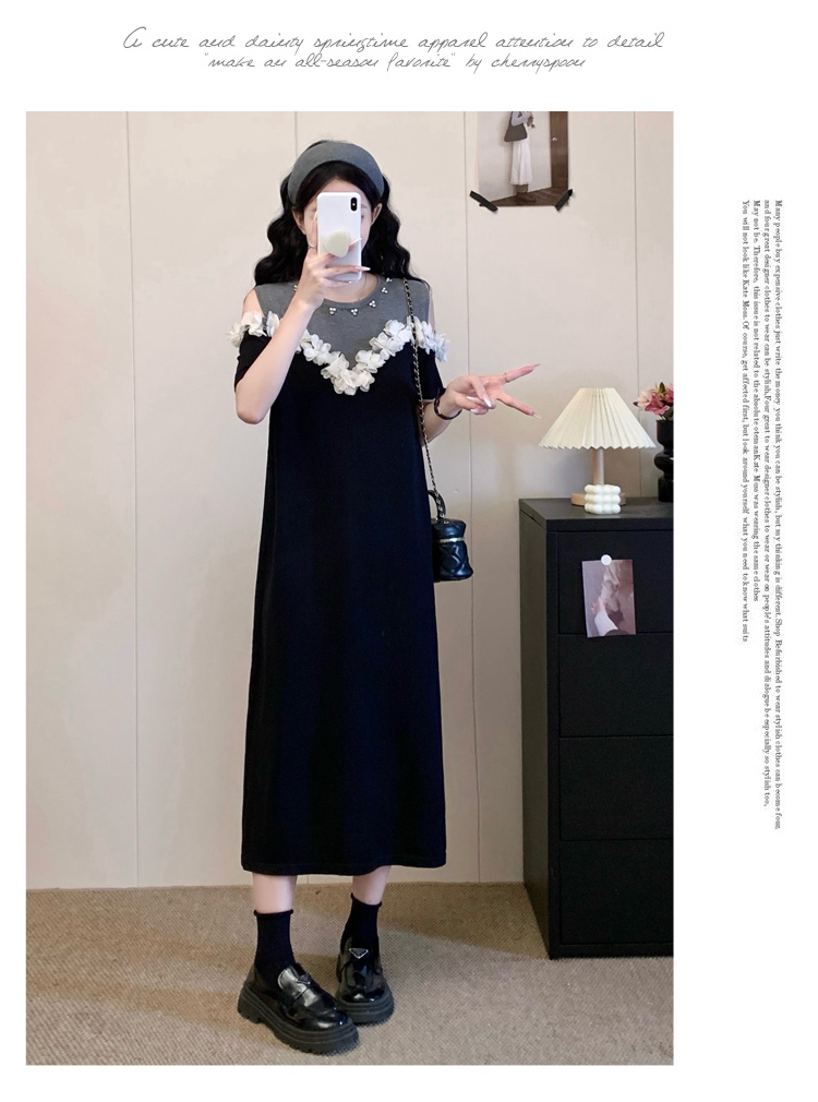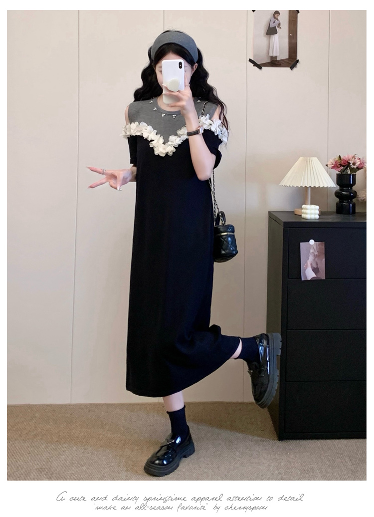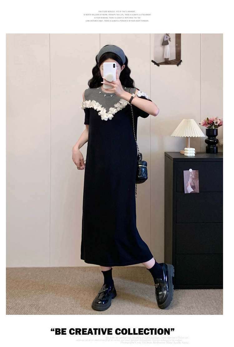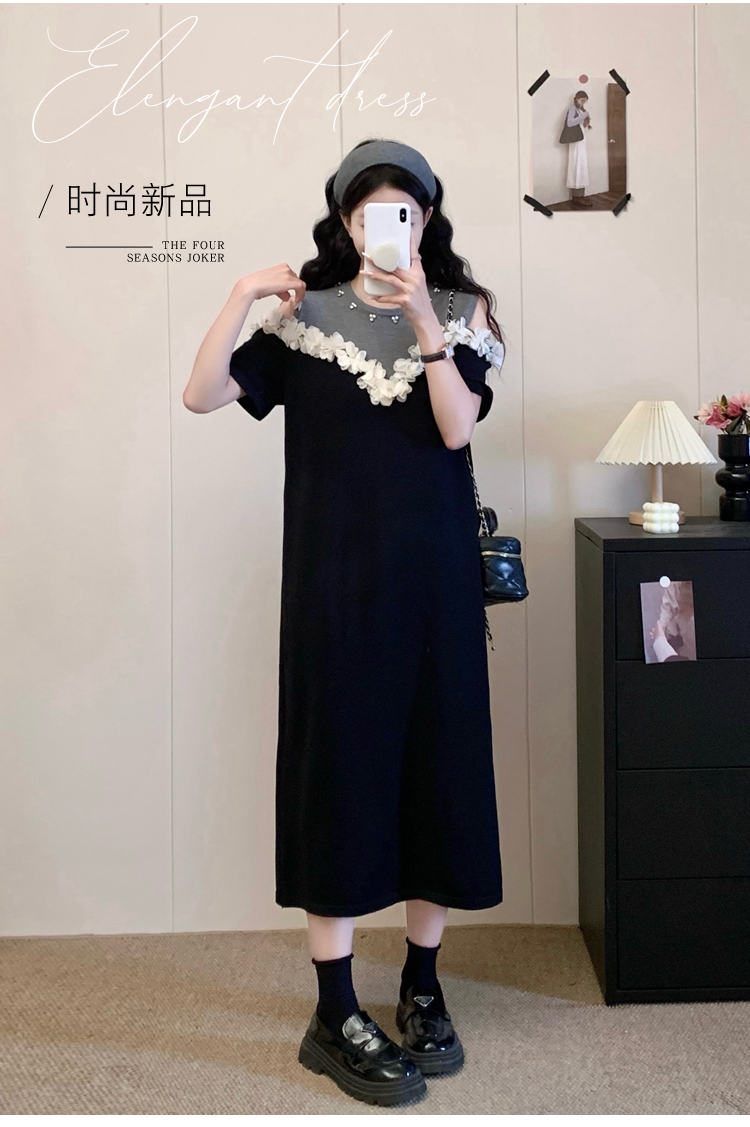 RY3304# 实拍~露肩立体花朵设计大码女装连衣裙宽松中长款显瘦裙子