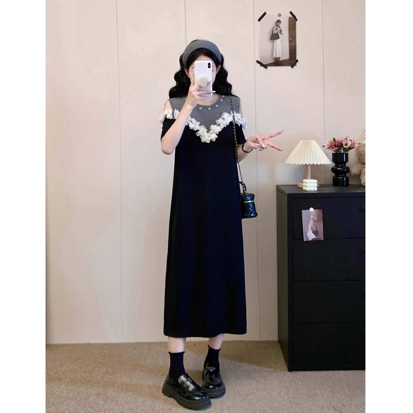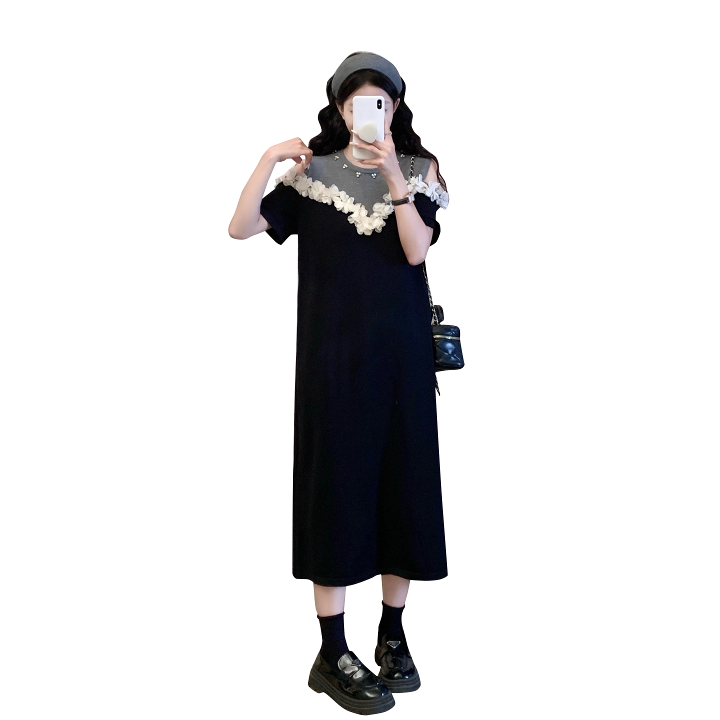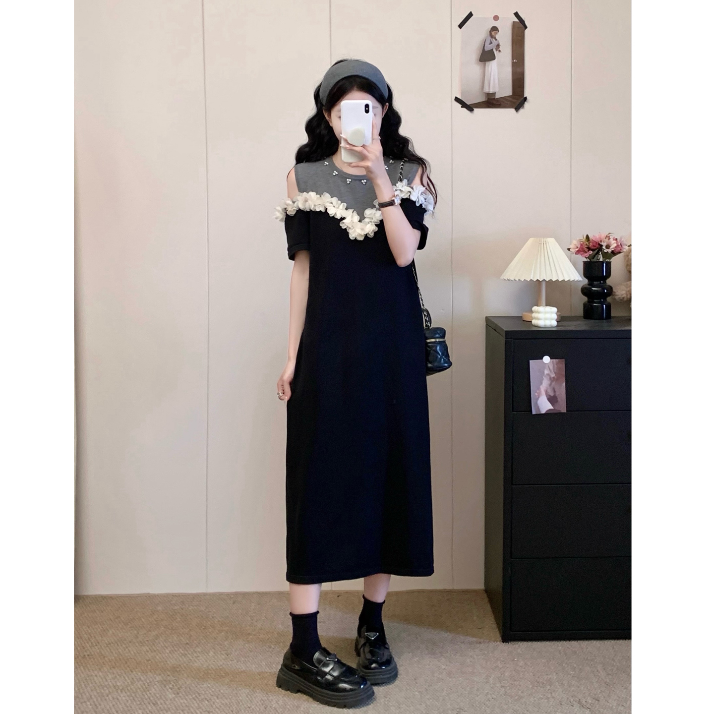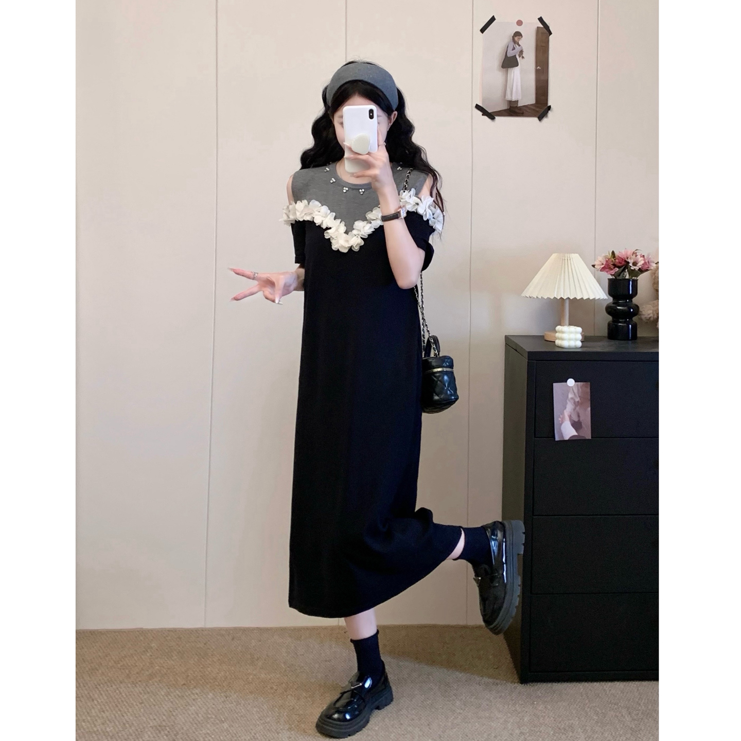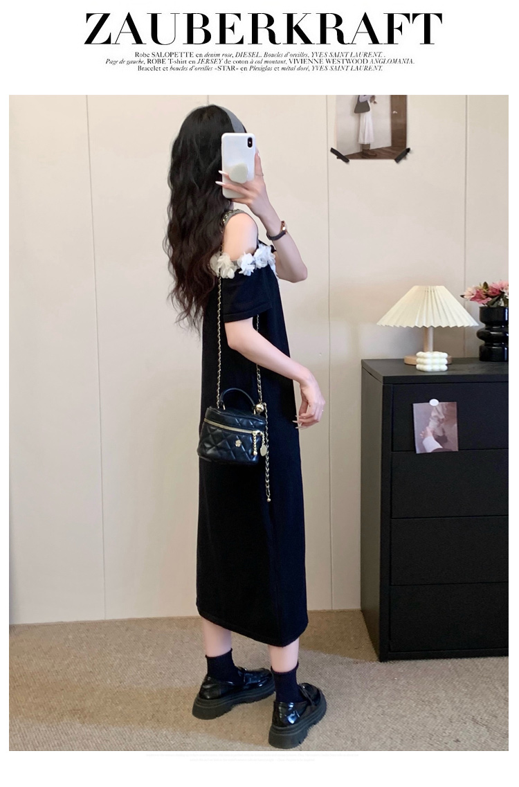 RY3304# 实拍~露肩立体花朵设计大码女装连衣裙宽松中长款显瘦裙子