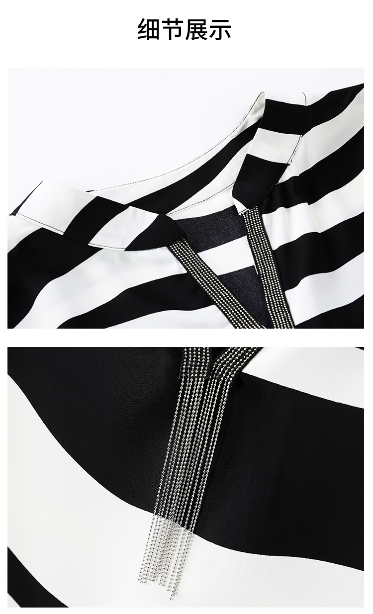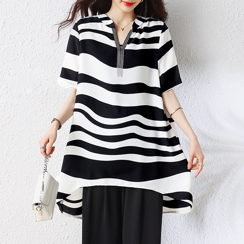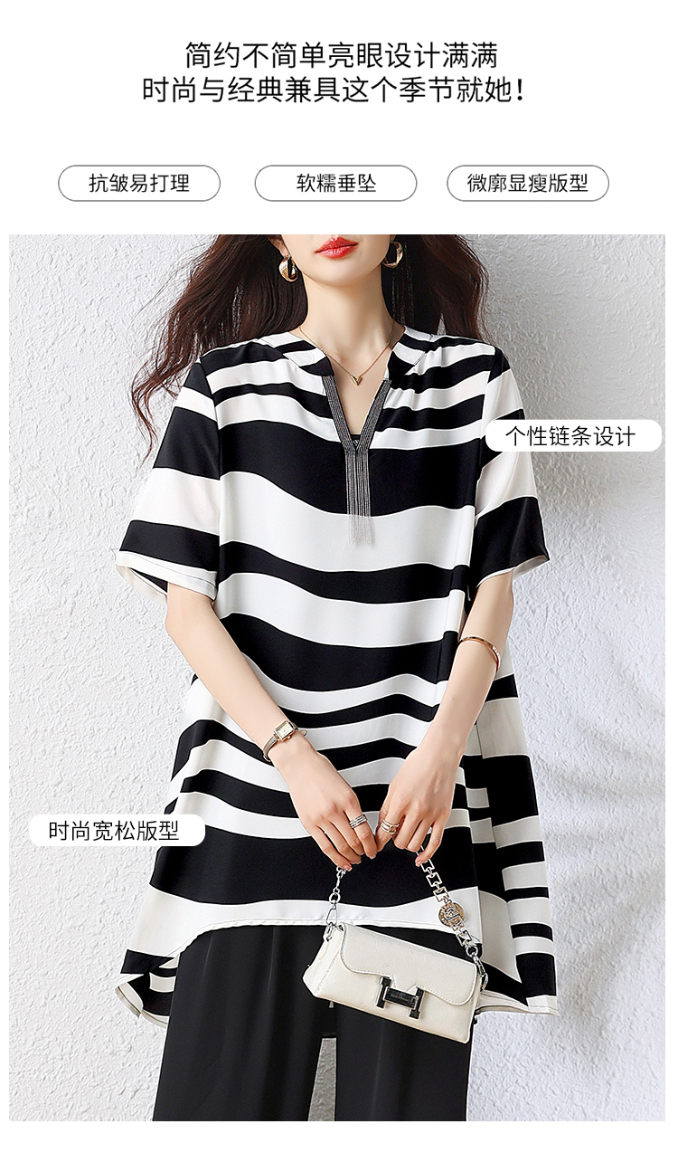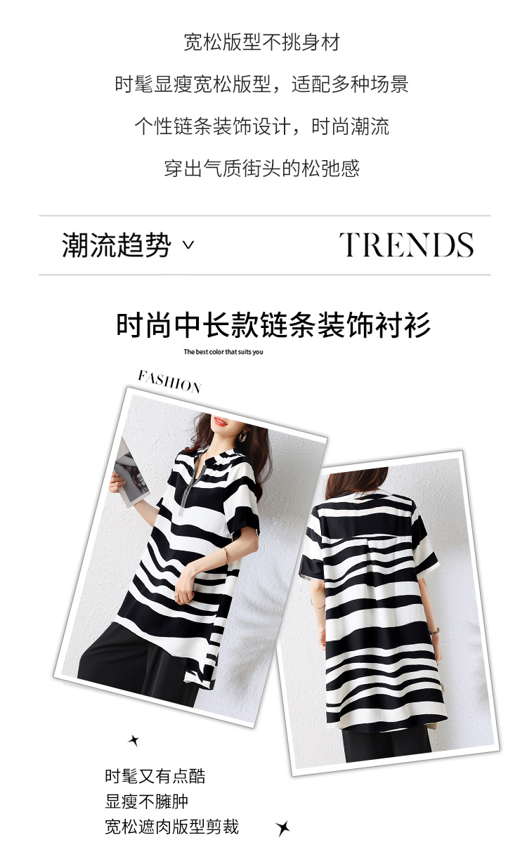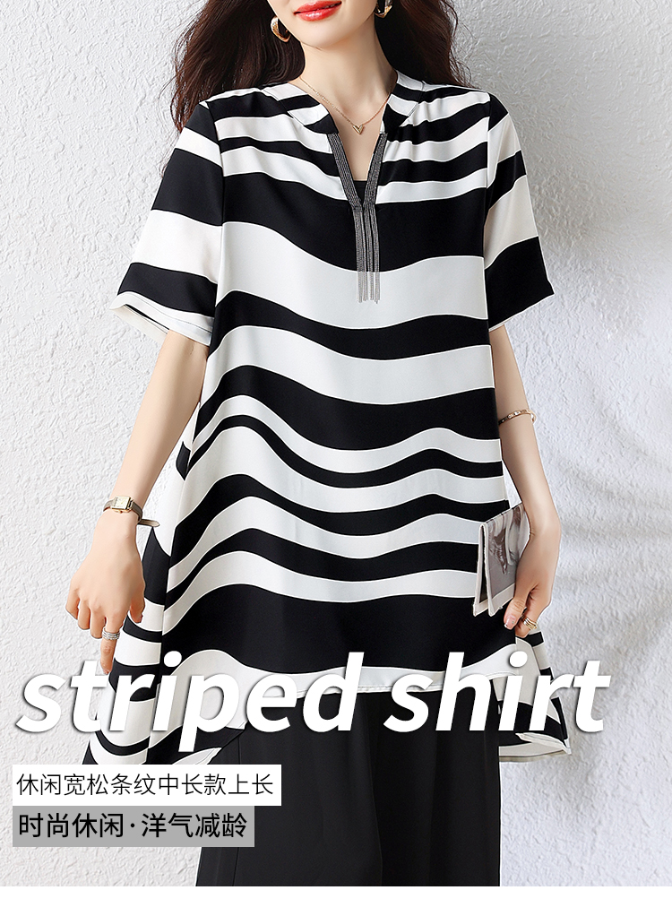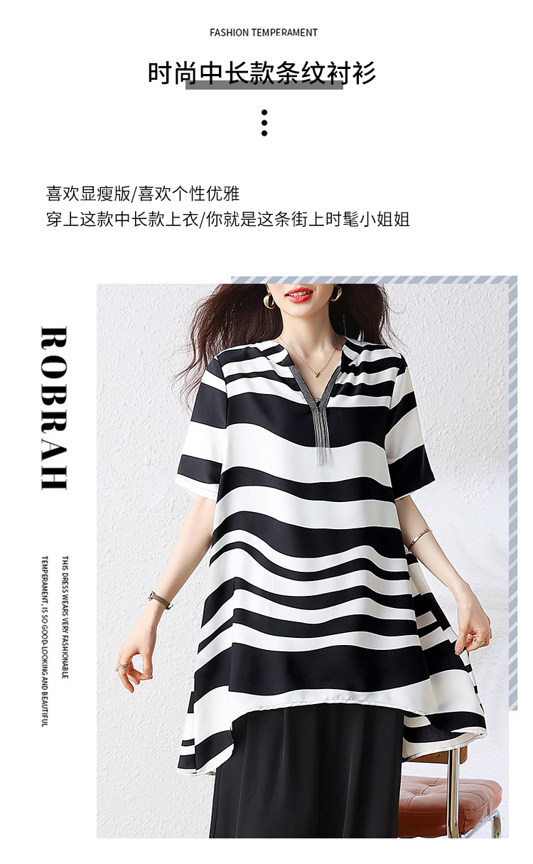 RY3310# 实拍2026夏季新款流苏宽松黑白条气质短袖中长款时尚衬衫上衣女