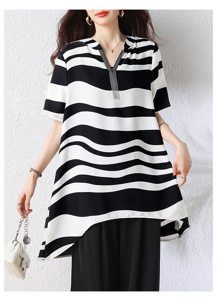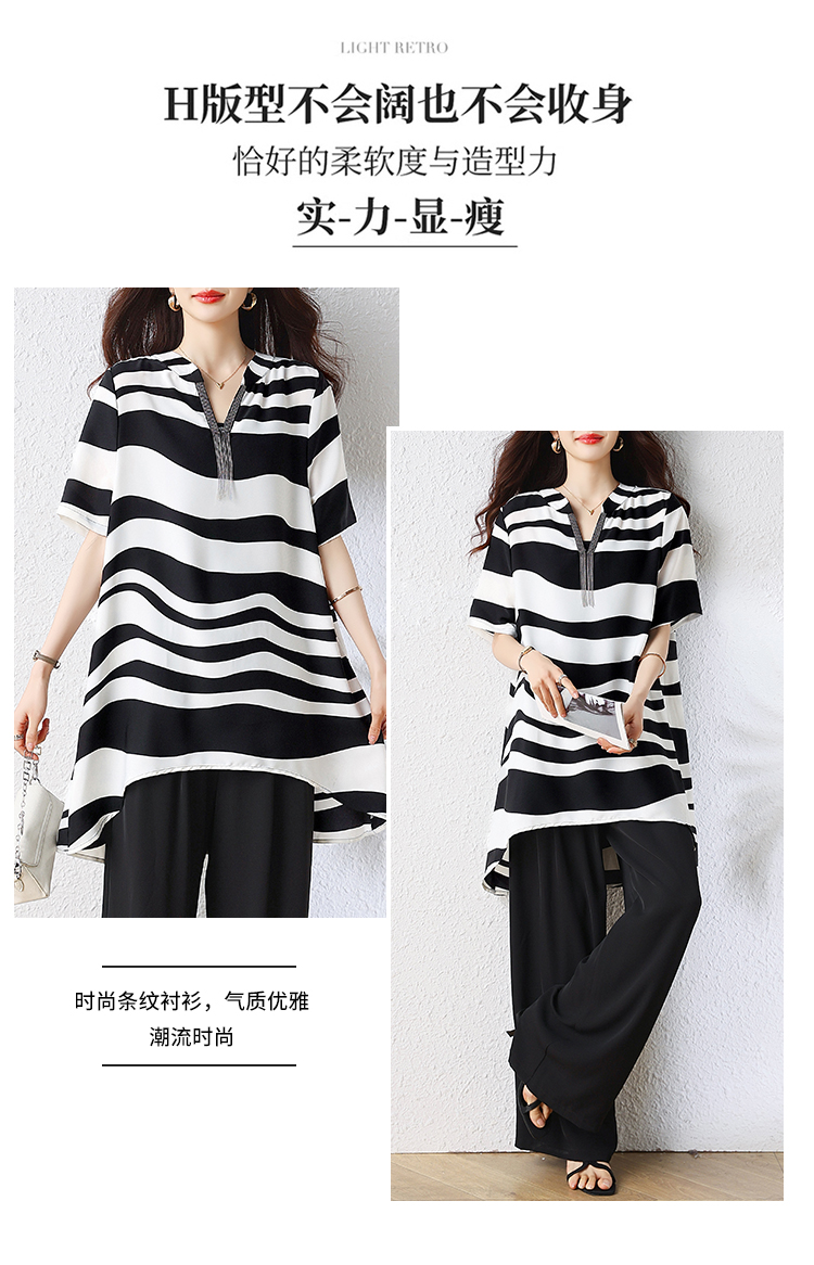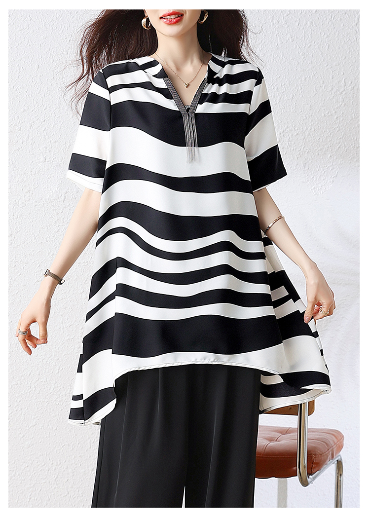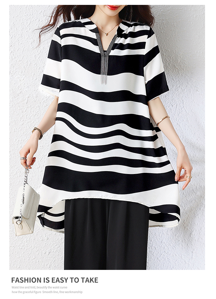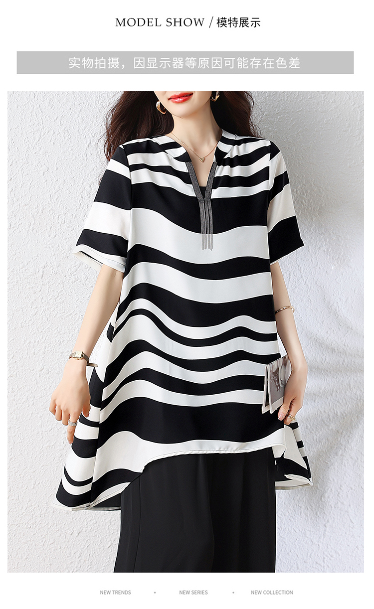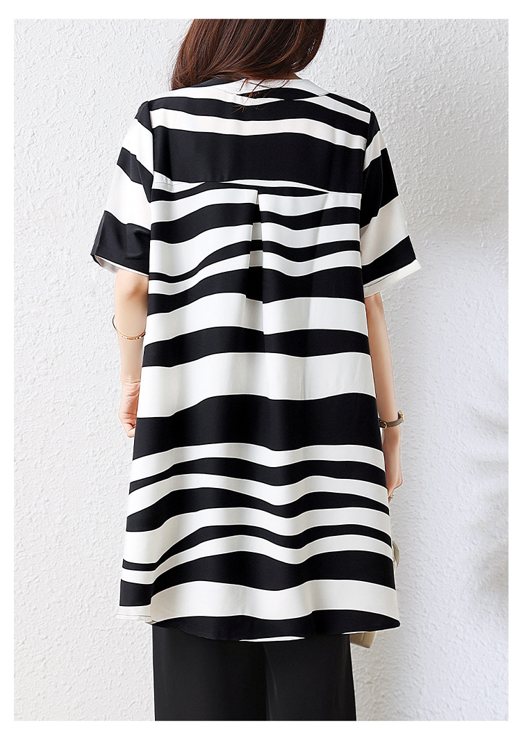 RY3310# 实拍2026夏季新款流苏宽松黑白条气质短袖中长款时尚衬衫上衣女