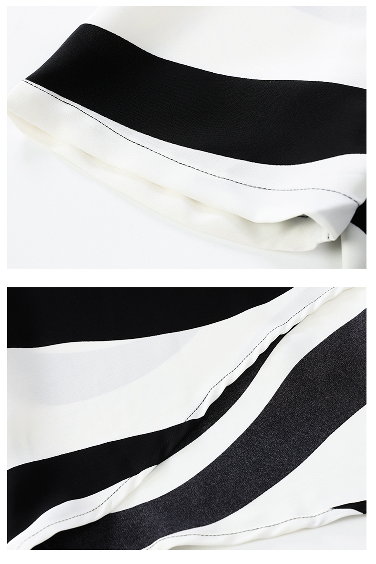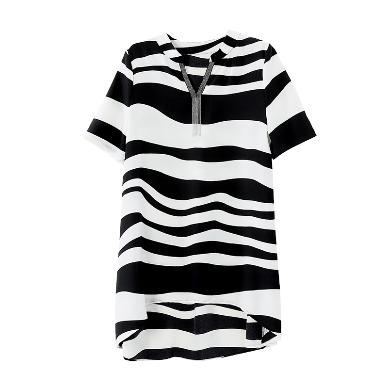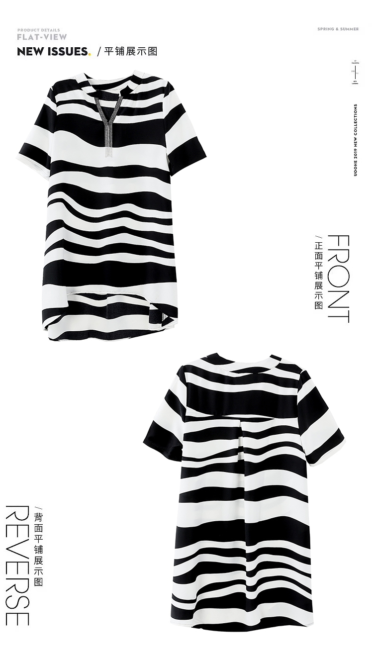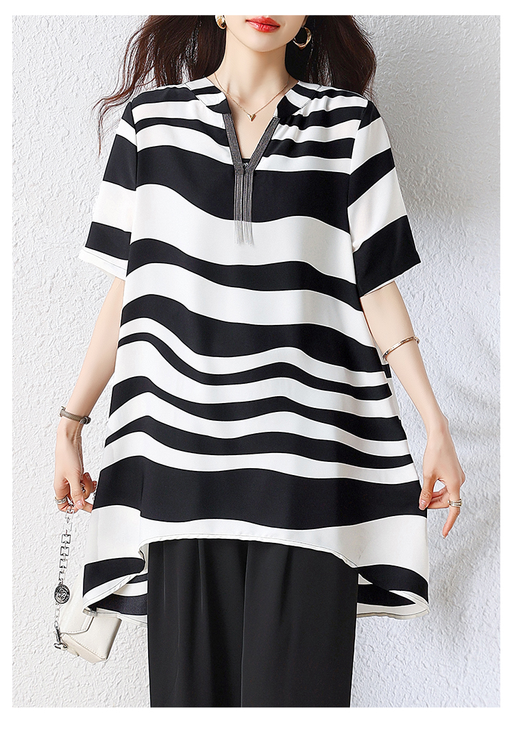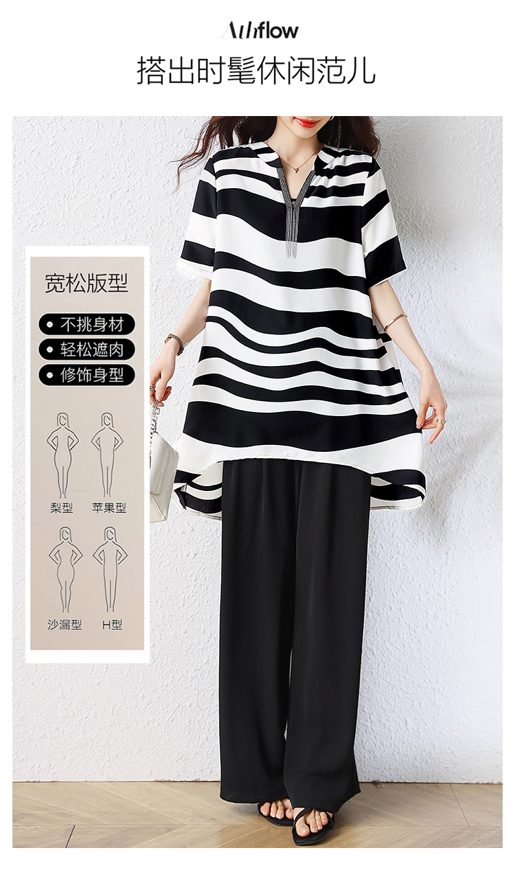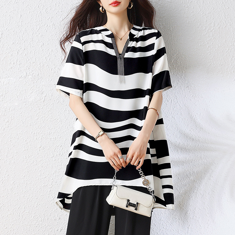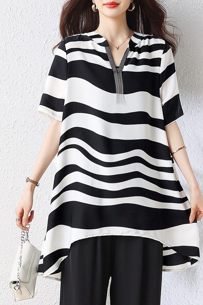 RY3310# 实拍2026夏季新款流苏宽松黑白条气质短袖中长款时尚衬衫上衣女