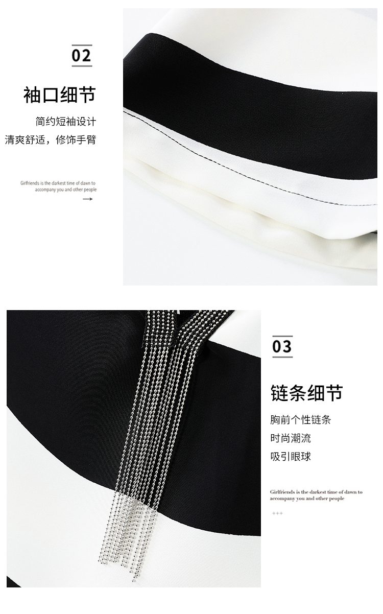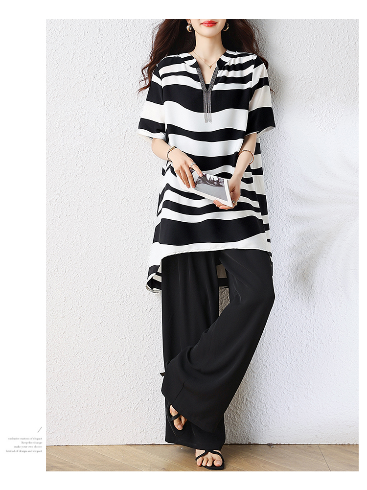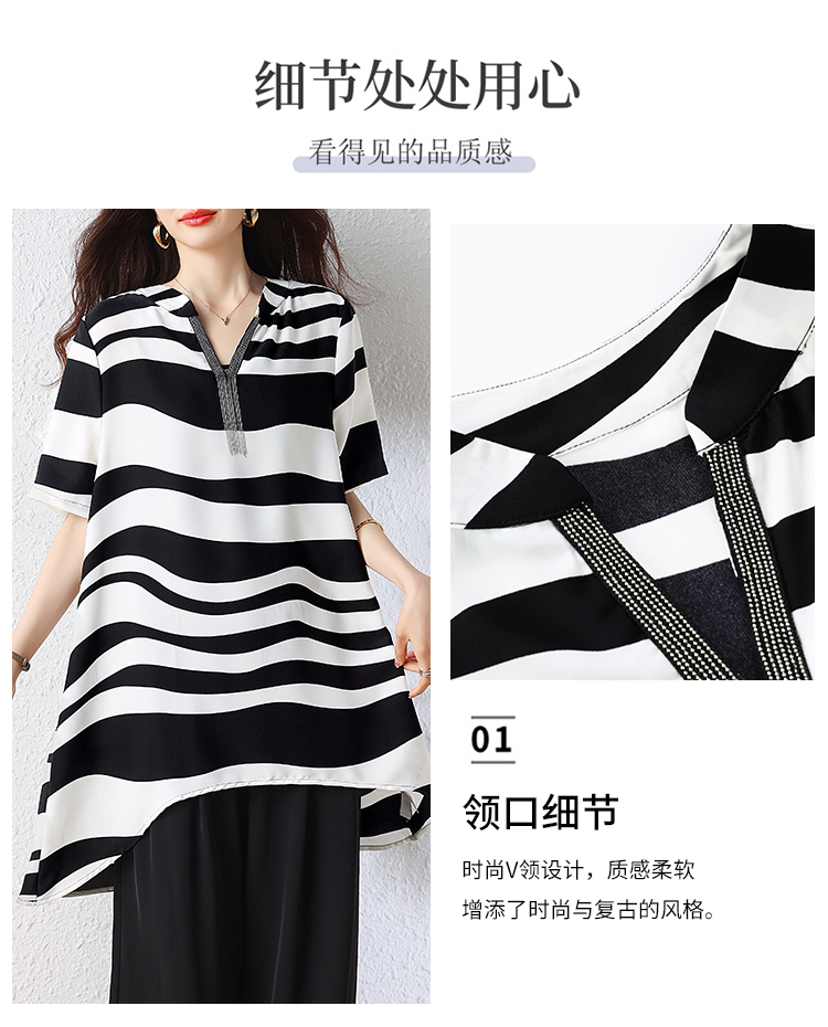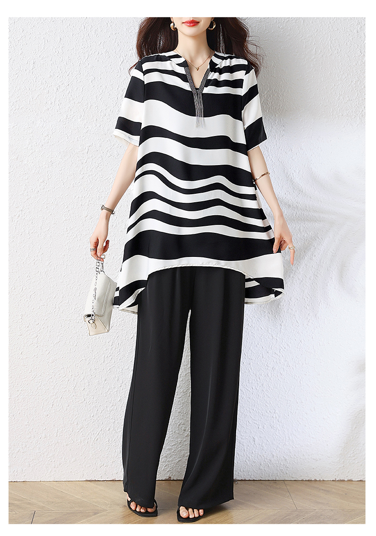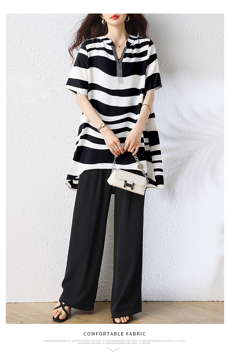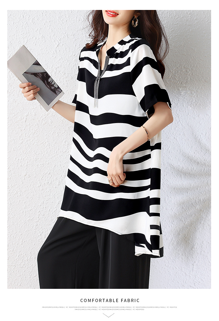 RY3310# 实拍2026夏季新款流苏宽松黑白条气质短袖中长款时尚衬衫上衣女