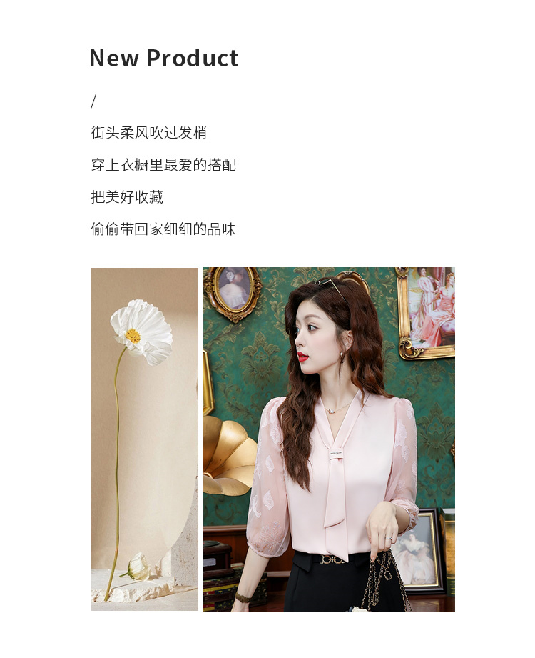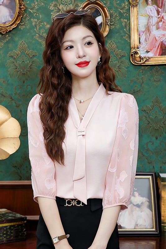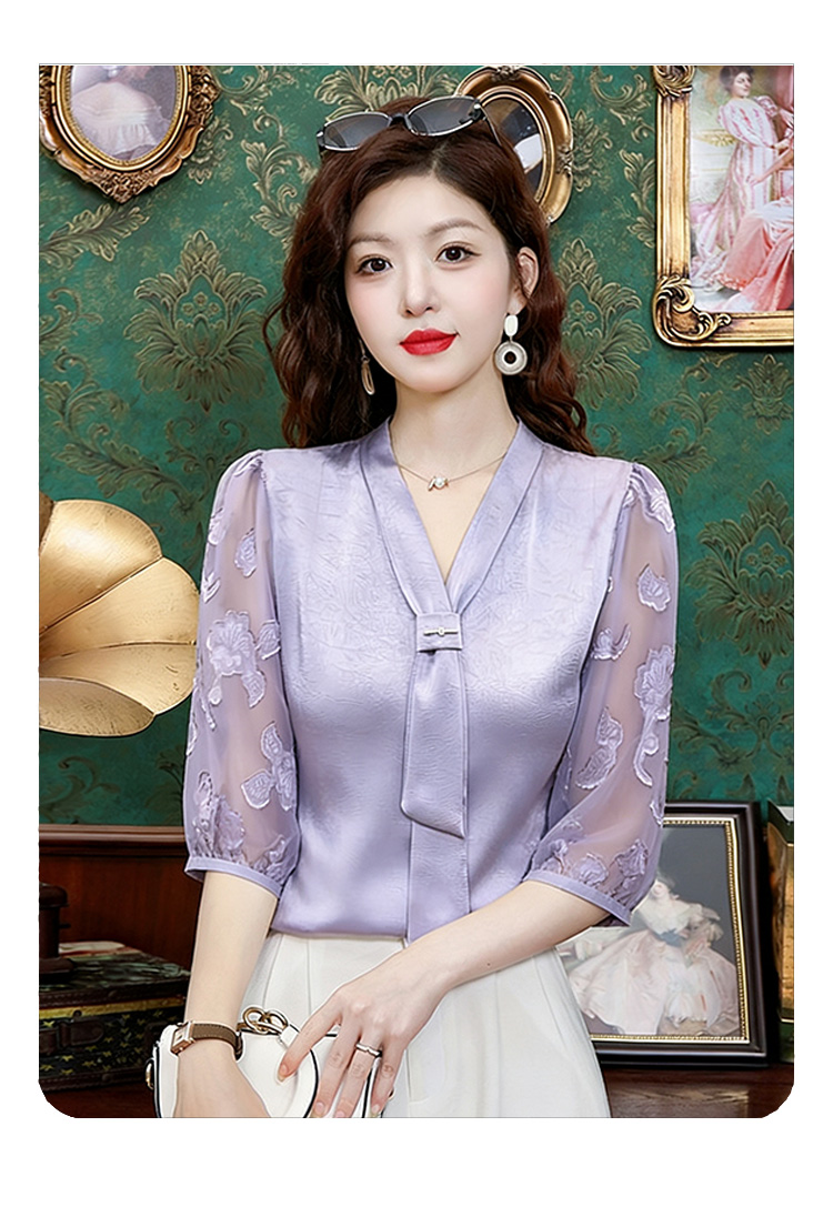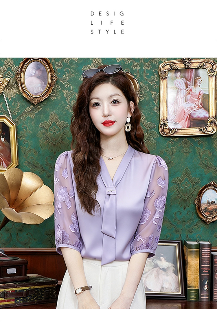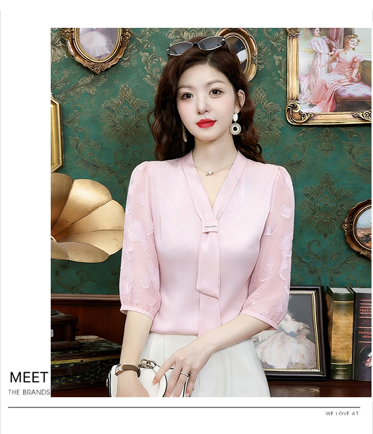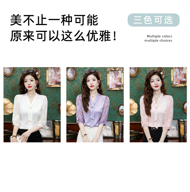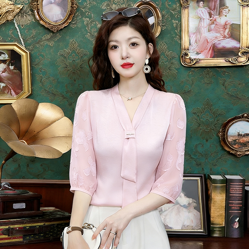 RY3318# 实拍2026夏季新款时尚韩系设计感提花缎面上衣气质百搭中袖衬衫女