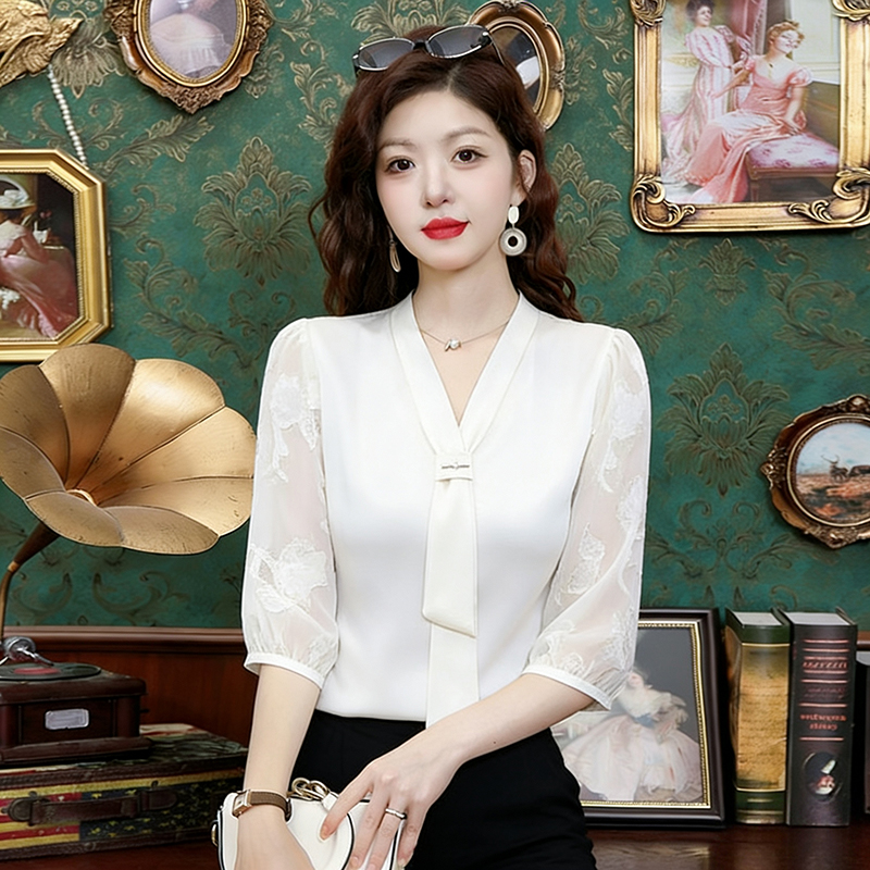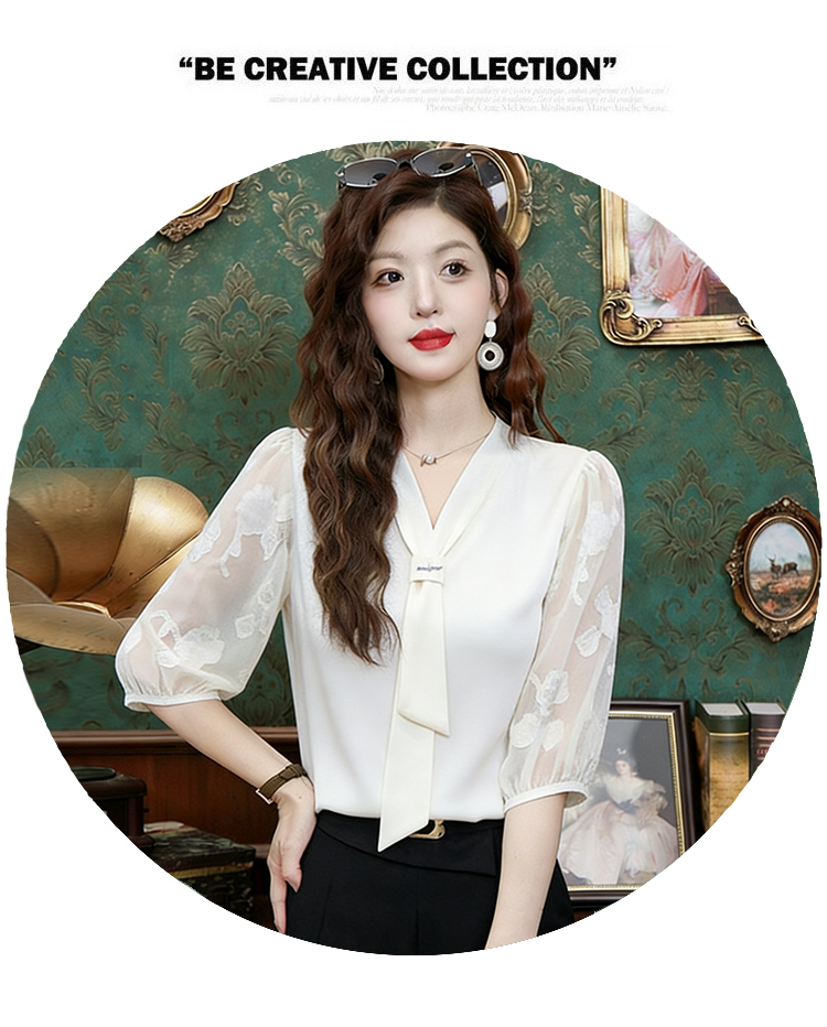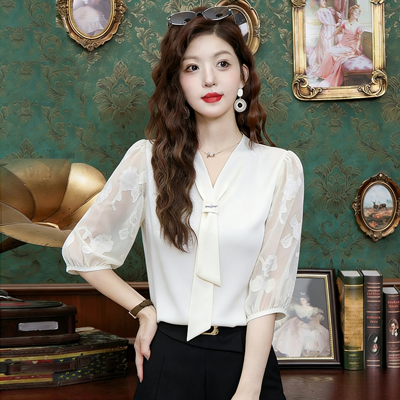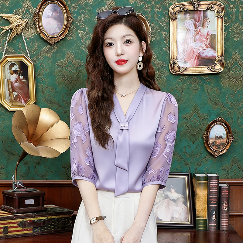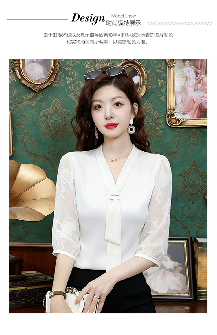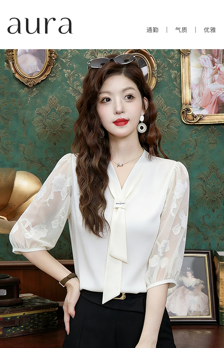 RY3318# 实拍2026夏季新款时尚韩系设计感提花缎面上衣气质百搭中袖衬衫女