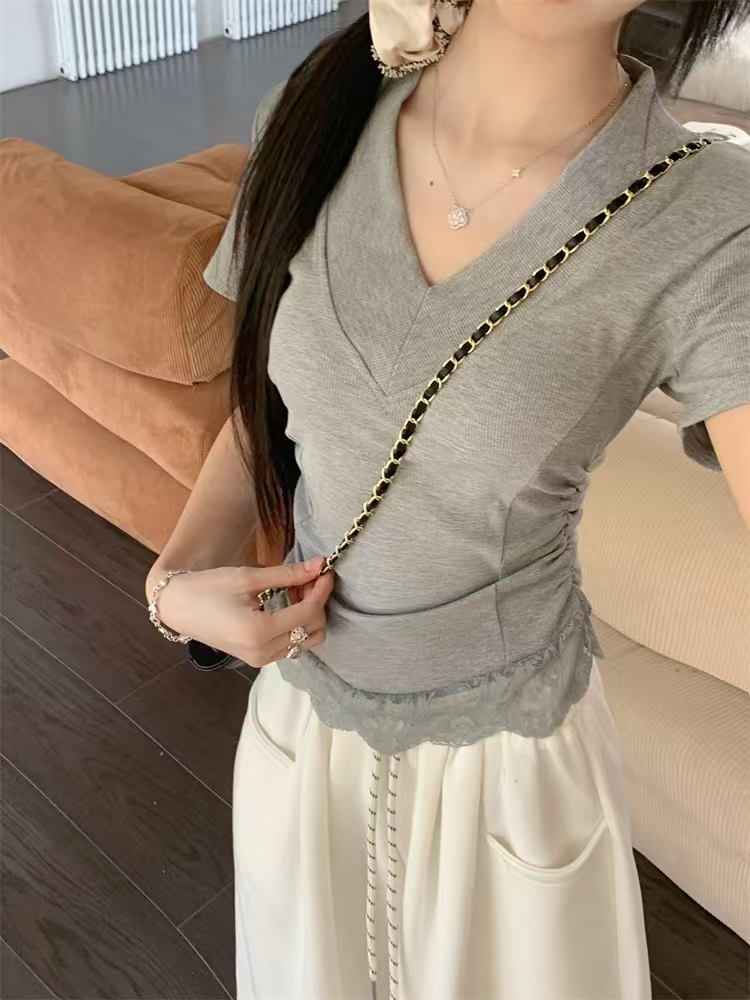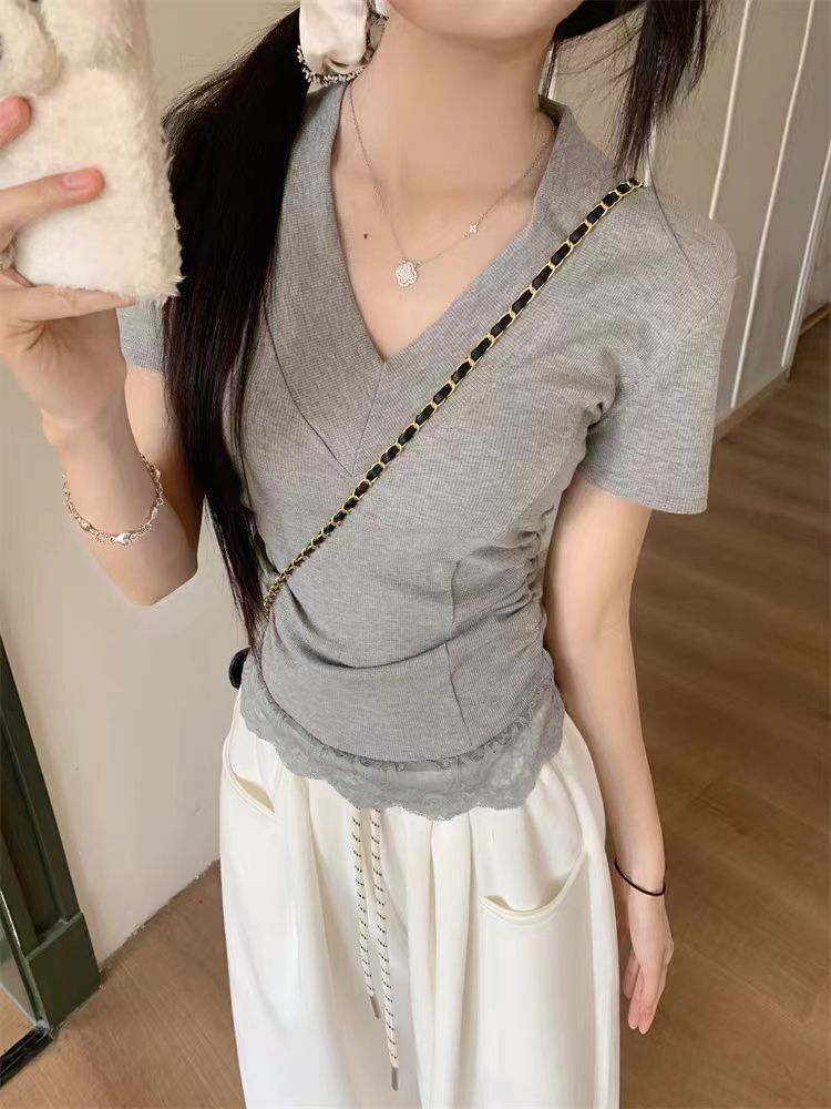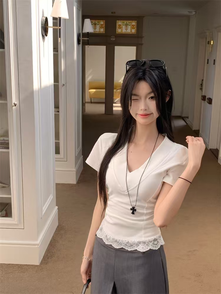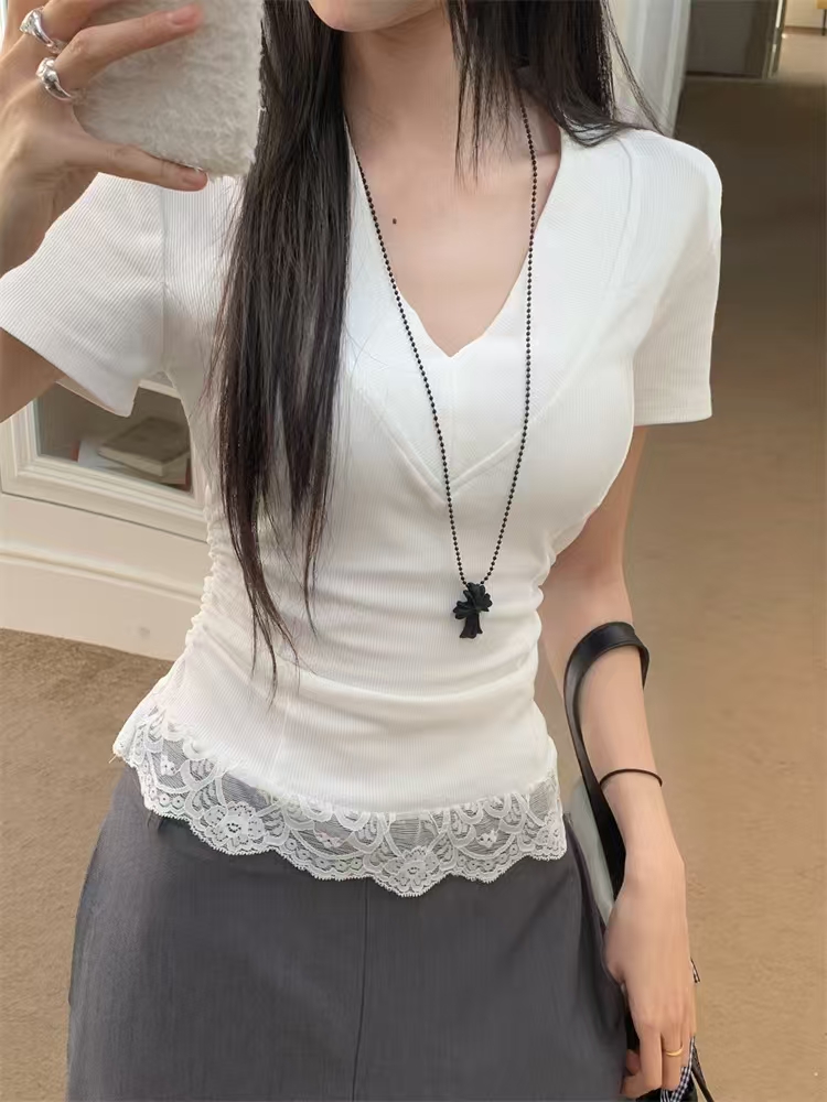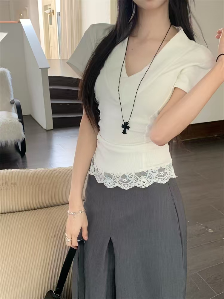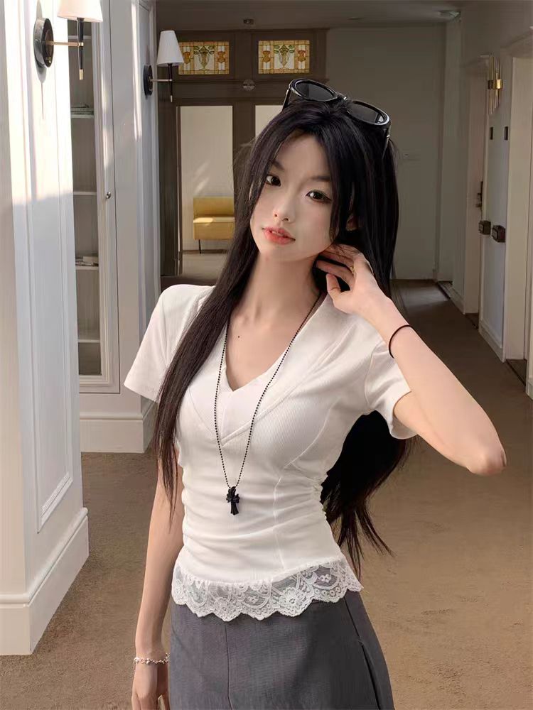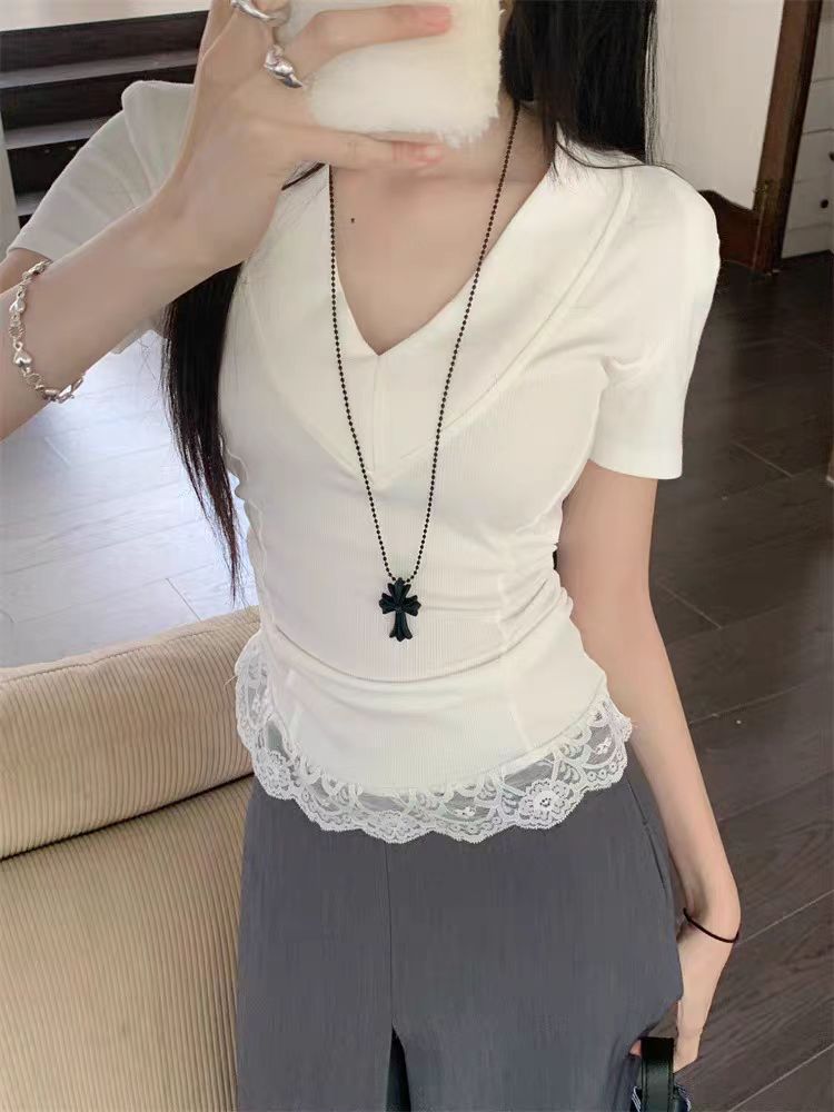 RY3331# 人棉拼接韩版蕾丝夏季气质收腰修身蕾丝花边下摆短款上衣
