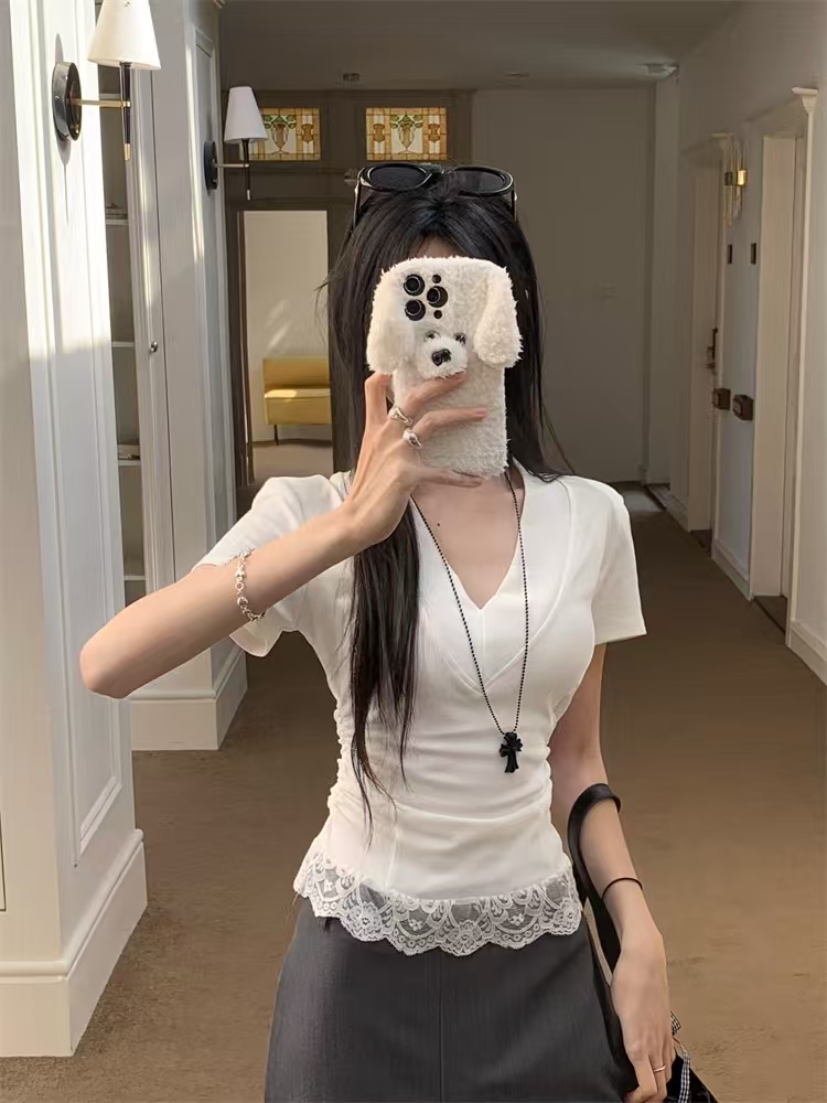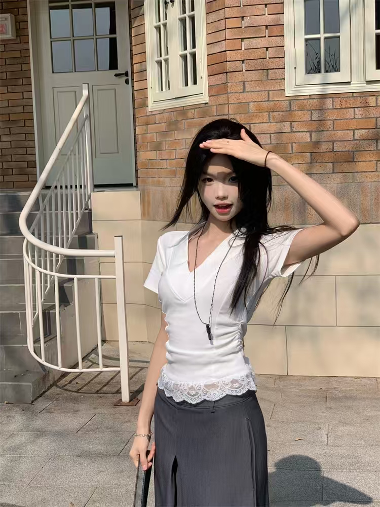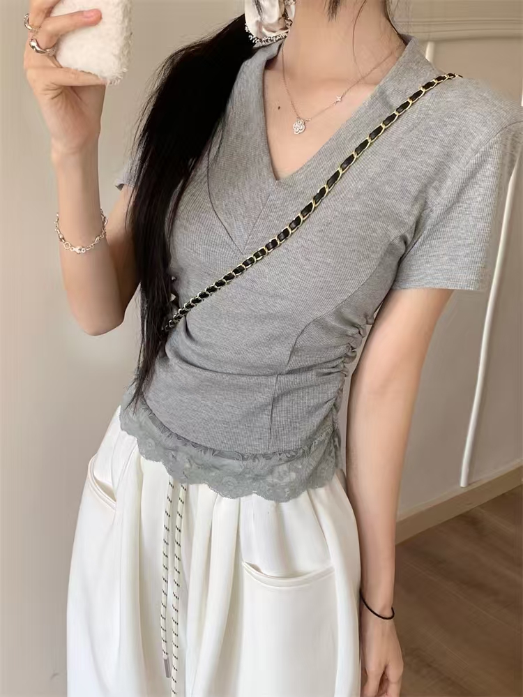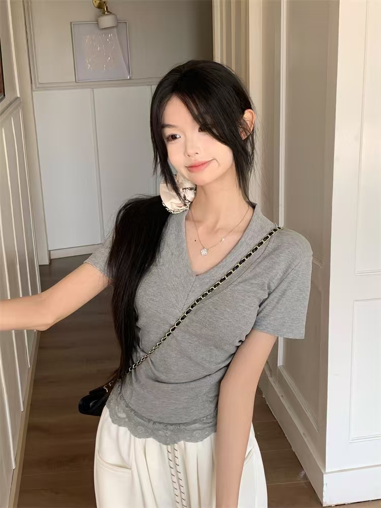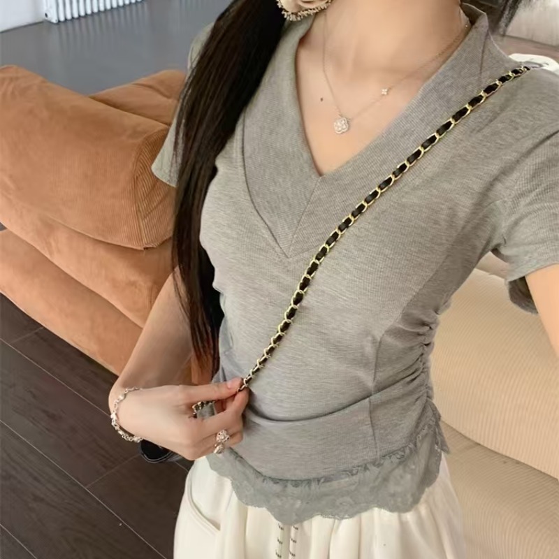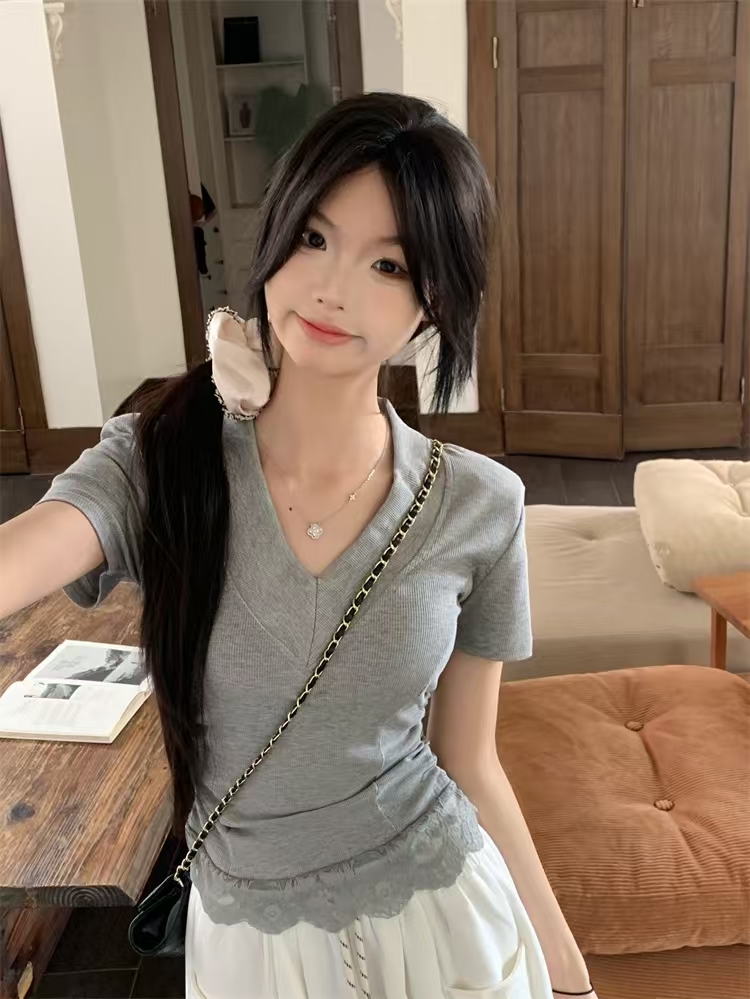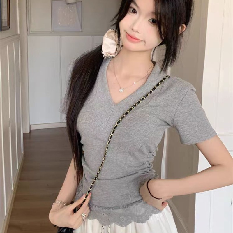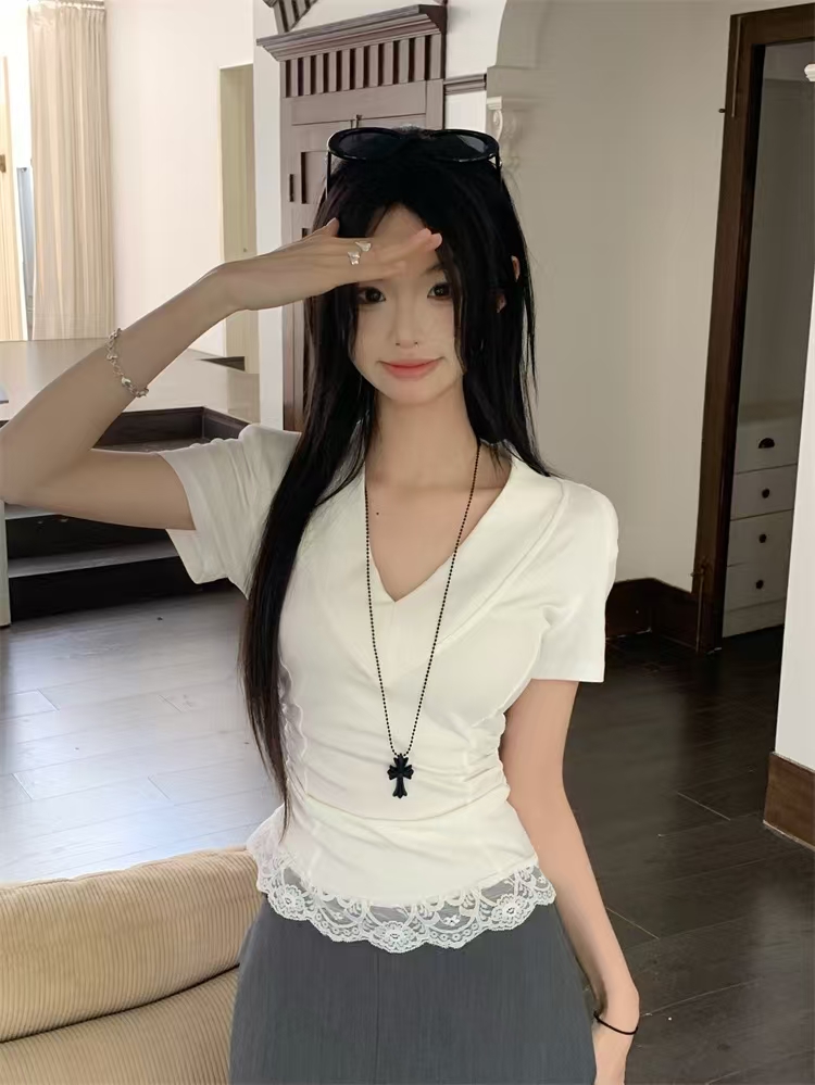 RY3331# 人棉拼接韩版蕾丝夏季气质收腰修身蕾丝花边下摆短款上衣