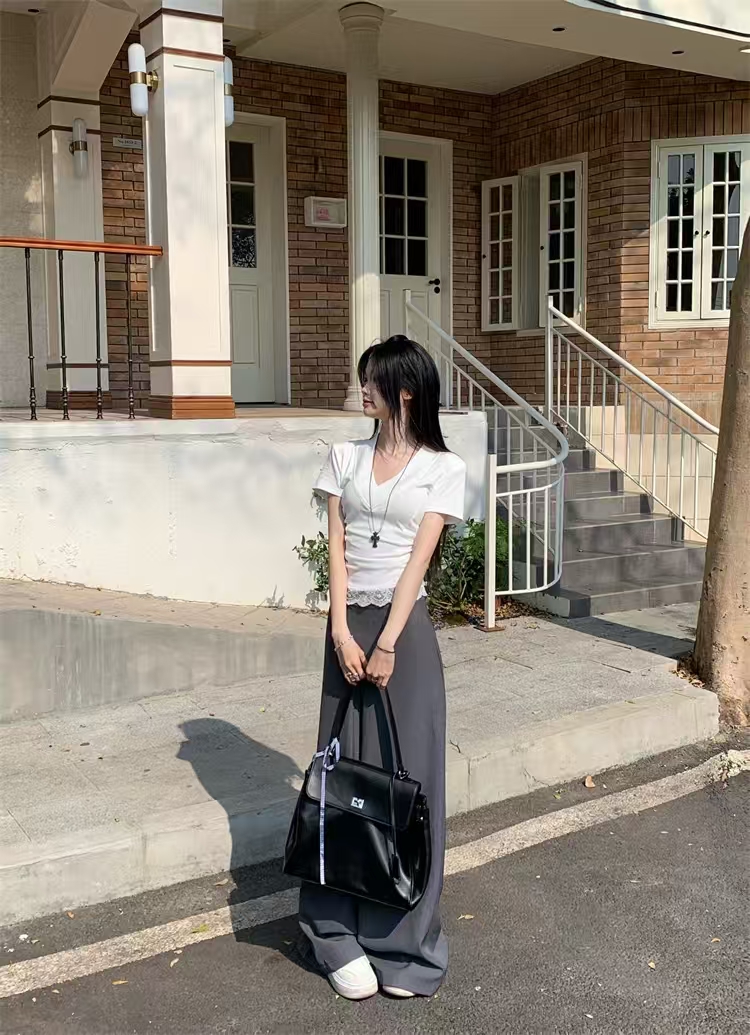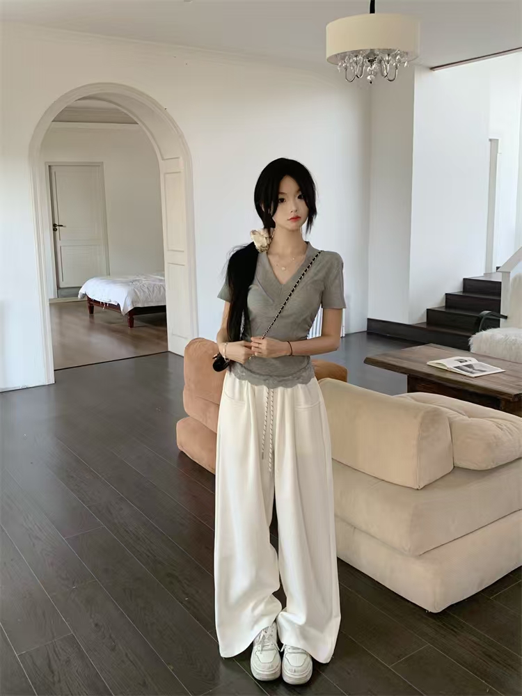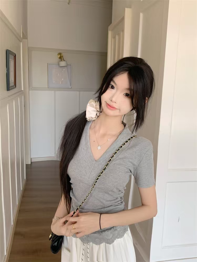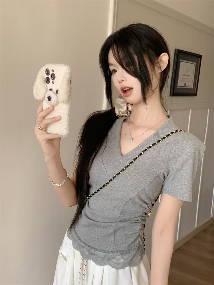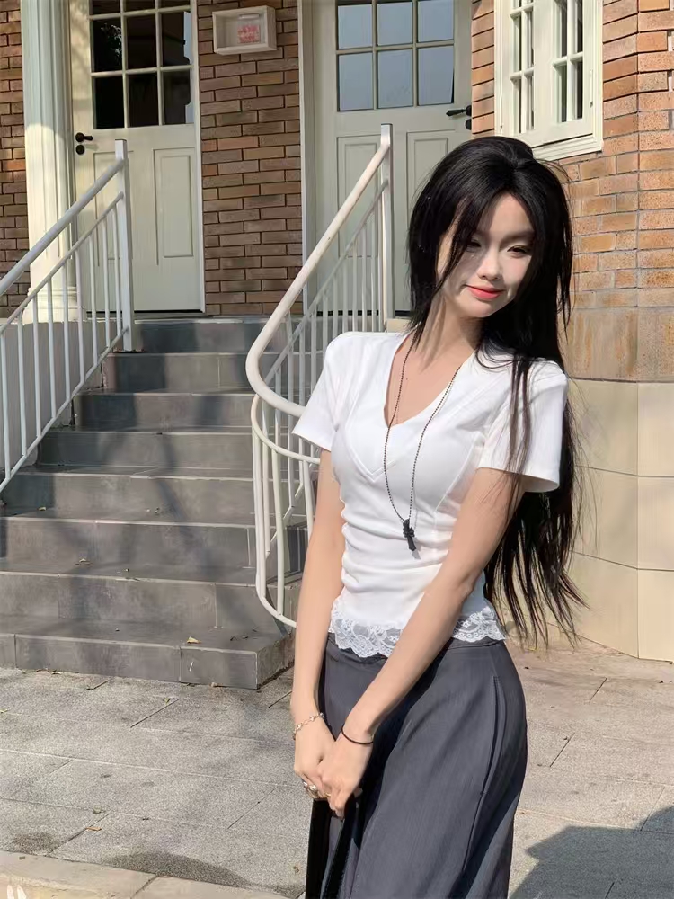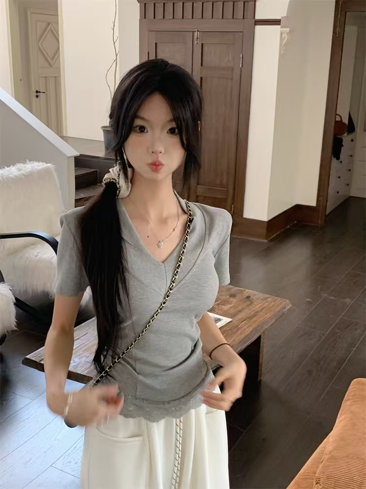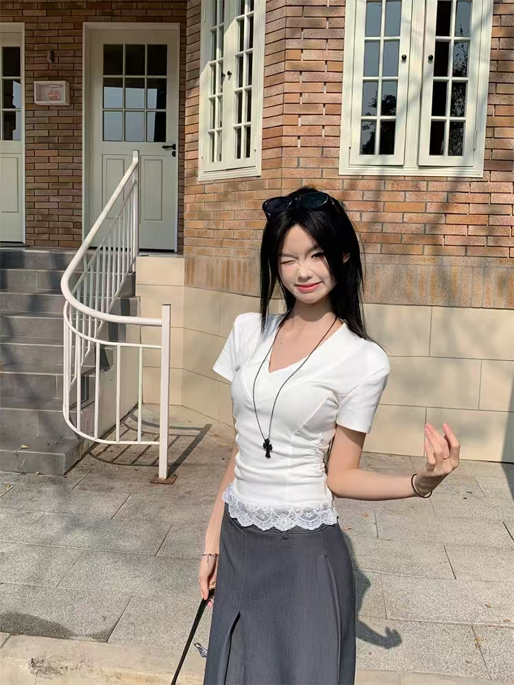 RY3331# 人棉拼接韩版蕾丝夏季气质收腰修身蕾丝花边下摆短款上衣