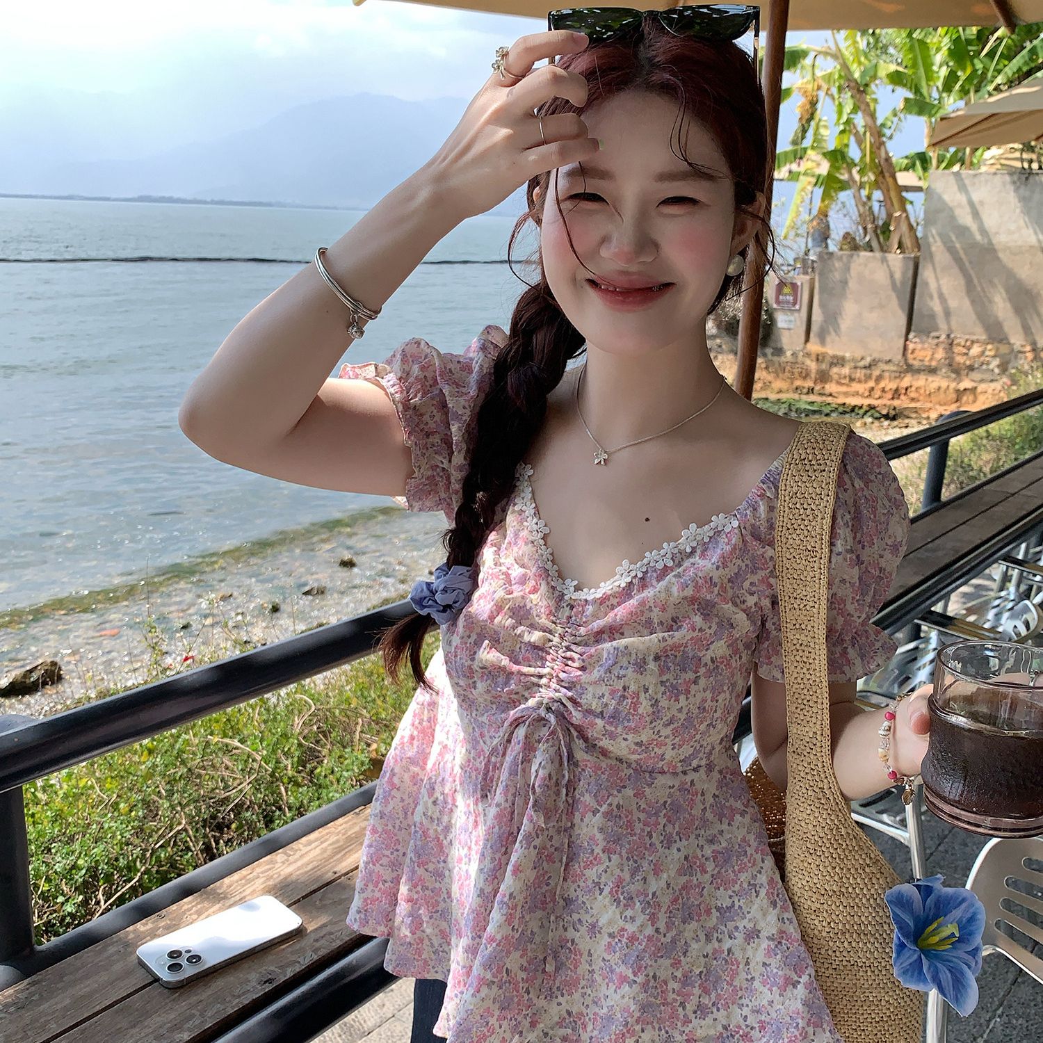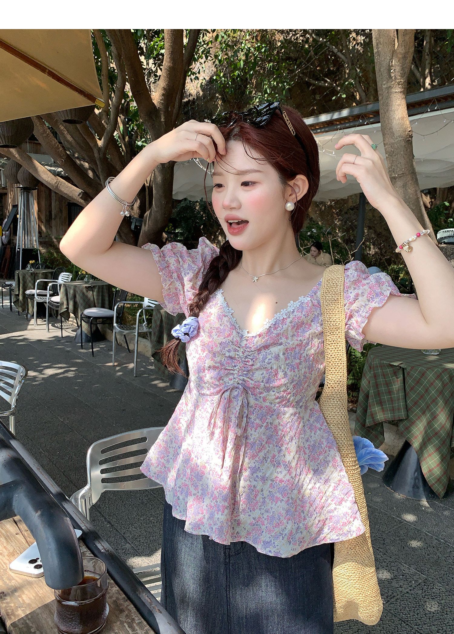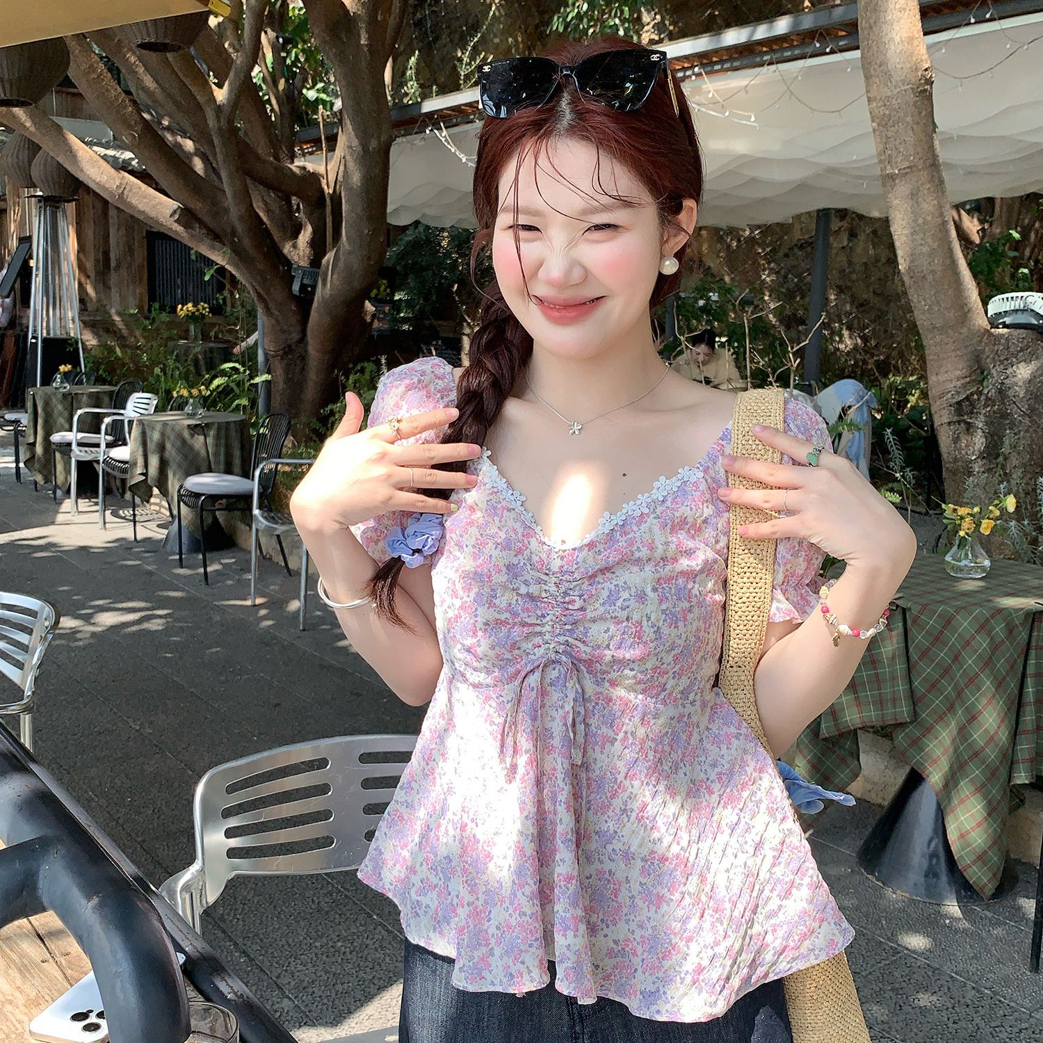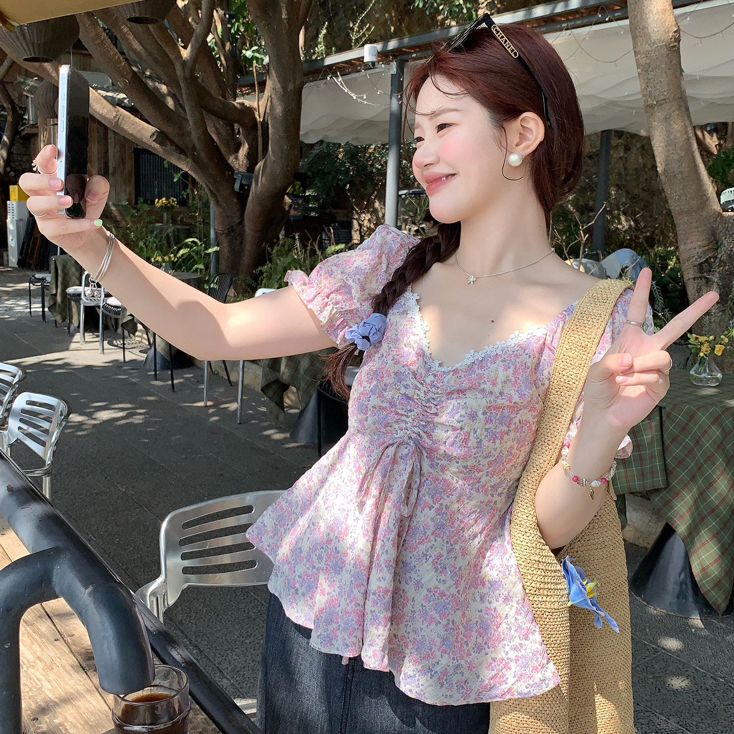 RY3333# 温柔风碎花V领衬衫夏季韩系新款遮肉显瘦抽褶泡泡袖雪纺上衣