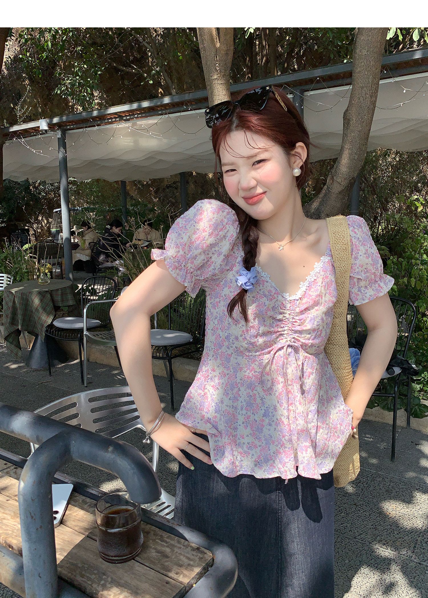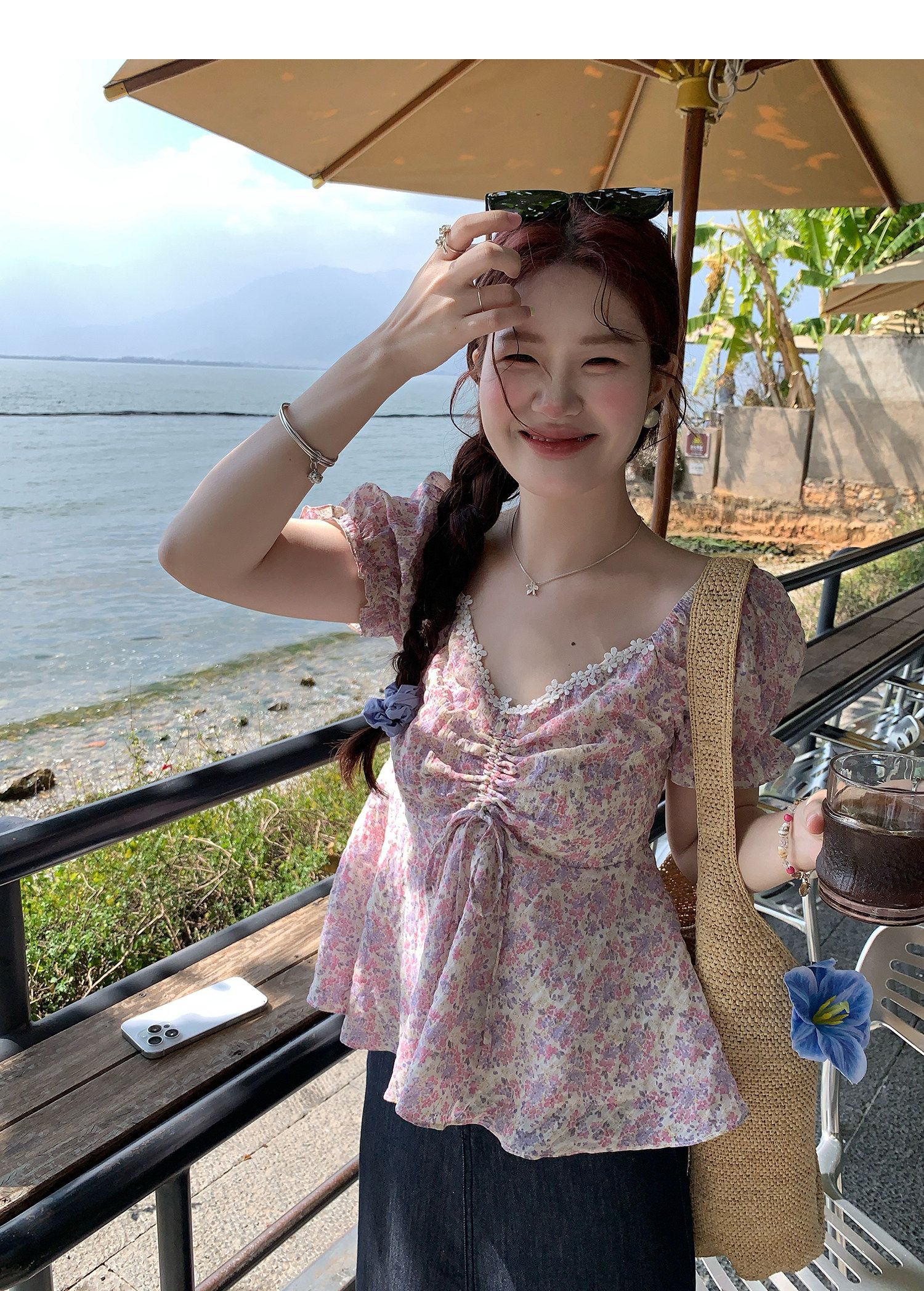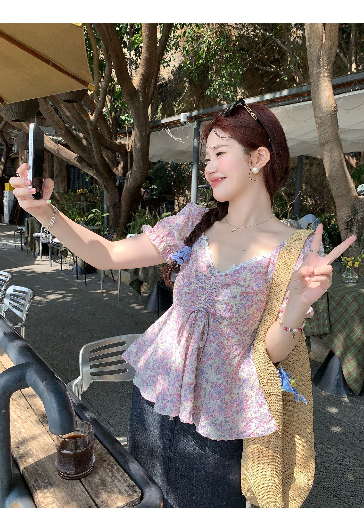 RY3333# 温柔风碎花V领衬衫夏季韩系新款遮肉显瘦抽褶泡泡袖雪纺上衣