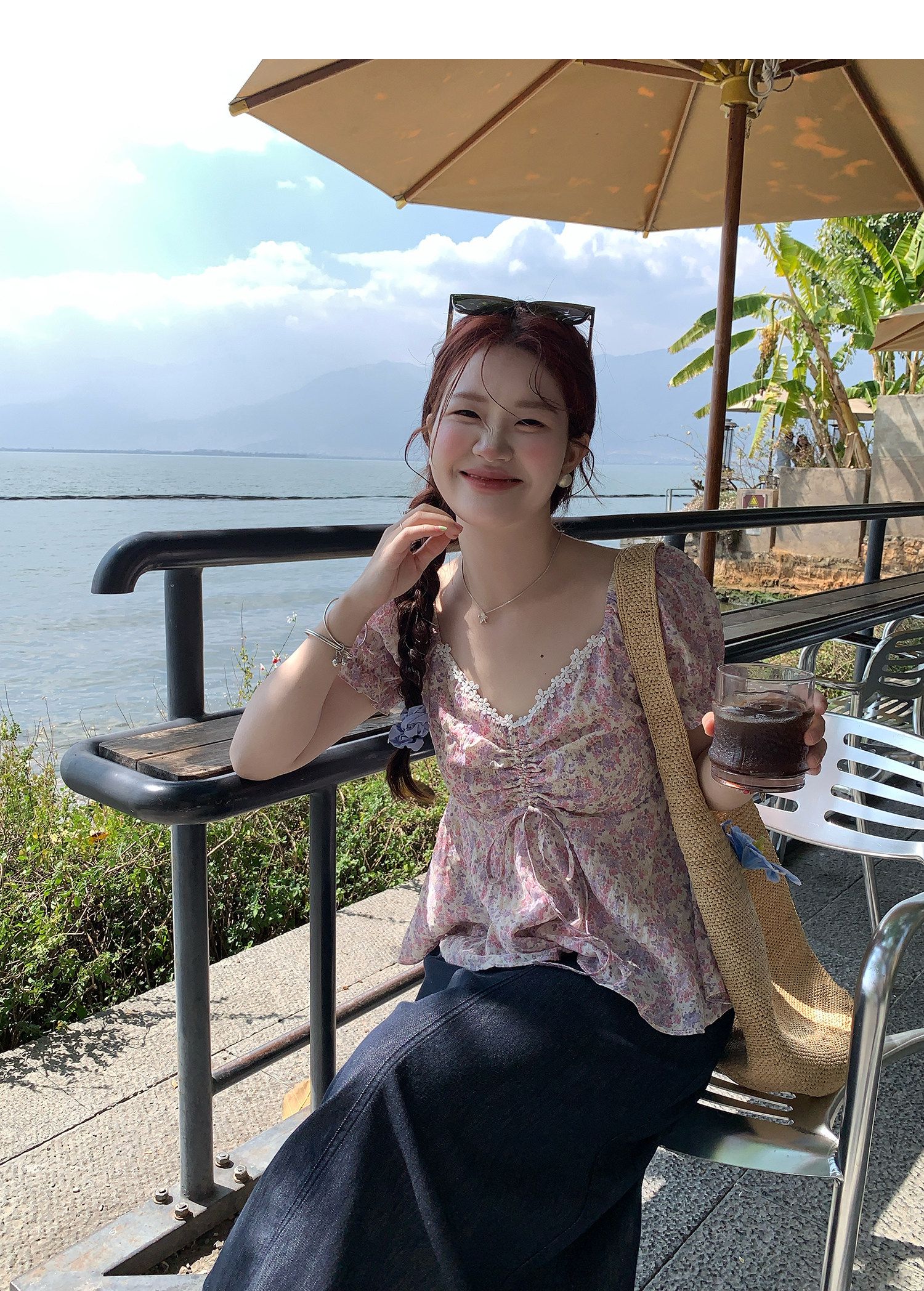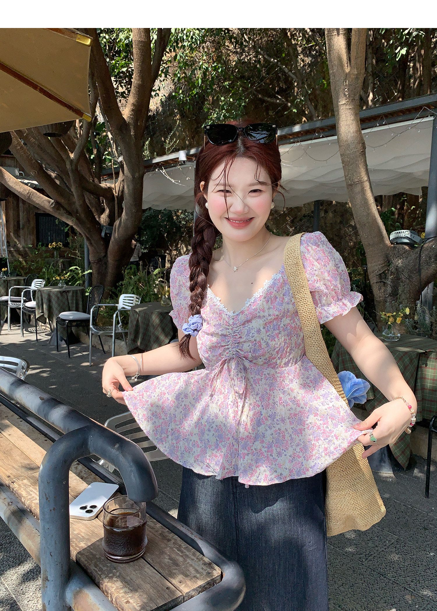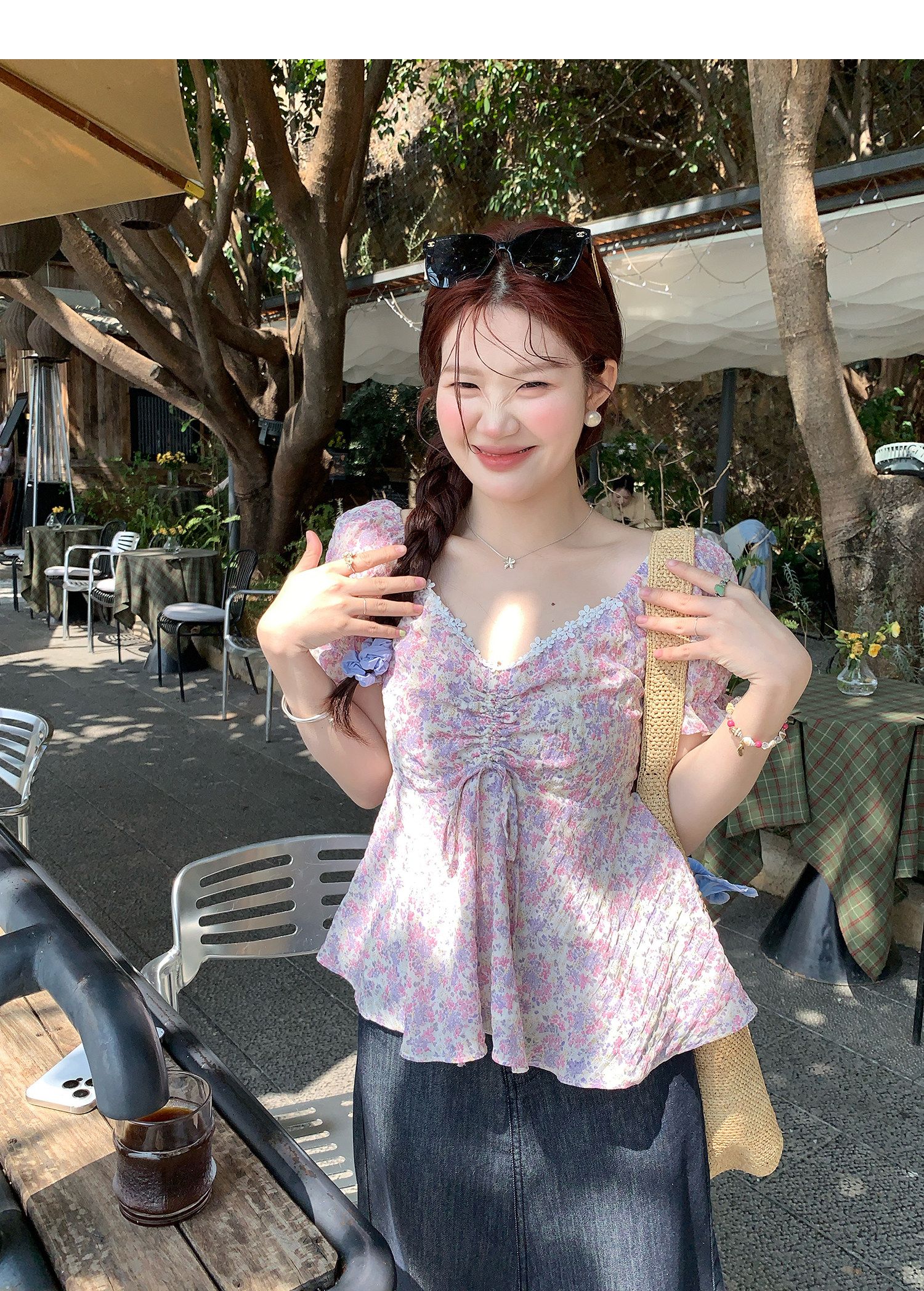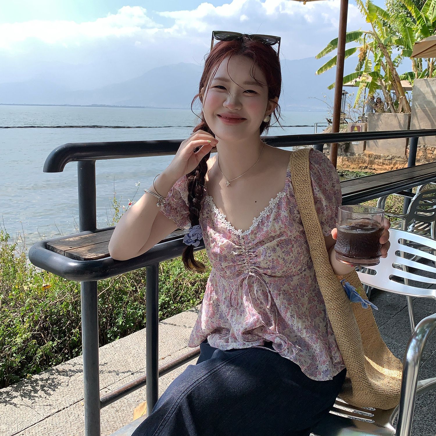 RY3333# 温柔风碎花V领衬衫夏季韩系新款遮肉显瘦抽褶泡泡袖雪纺上衣