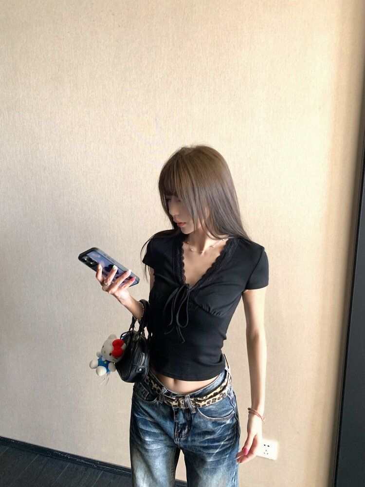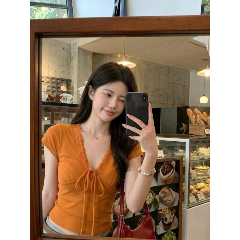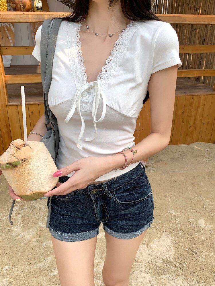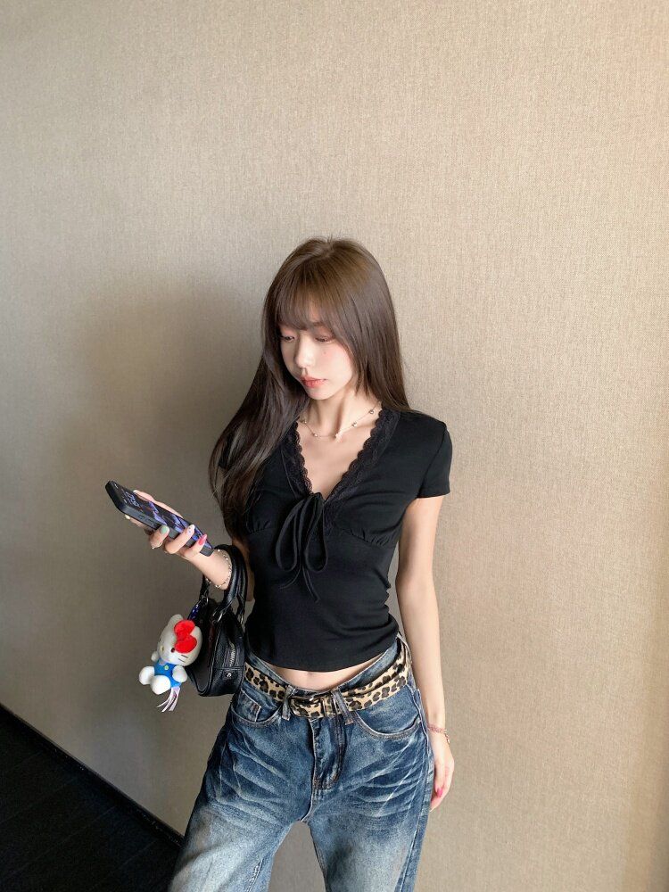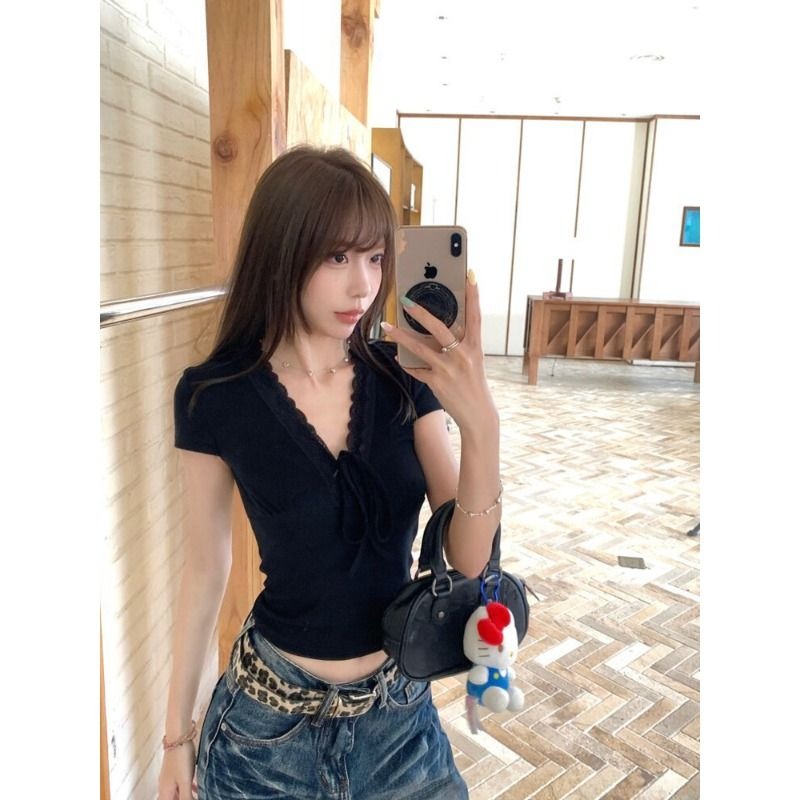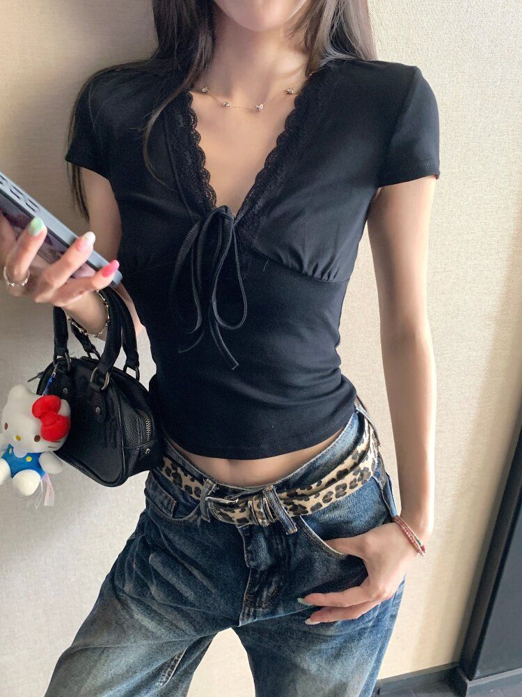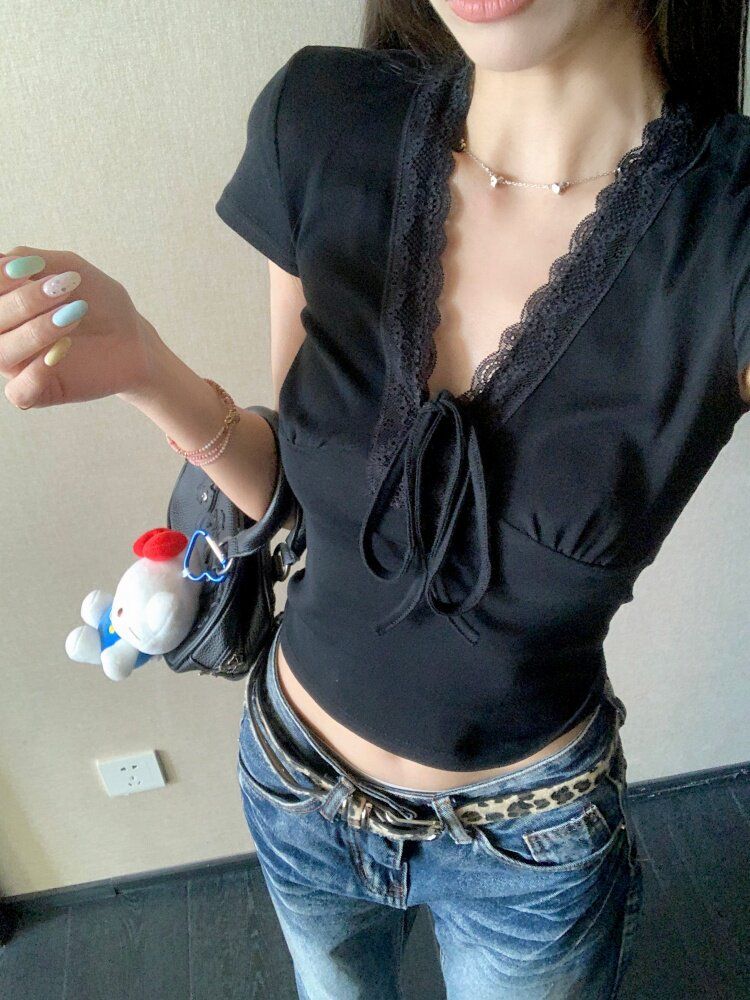 RY3336# 韩版蕾丝拼接V领绑带短袖T恤女夏季修身显瘦短款辣妹上衣