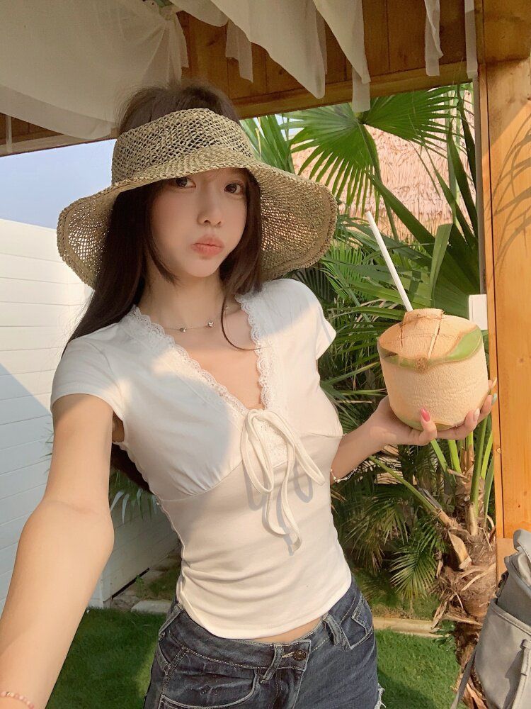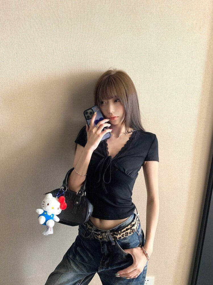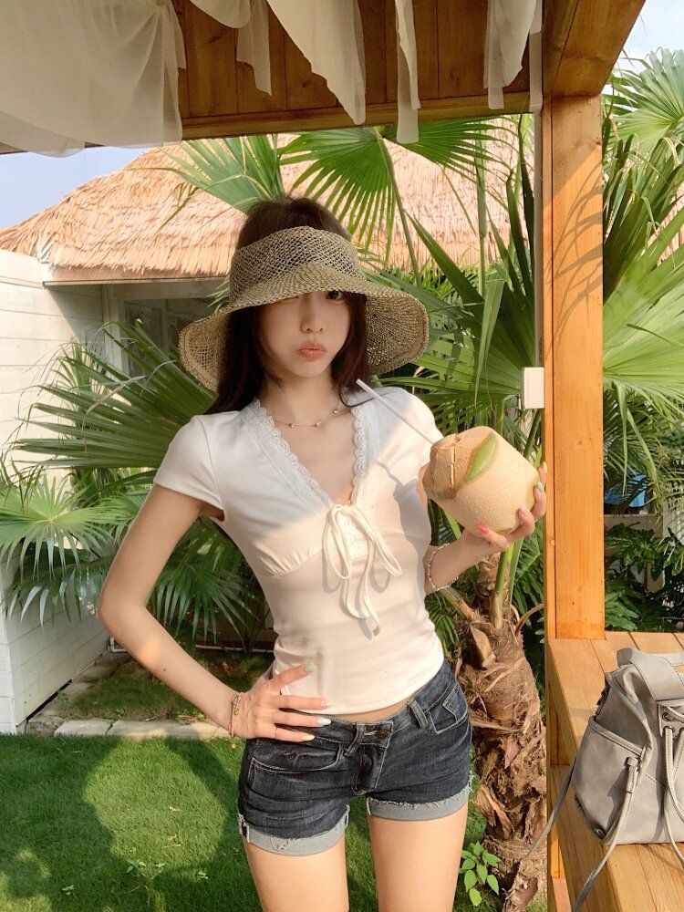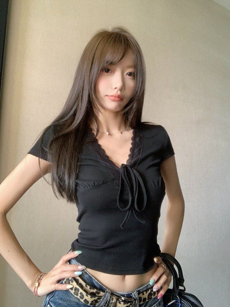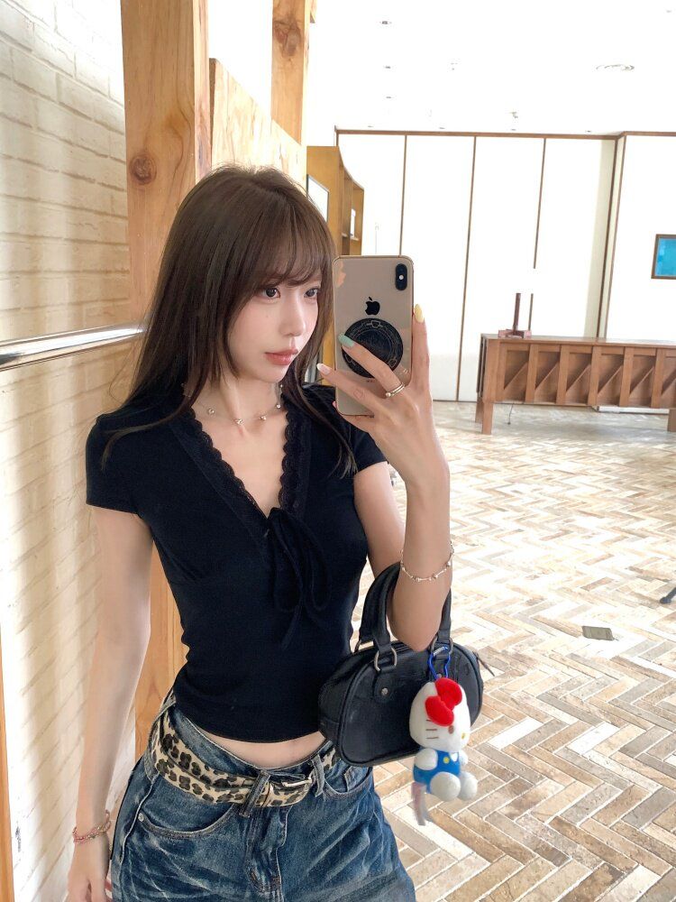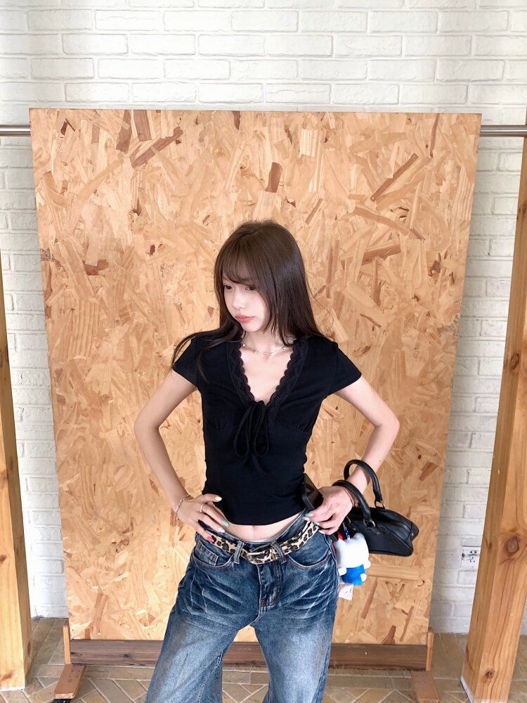 RY3336# 韩版蕾丝拼接V领绑带短袖T恤女夏季修身显瘦短款辣妹上衣