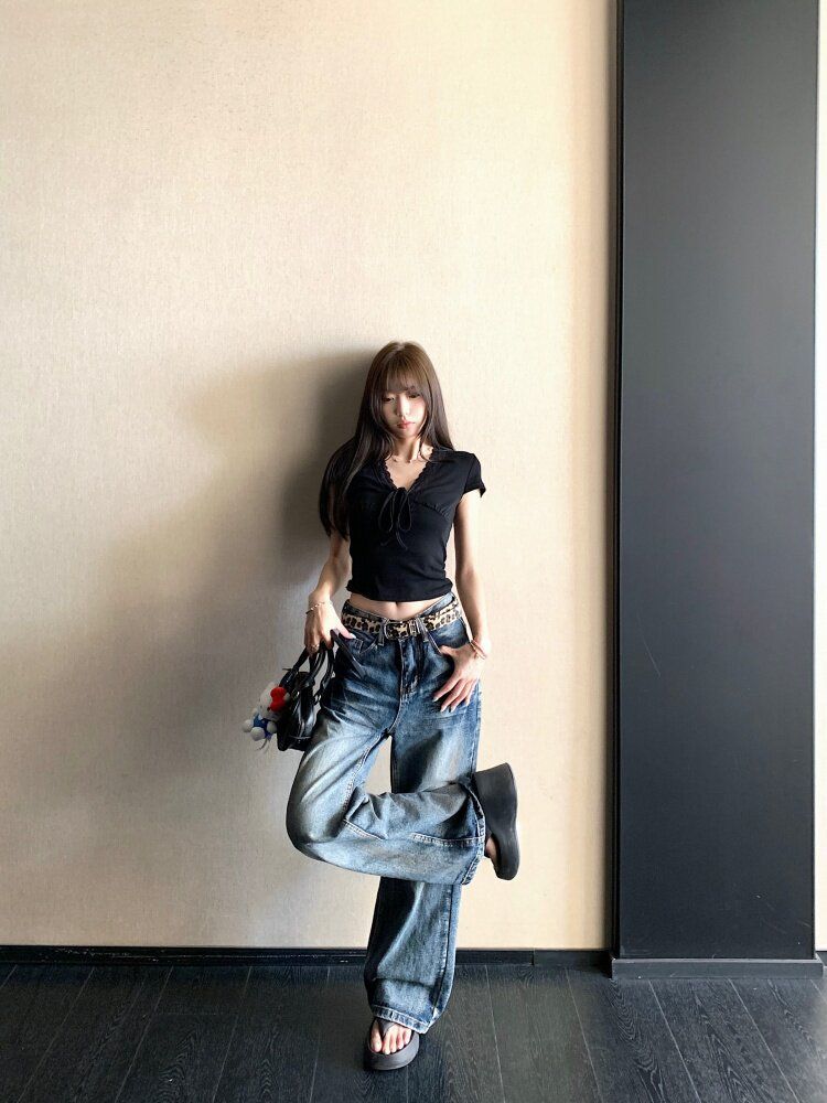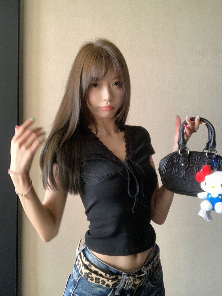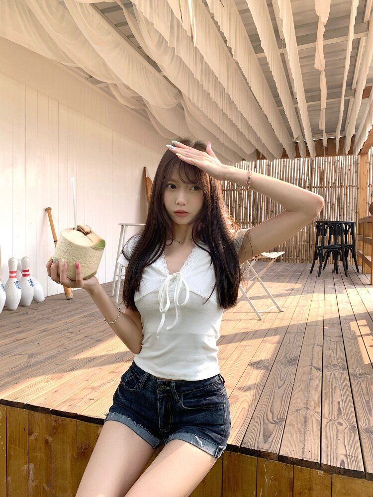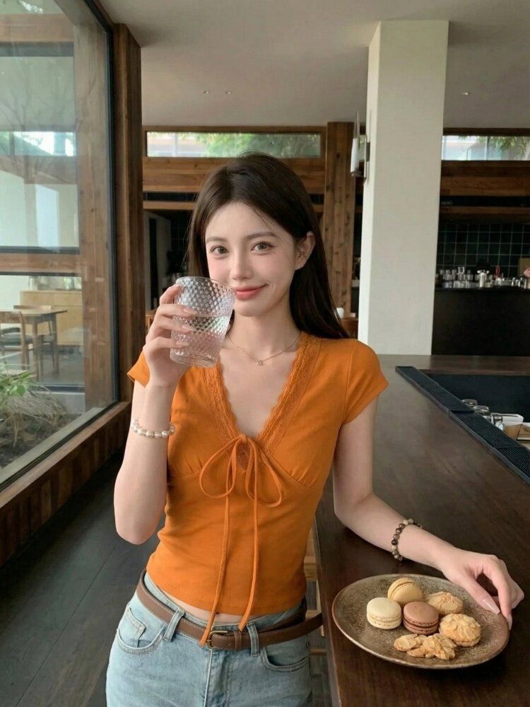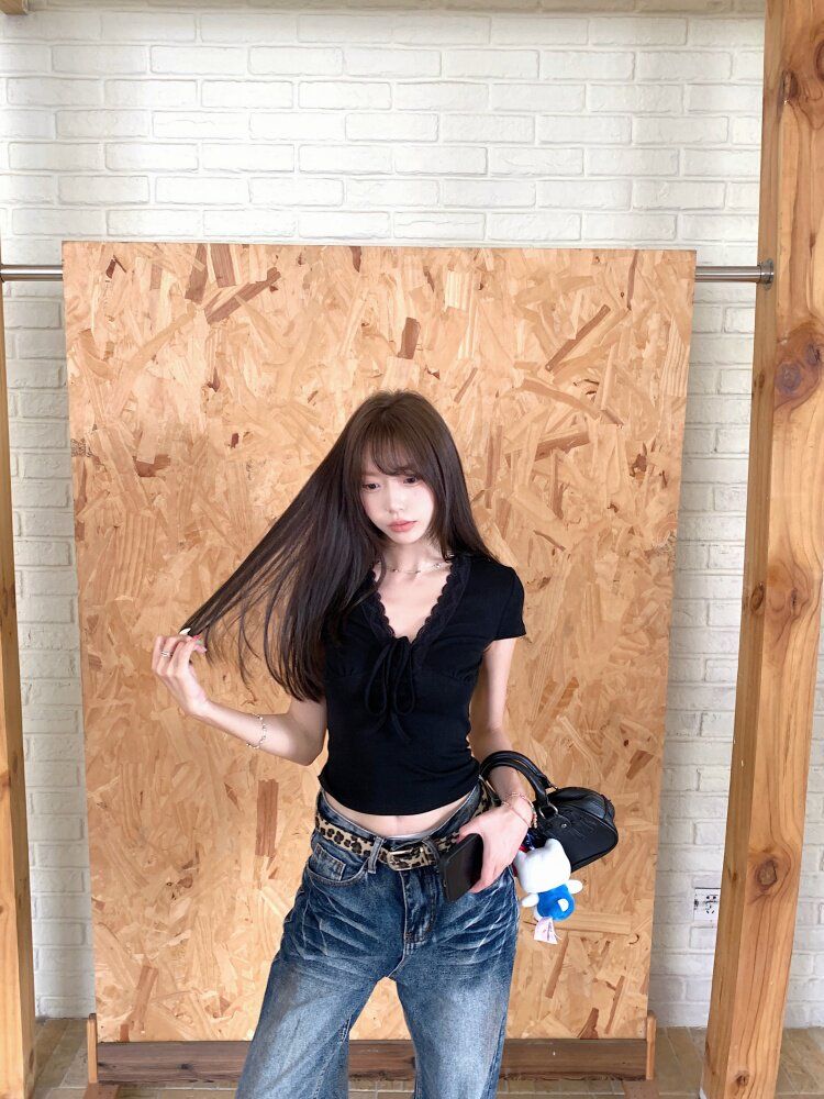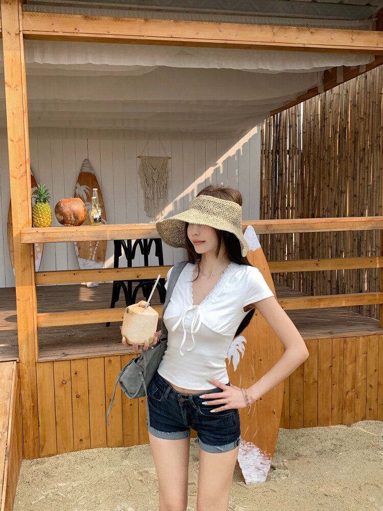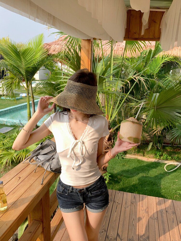 RY3336# 韩版蕾丝拼接V领绑带短袖T恤女夏季修身显瘦短款辣妹上衣