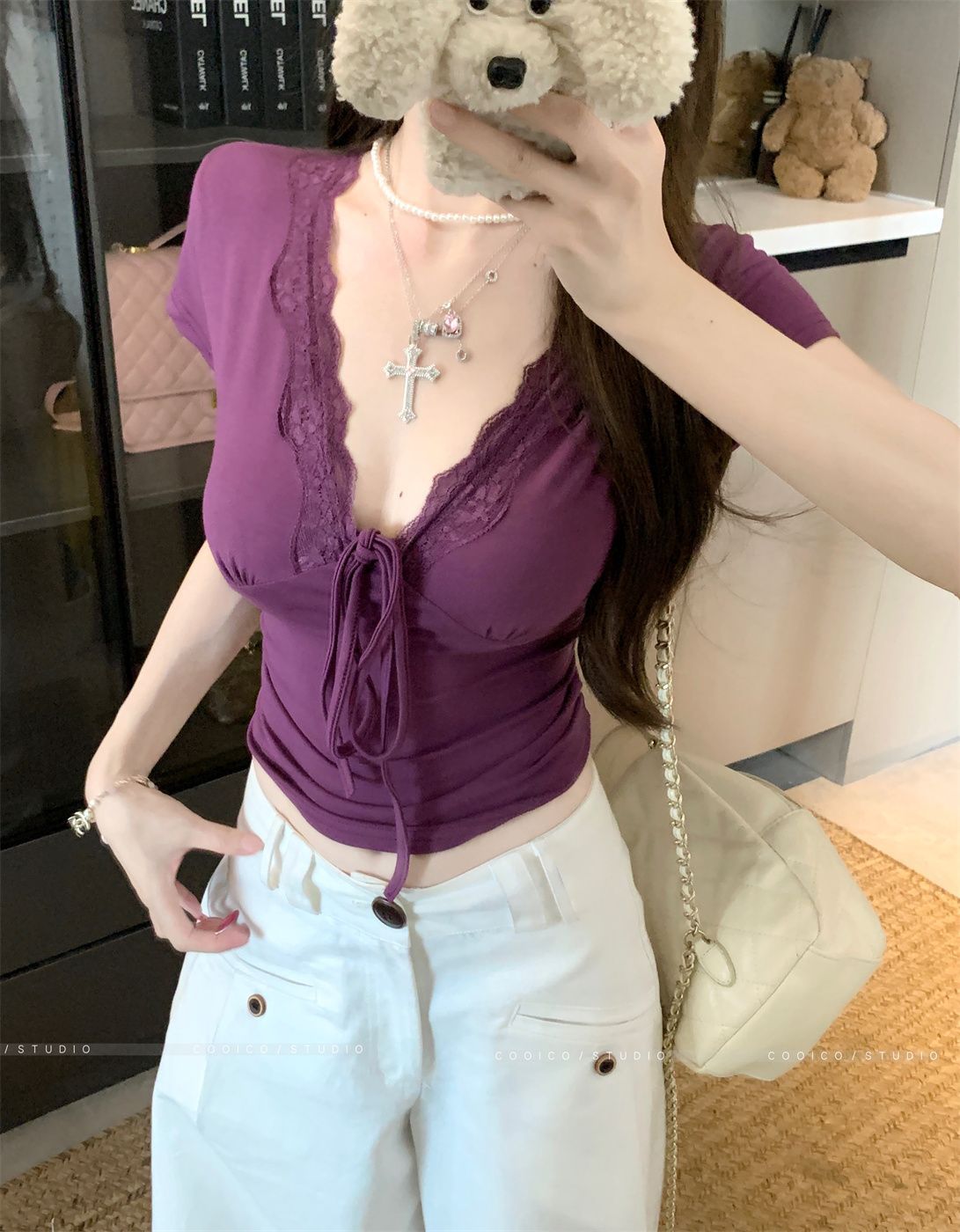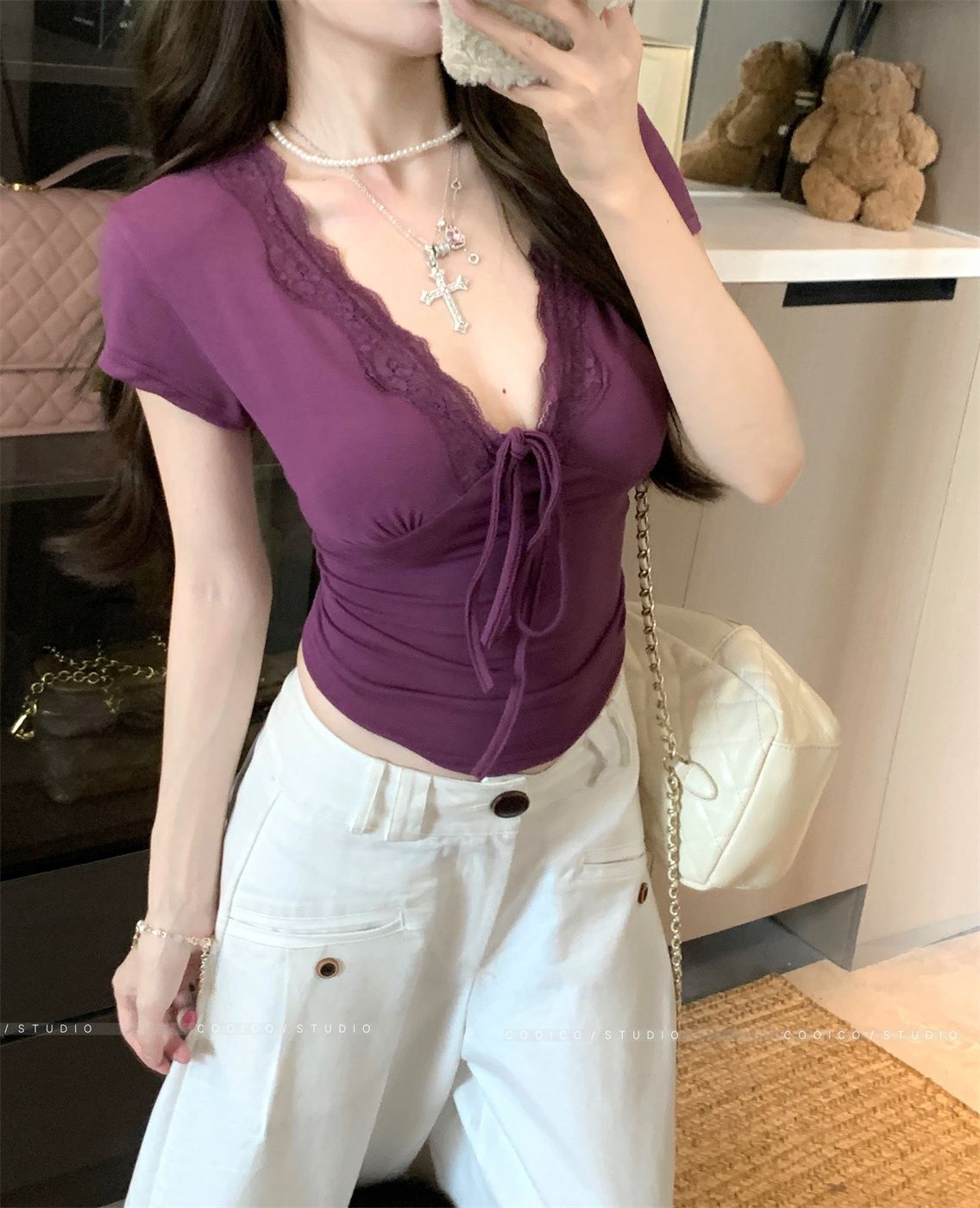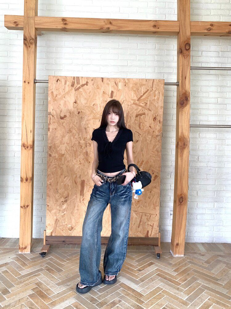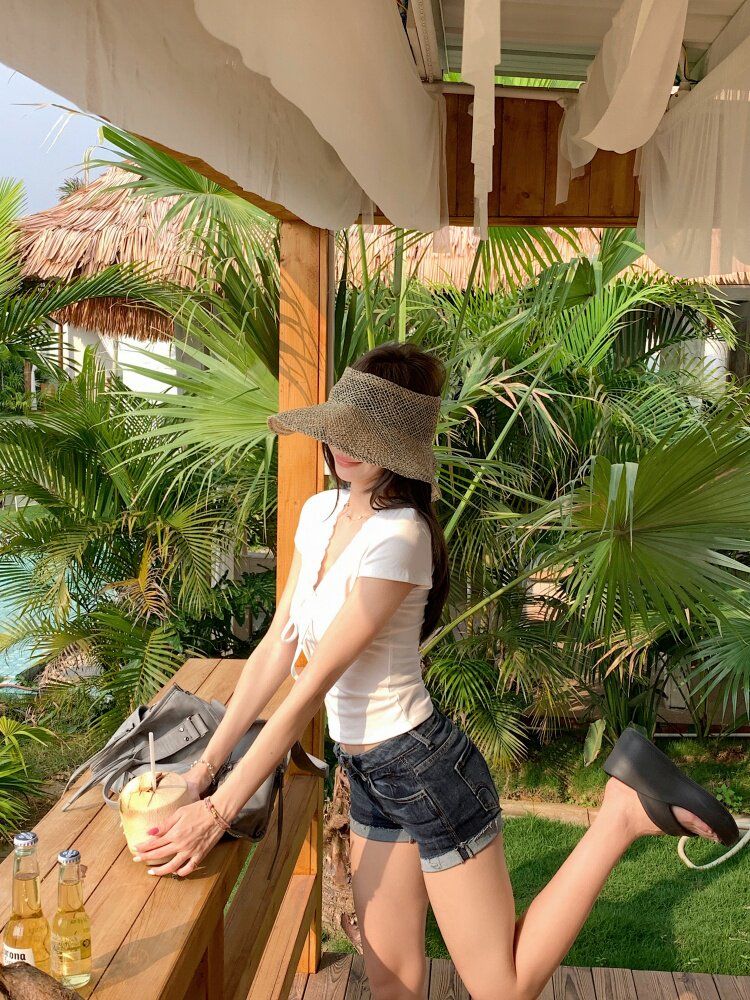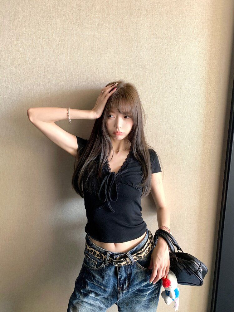 RY3336# 韩版蕾丝拼接V领绑带短袖T恤女夏季修身显瘦短款辣妹上衣