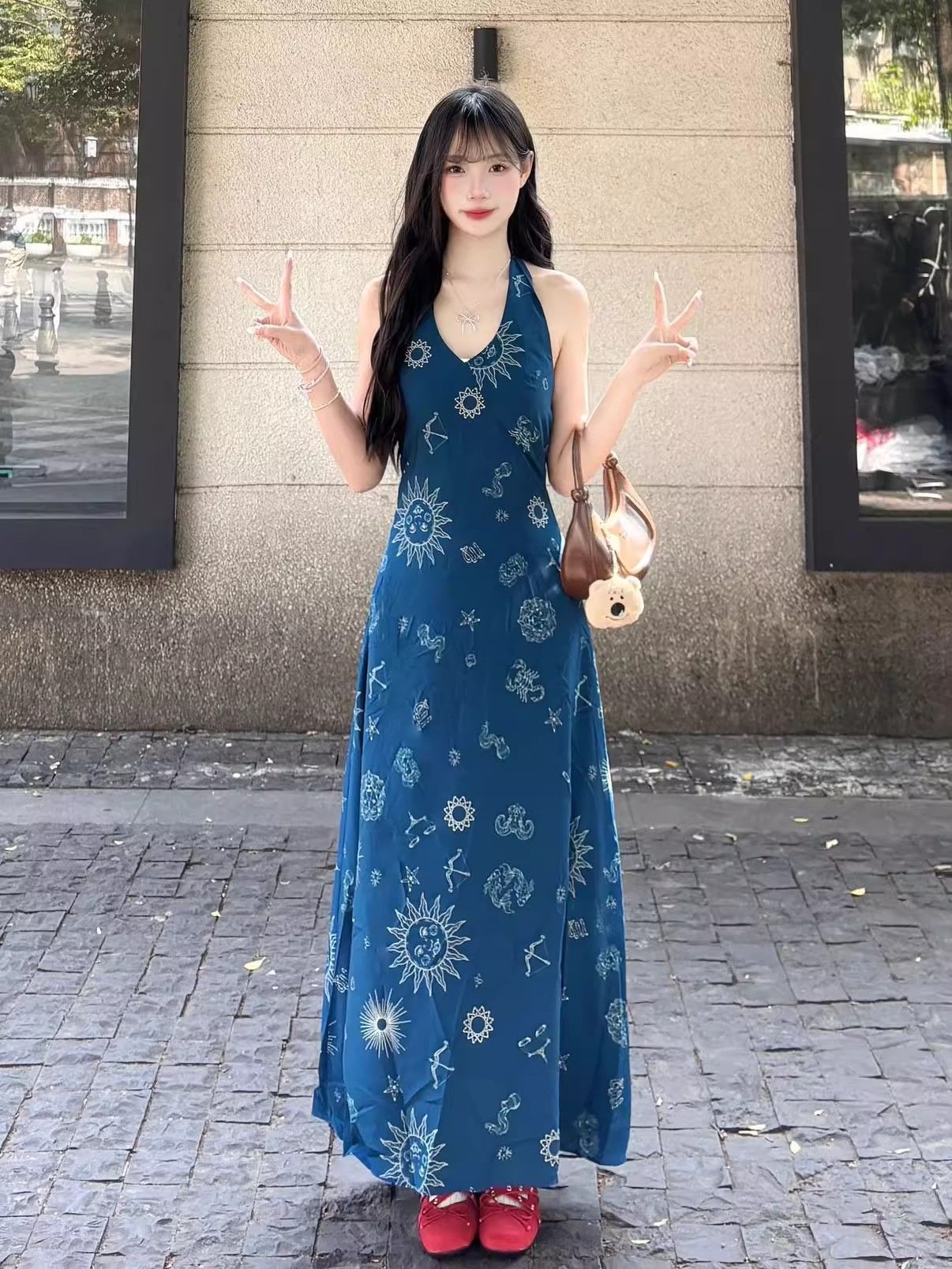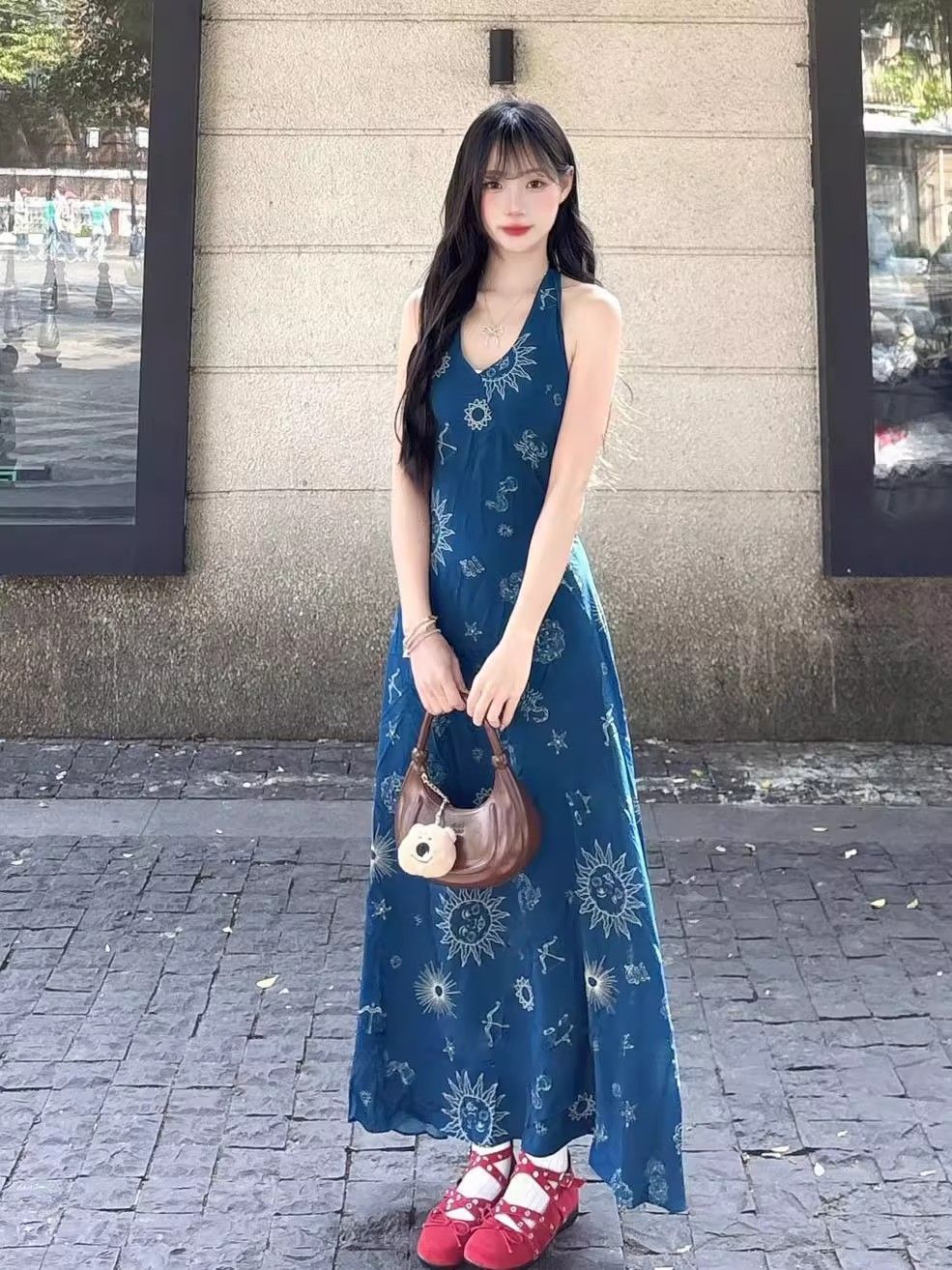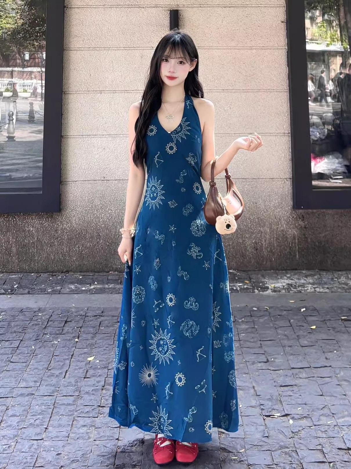 RY3340# 2026新款复古法式度假风蓝色v领挂脖背心连衣裙子女夏季收腰长裙