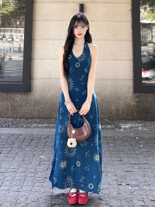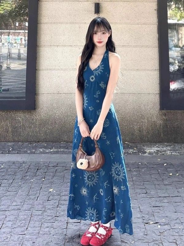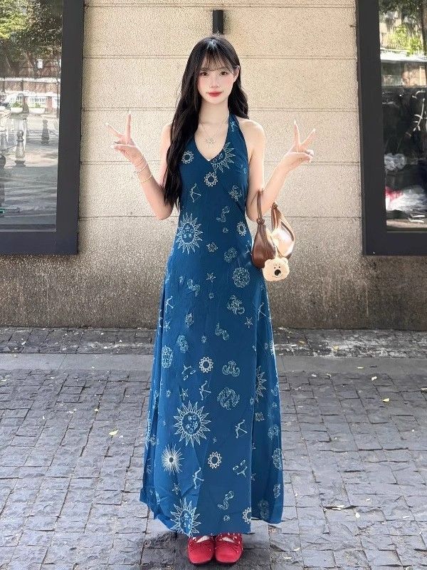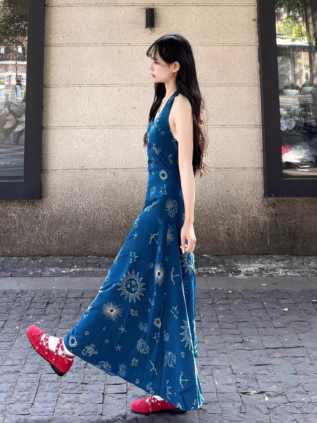 RY3340# 2026新款复古法式度假风蓝色v领挂脖背心连衣裙子女夏季收腰长裙