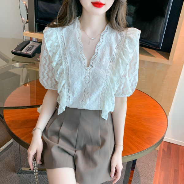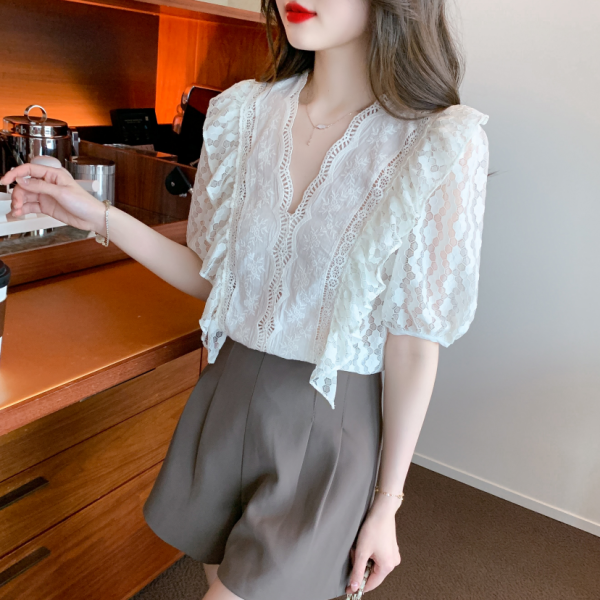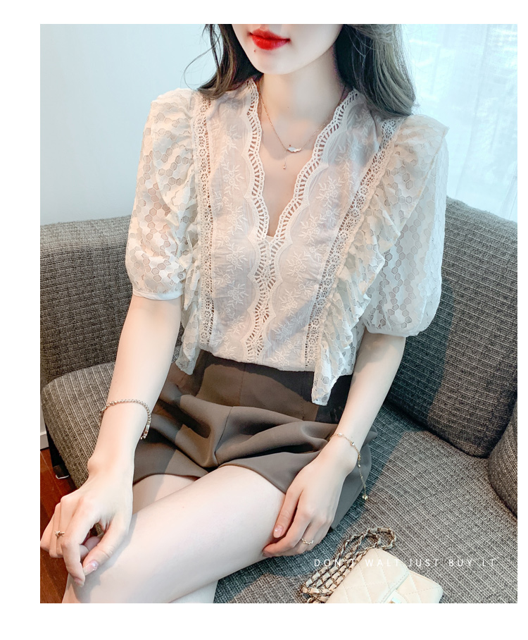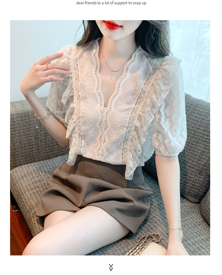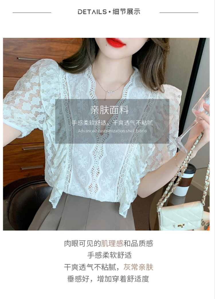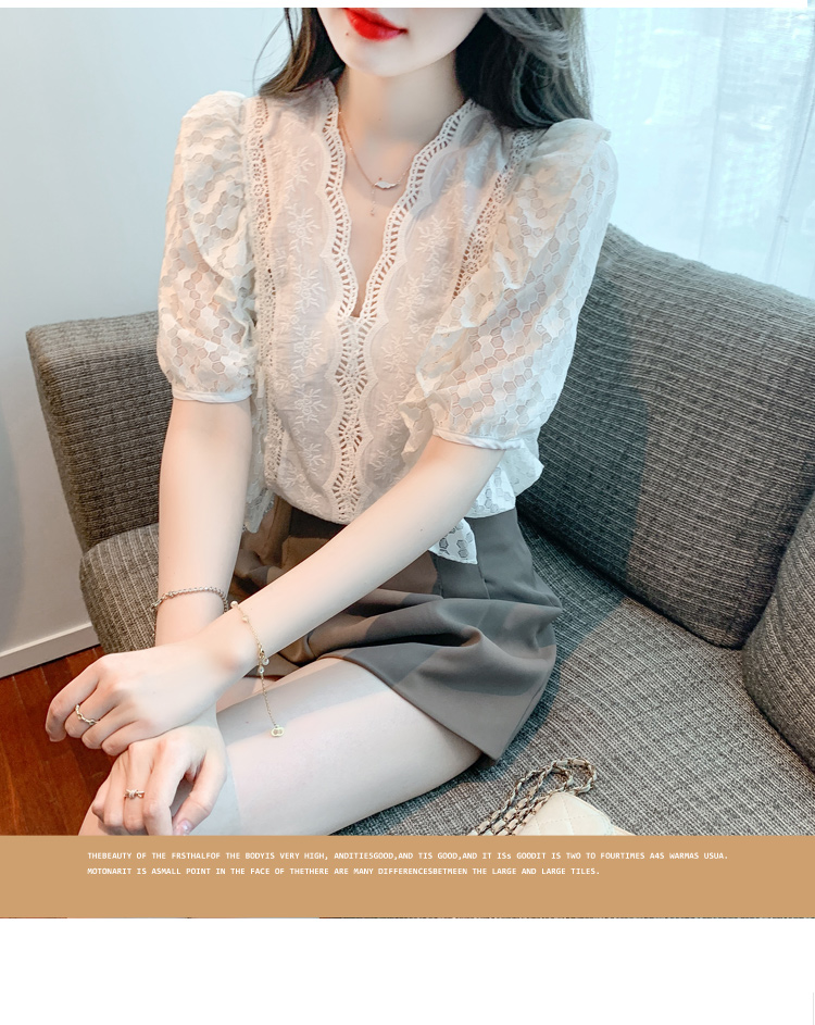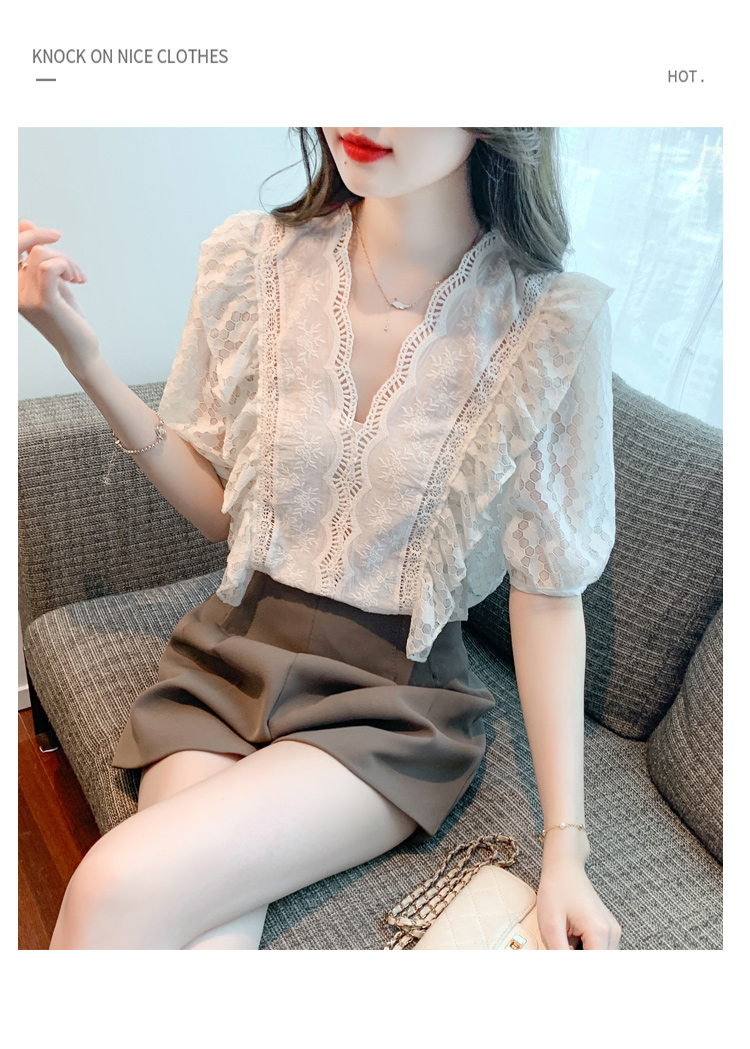 RM5570#夏季新款V领花边蕾丝衫雪纺衫超仙显瘦洋气短袖小衫女
