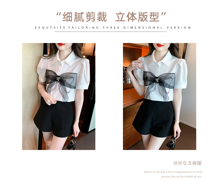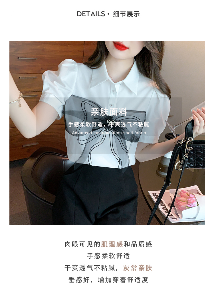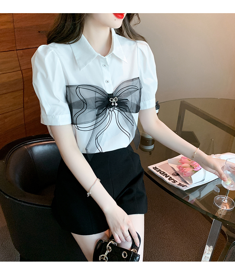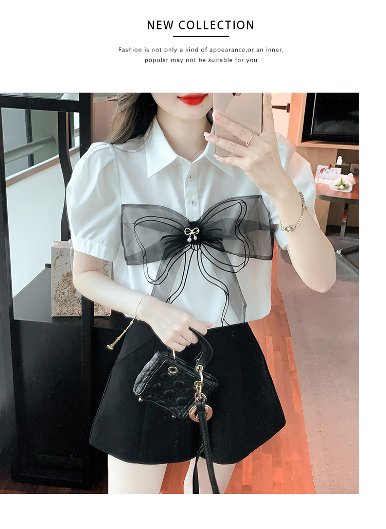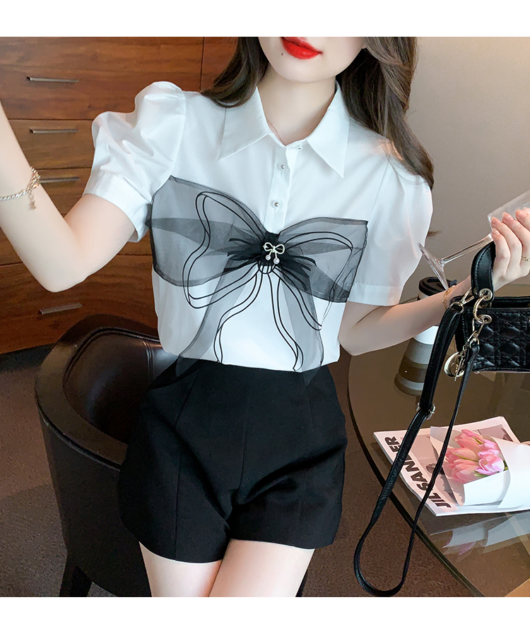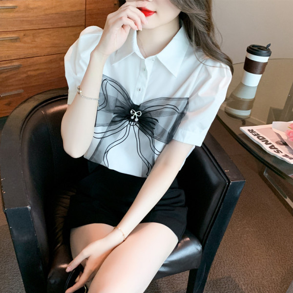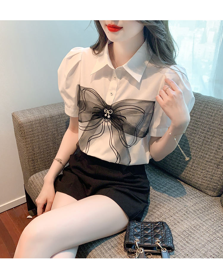 RM5628#夏季新款翻领蝴蝶结网纱拼接上衣女设计感小众百搭上衣
