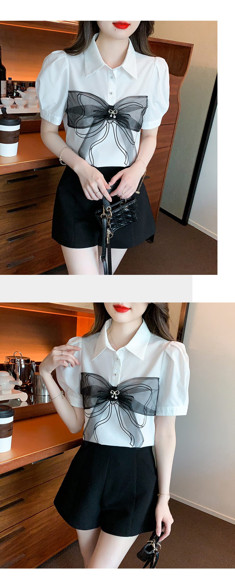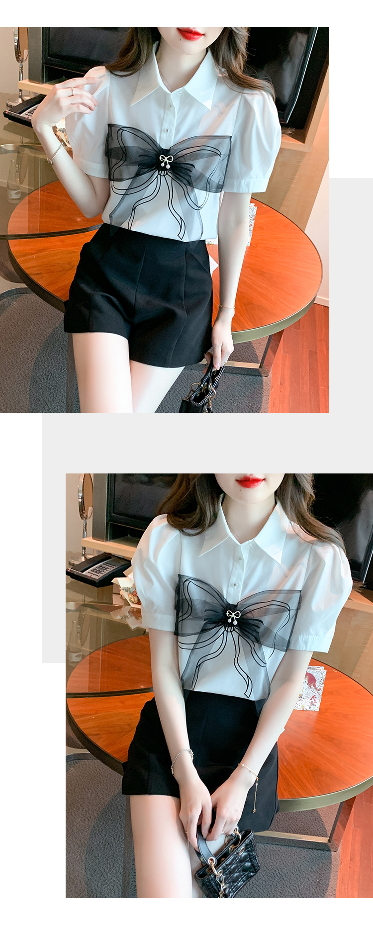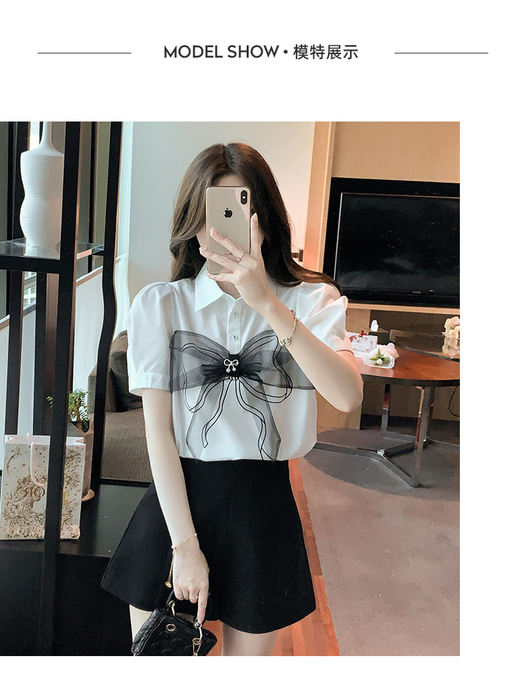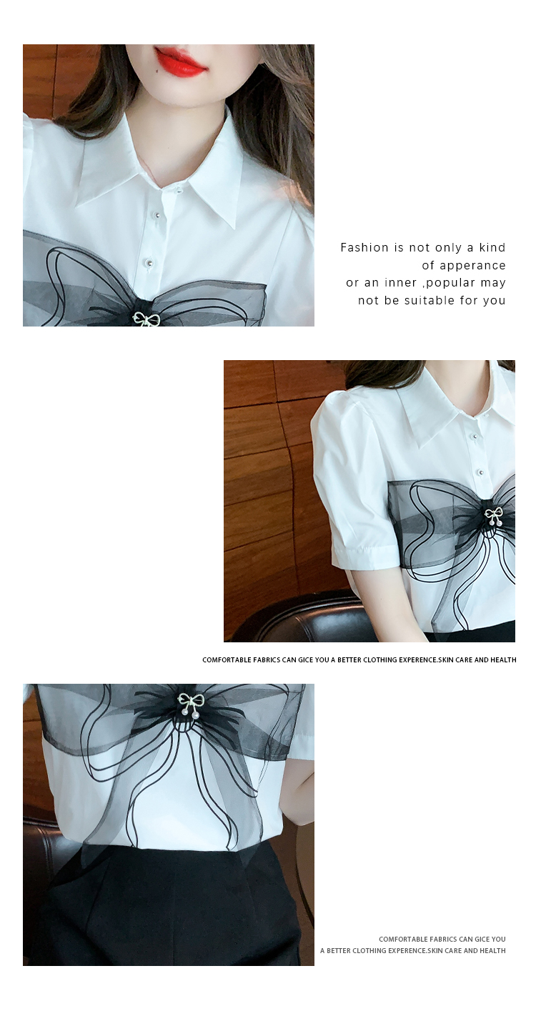 RM5628#夏季新款翻领蝴蝶结网纱拼接上衣女设计感小众百搭上衣